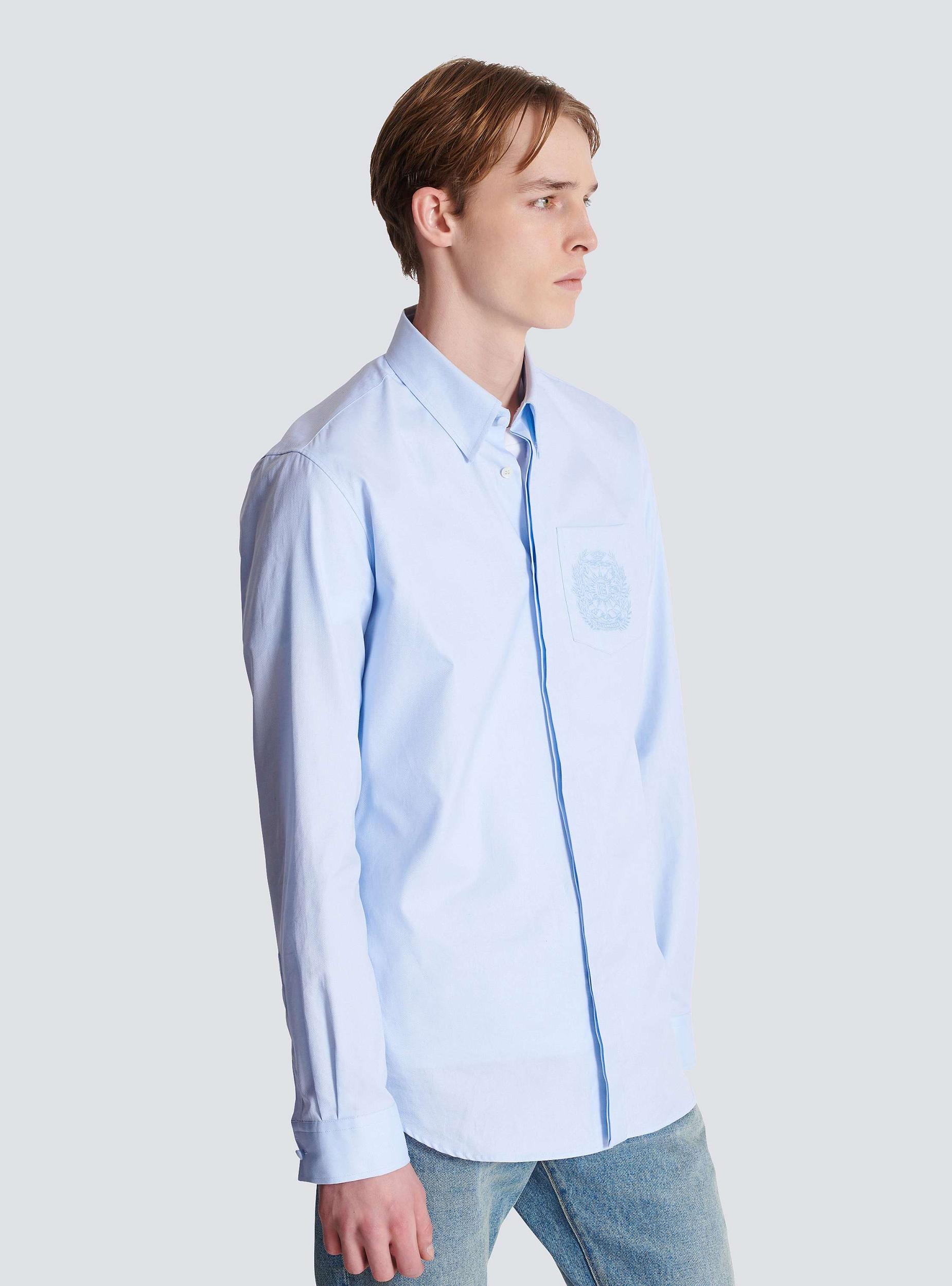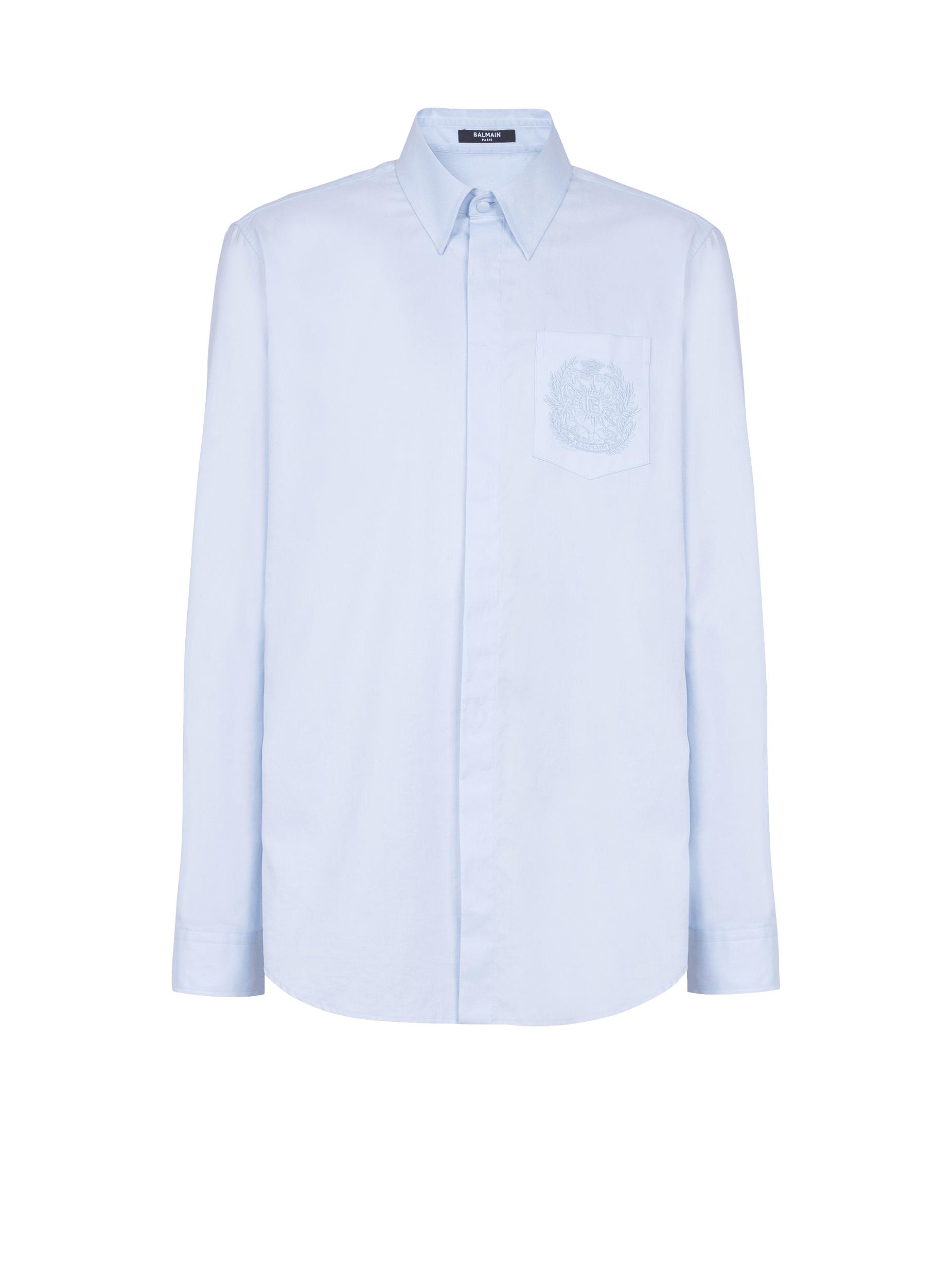 Balmain Écusson embroidered cotton shirtShirt collarLong sleevesStraight cuffs with 2 buttons1 patch pocket on the chestTone-on-tone Balmain Écusson embroidery on the chestFastening with 7 buttons (6 under the placket)Rounded hemStraight cutModel measures 190cm and wears a size 39Main material: 100% cottonMade in ItalyItem: FH1HS480CG19100% of the cotton fibres used to make this garment are certified and organically farmed