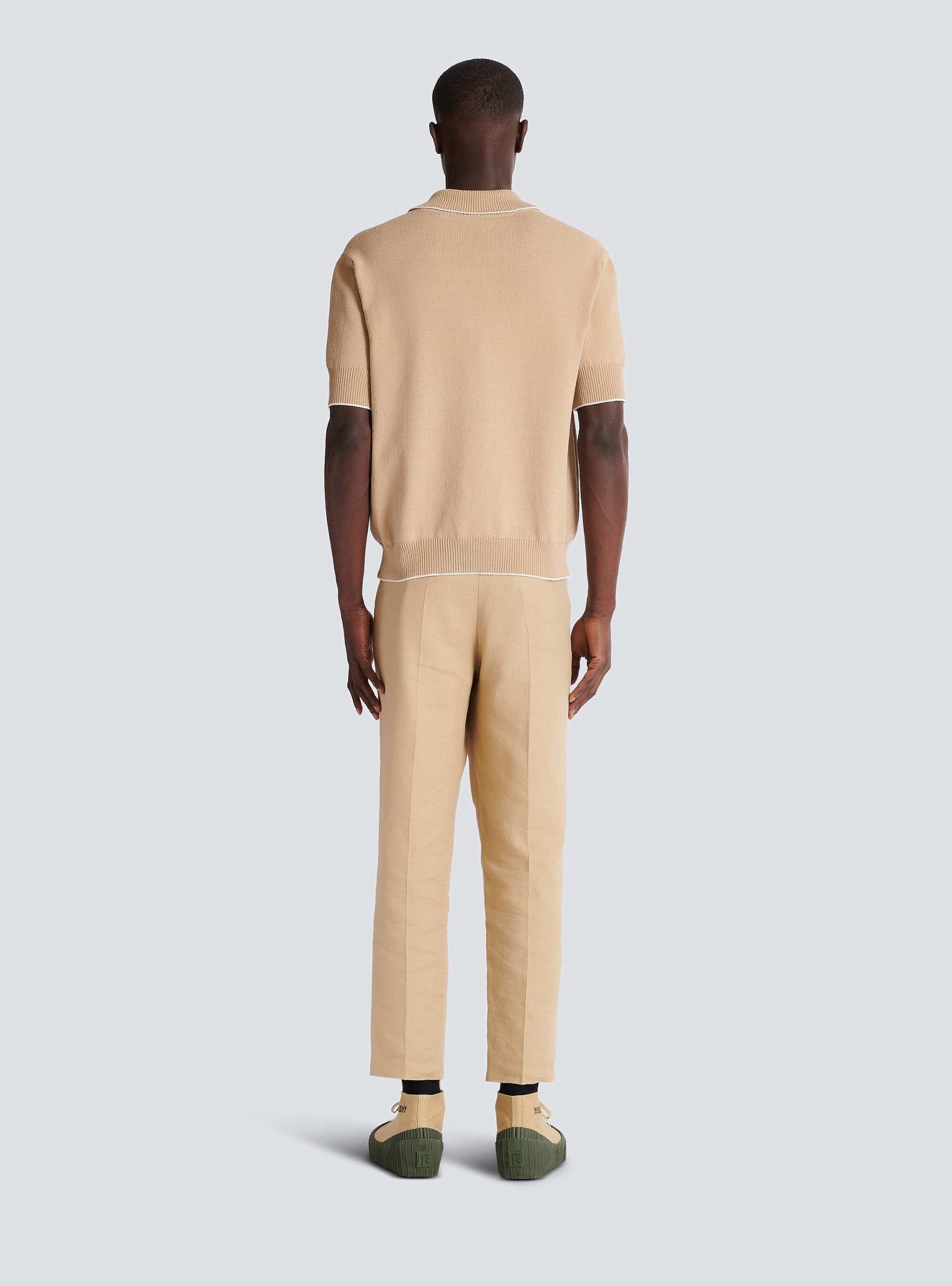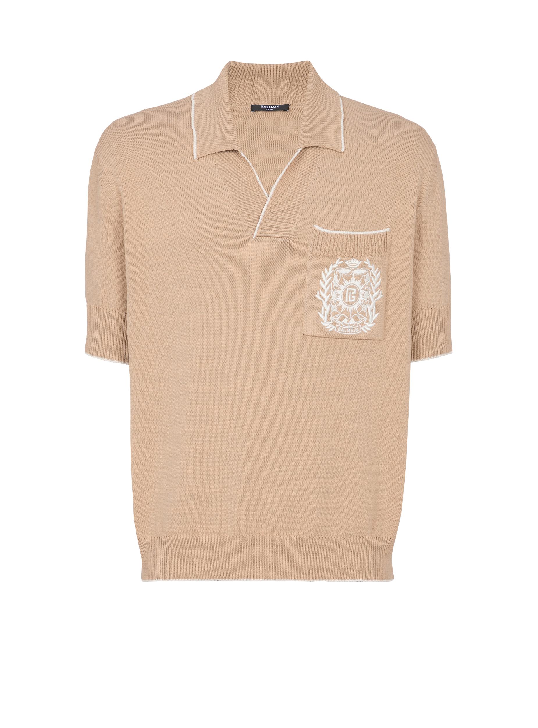 Balmain Écusson embroidered cotton knit polo shirtPolo collarShort sleevesPatch pocket on the chestBalmain Écusson embroidery on the chestRibbed trimRibbed trim with contrasting pipingRelaxed fitModel measures 190cm and wears a size MMain material: 44% cotton 44% lyocell 12% polyamideMade in FranceItem: FH1GB049KI76