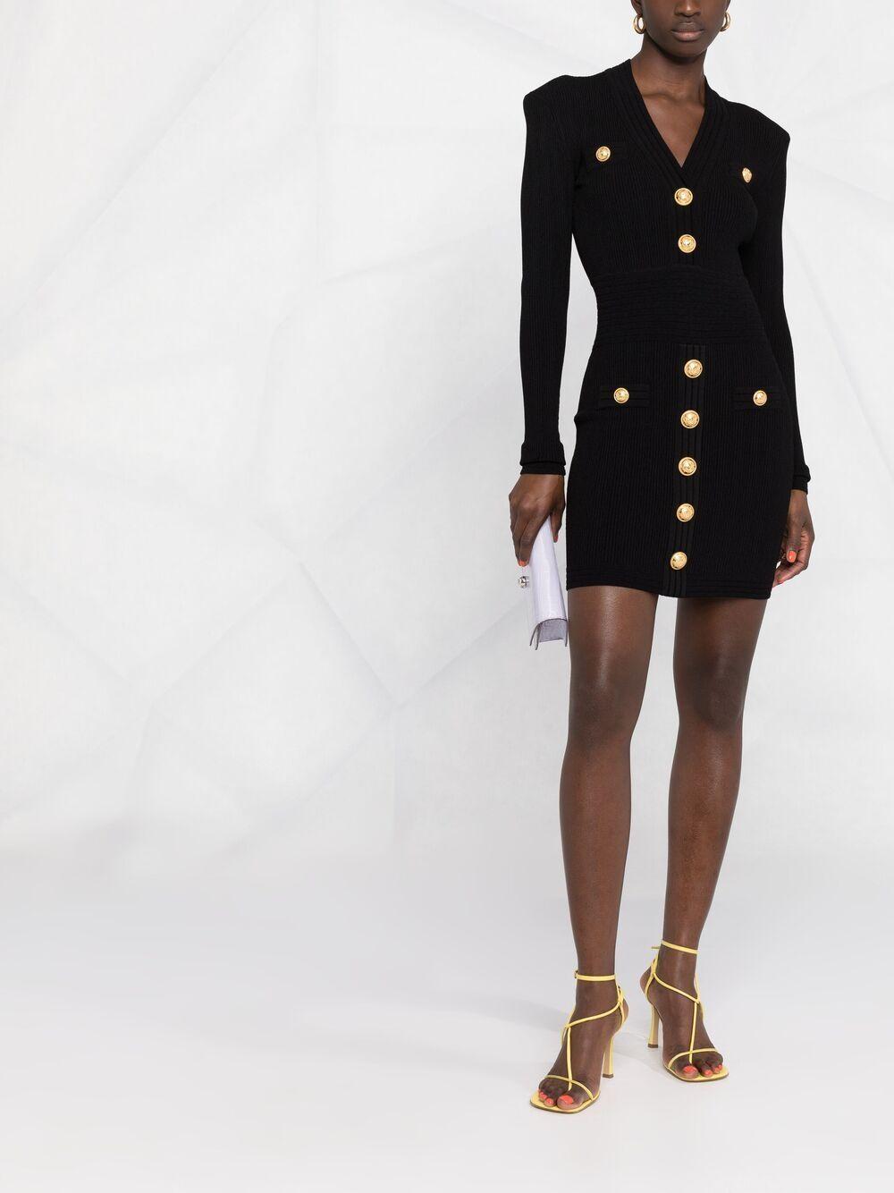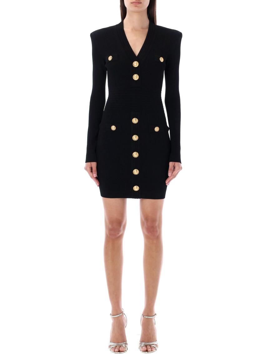 Shop Balmain Mini Black Dress With Golden Buttons In Stretch Viscose Woman In Opa Noir from 800+ stores, starting at $770. Ribbed knit dress with logo buttons, V-neck, padded shoulders, long sleeves, back zip closure. Colours: Black Composition: 83% viscose, 17% polyester Dimension: True to size fitFrench size MPN: DF1R8059KB070PA