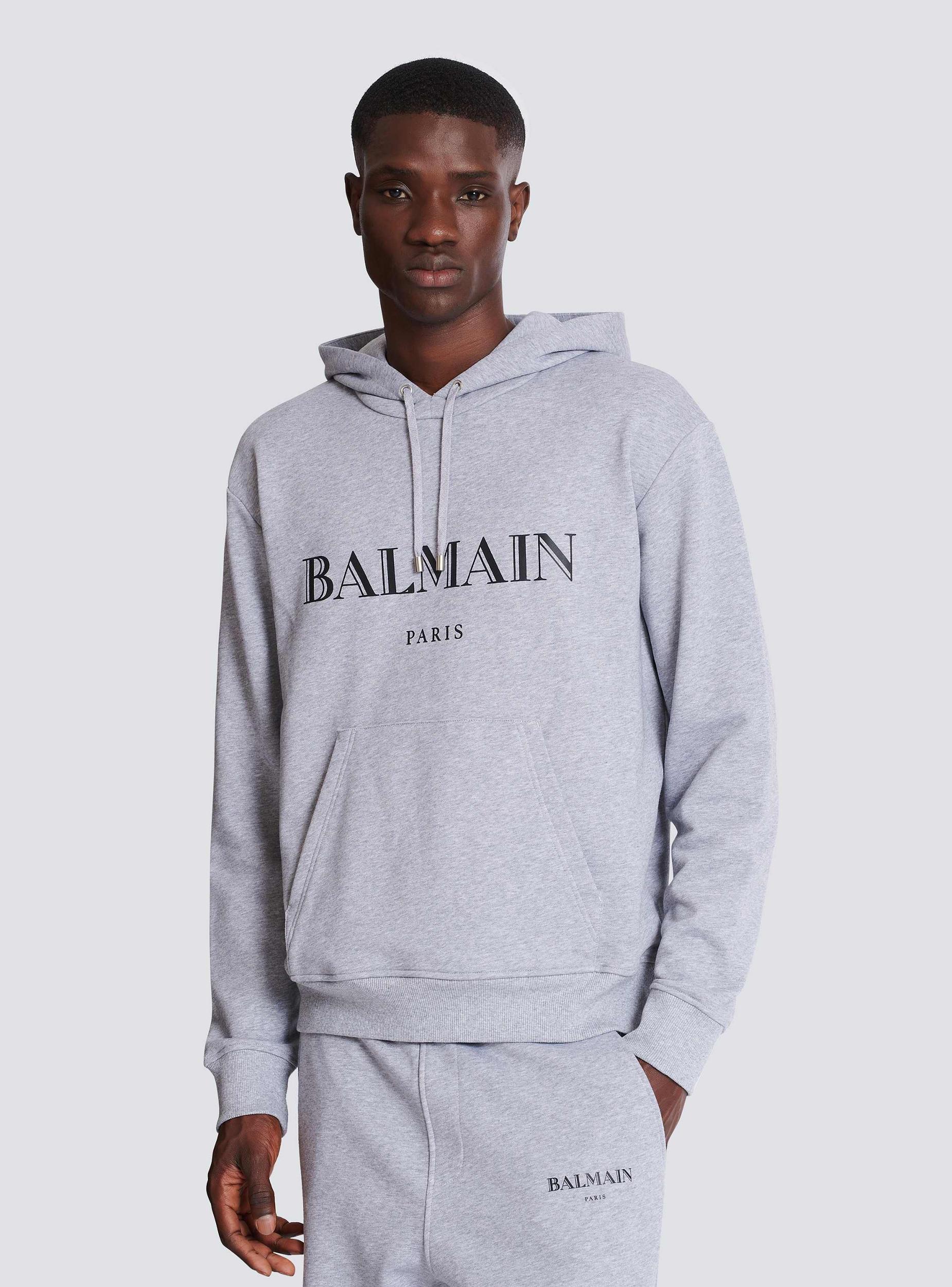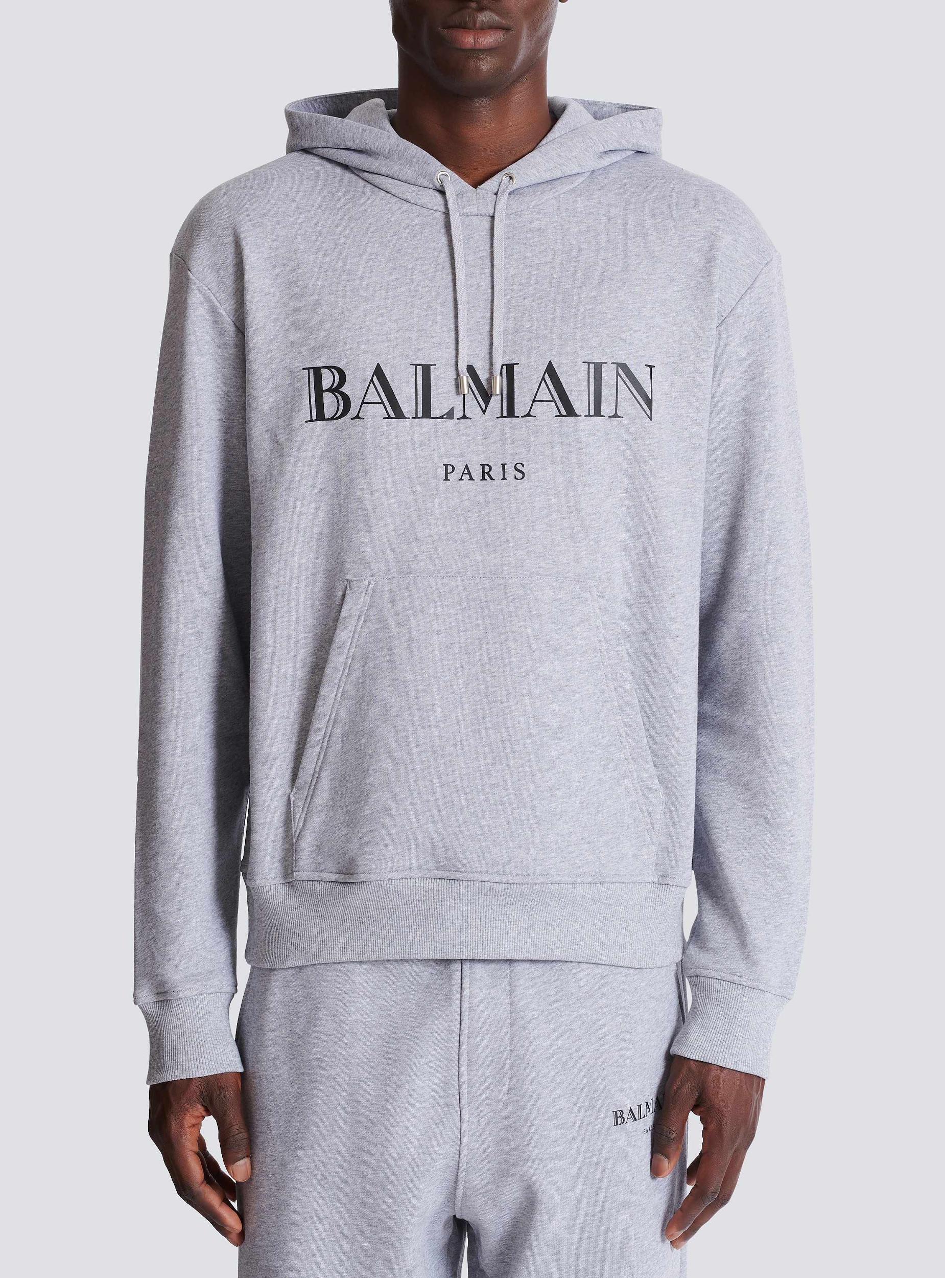 Balmain printed hoodieRelaxed fitRound neckDrawstring hoodLong sleevesVintage Balmain logo printed on the frontKangaroo pocketEngraved silver aglets, eyelets and stoppersRibbed edgingModel measures 190cm and wears a size MMain material: 100% cottonMade in PortugalItem: FH2JR090BD33