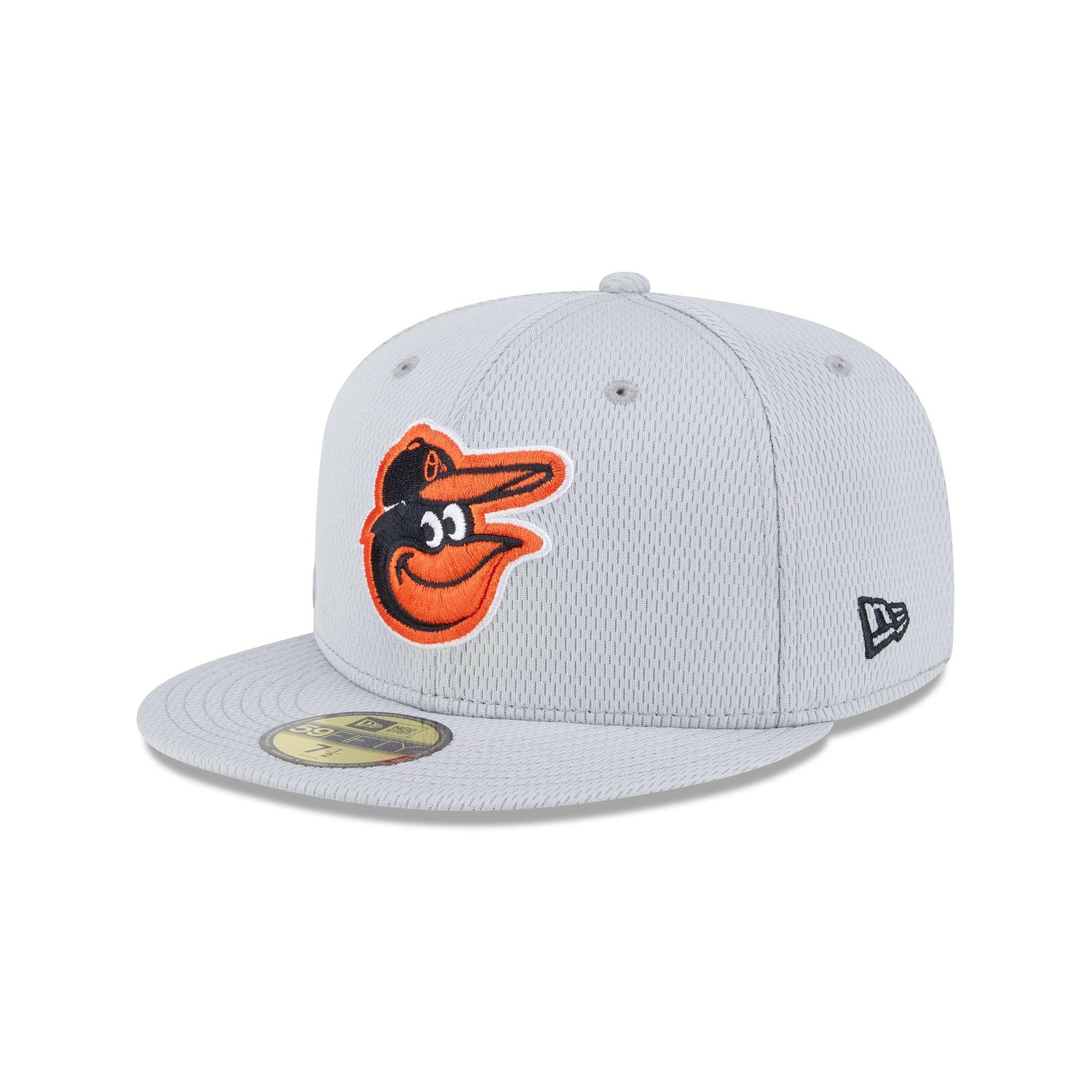 The Baltimore Orioles 2025 Clubhouse Gray F9FIFTY Fitted Cap features an embroidered Orioles logo at the front panels with a matching MLB Batterman logo at the rear and a dashmark mesh fabrication throughout. Additional details include a silicone team tag on the right-wear side and team logo on the undervisor.
