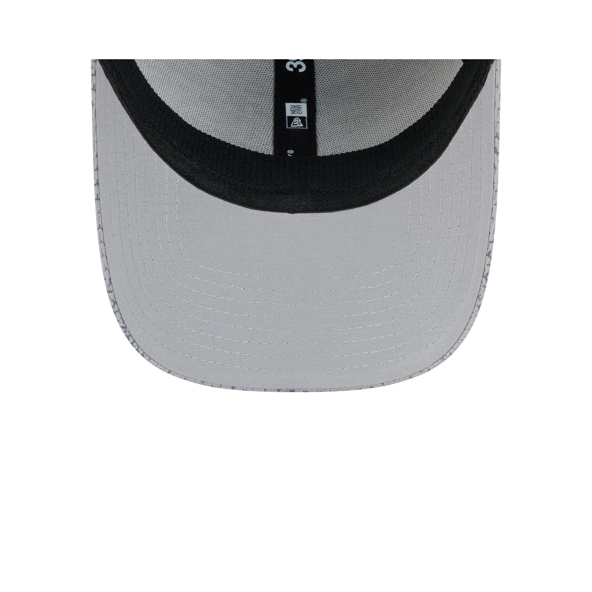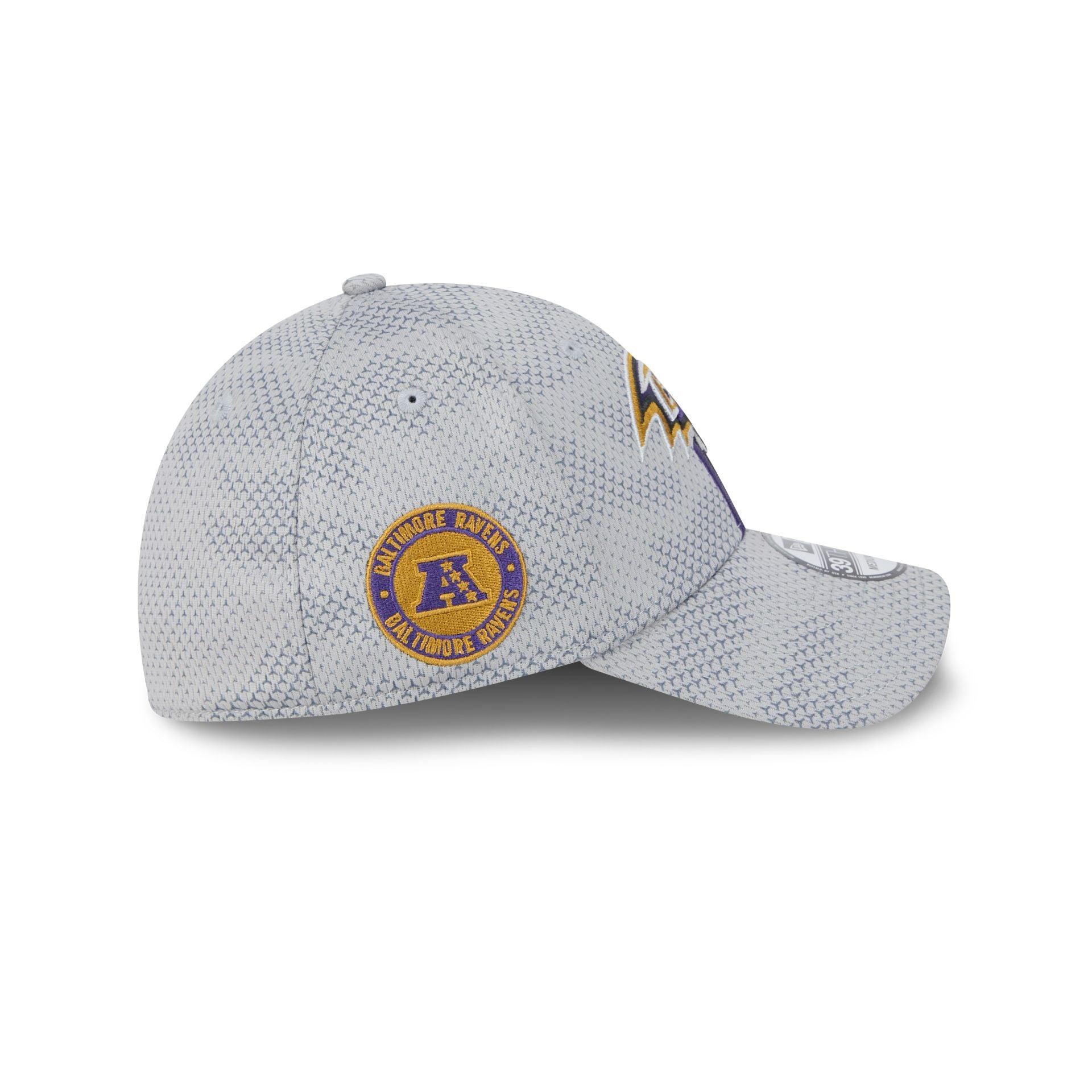 The Baltimore Ravens 2024 Sideline 39THIRTY Stretch Fit Hat features an embroidered Ravens logo at the front panels with a matching NFL Shield at the rear. Additional details include a Conference patch at the right-wear side and a gray undervisor.