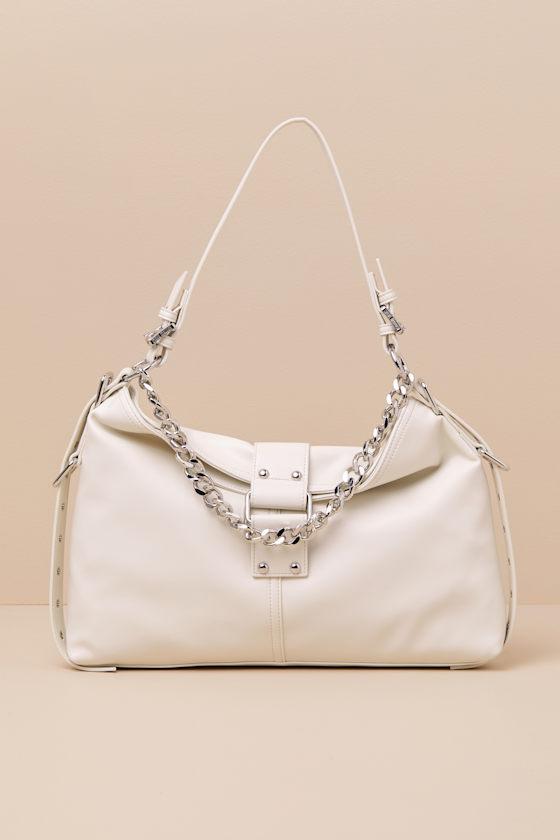 What's in your bag? Oh, just about everything a girl could need, thanks to the Steve Madden Balyssab handbag that offers an oversized, slouchy silhouette with a flat bottom design and an adjustable, removable shoulder strap with silver grommets. Matching adjustable straps accent the sides for a cinched effect, while a chunky silver chain creates an edgy aesthetic. Undo the magnetic strap closure to reveal a spacious interior with a zipper pocket, perfect for organizing anything from your current read to your must-have lip combo.