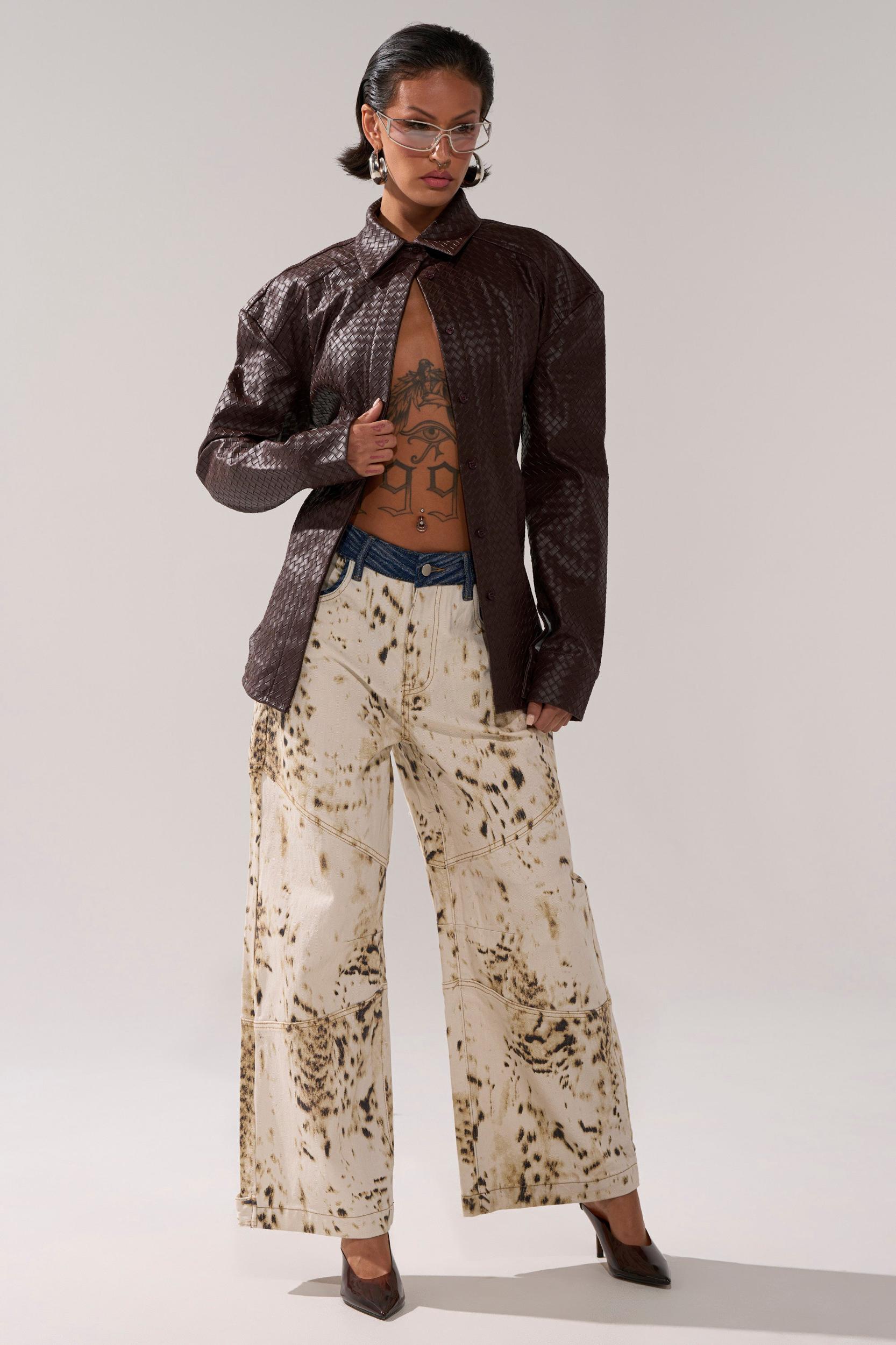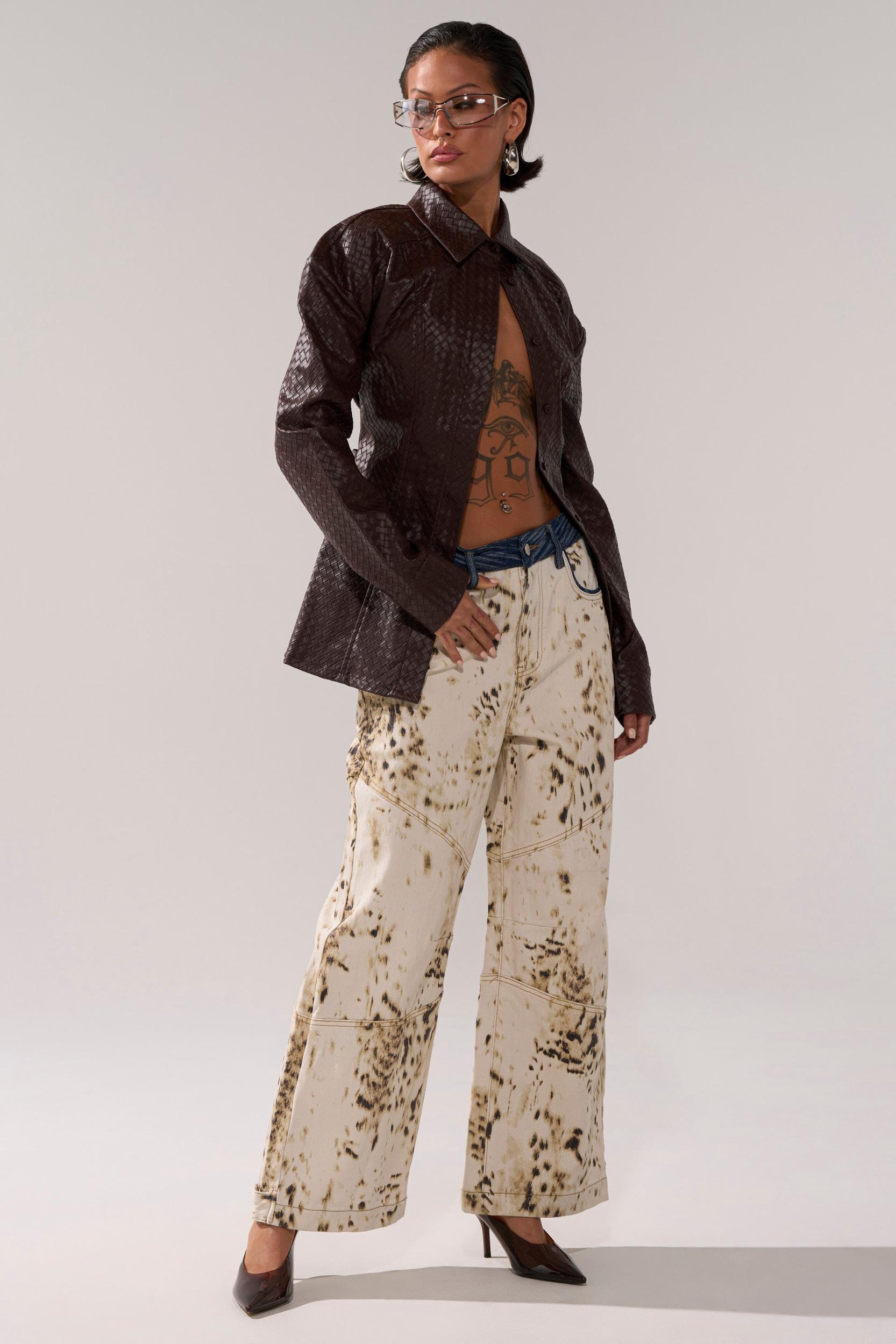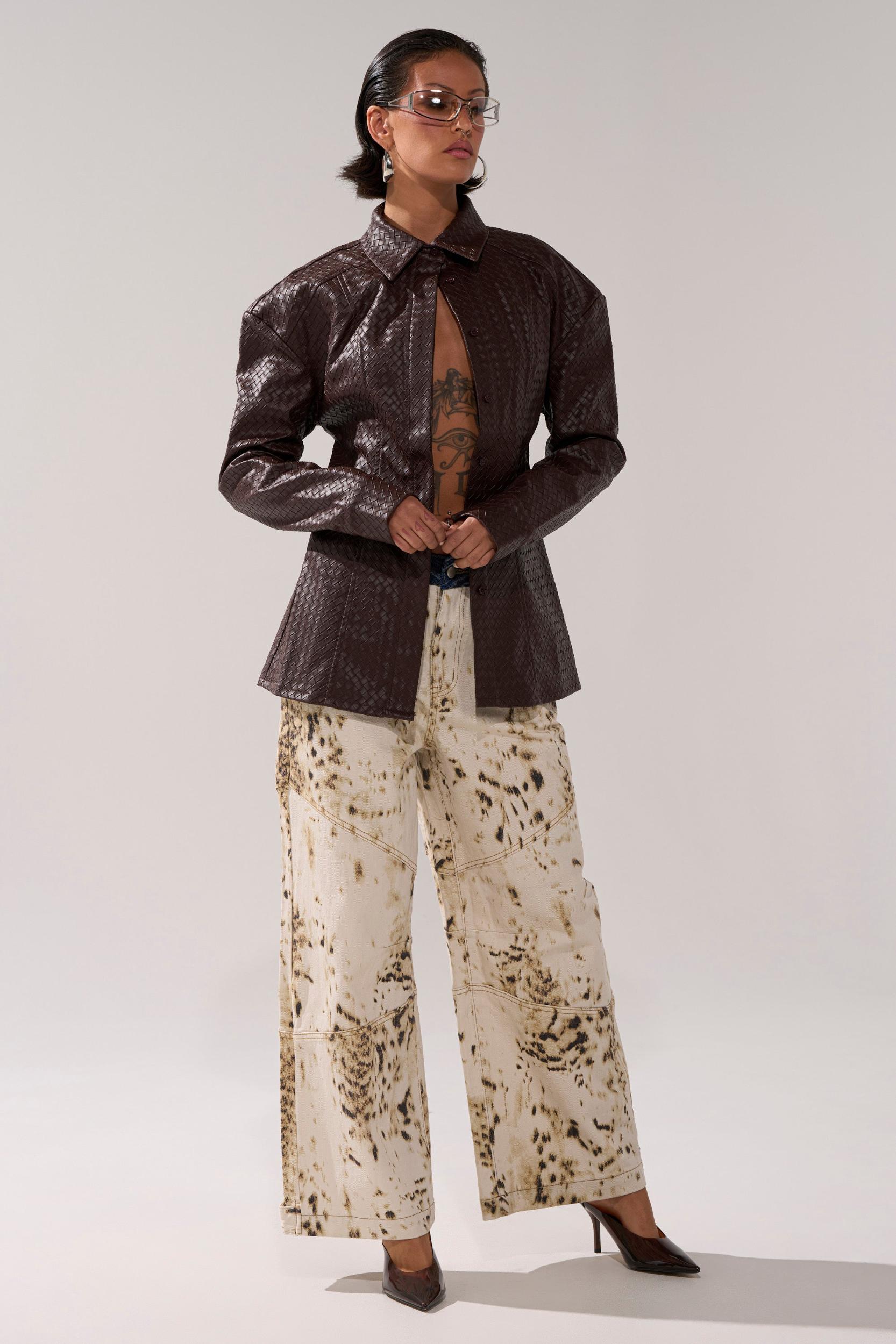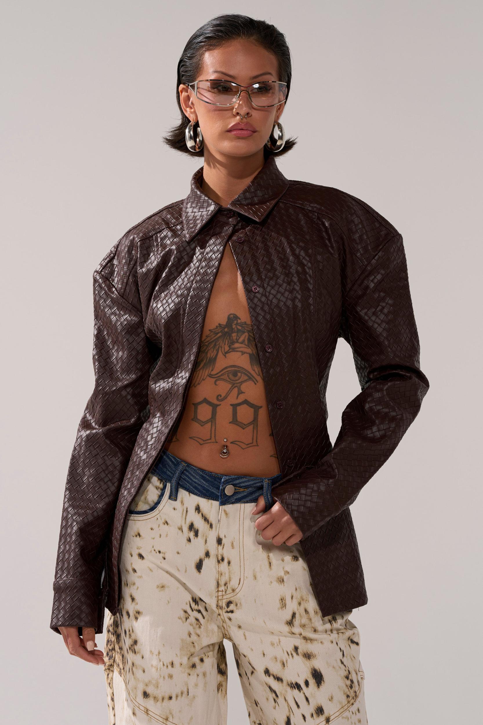 Wear your wealth with The AKIRA Label Feeling Rich Faux Leather Button Down. Crafted from sleek faux leather, this sophisticated top features a woven texture throughout, a pointed collar, contour paneling, long sleeves with button cuffs, a concealed front panel of button closures, and an adjustable silver-tone buckled belt on the lower back for a cinched look. Complete with a flattering, curve-hugging fit. Try pairing with flared trousers or a satin maxi skirt to flaunt your stuff. - 60% PU 40% Polyester- Spot Clean Only- No Stretch- Imported (all measurements approximate from small)- 27” Shoulder to Hem- 20” Shoulder to Shoulder- 23” SleevesProduct ID: 1062227 (all measurements approximate from 1X)- 31” Shoulder to Hem- 23” Shoulder to Shoulder- 25” SleevesProduct ID: 1062231
