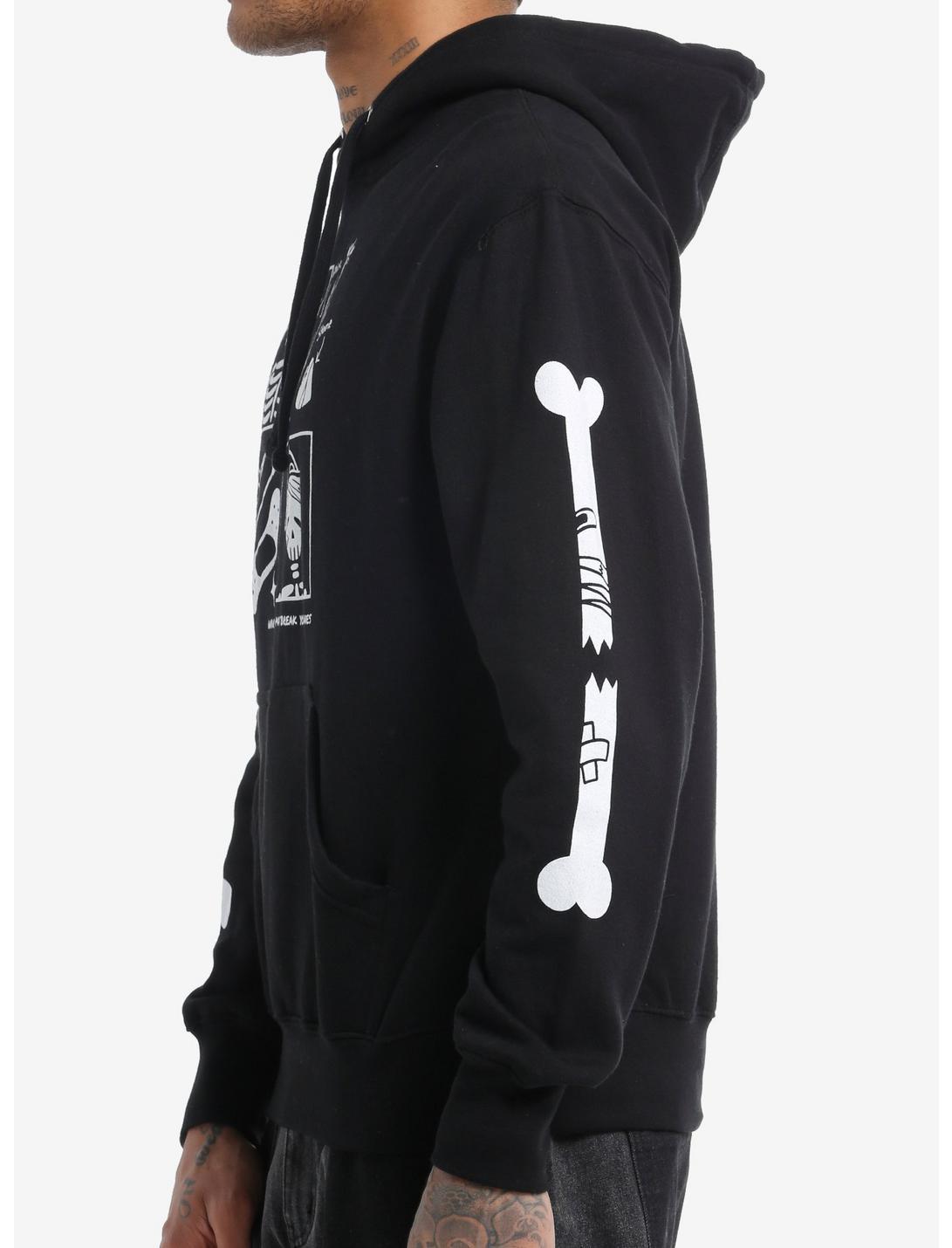 Add this bone-rattling Bandage Brigade hoodie to your rotation. It features a grid showing a waving skeleton, sticks, stones, bandages and a beat-up skeleton. The "Warning: May Break Your Bones" text below ties it all together. Drawstring hood and kangaroo pocket.80% cotton; 20% polyesterWash cold; dry lowImportedListed in men's/unisex sizesModel is 6'1"Model wears size Medium