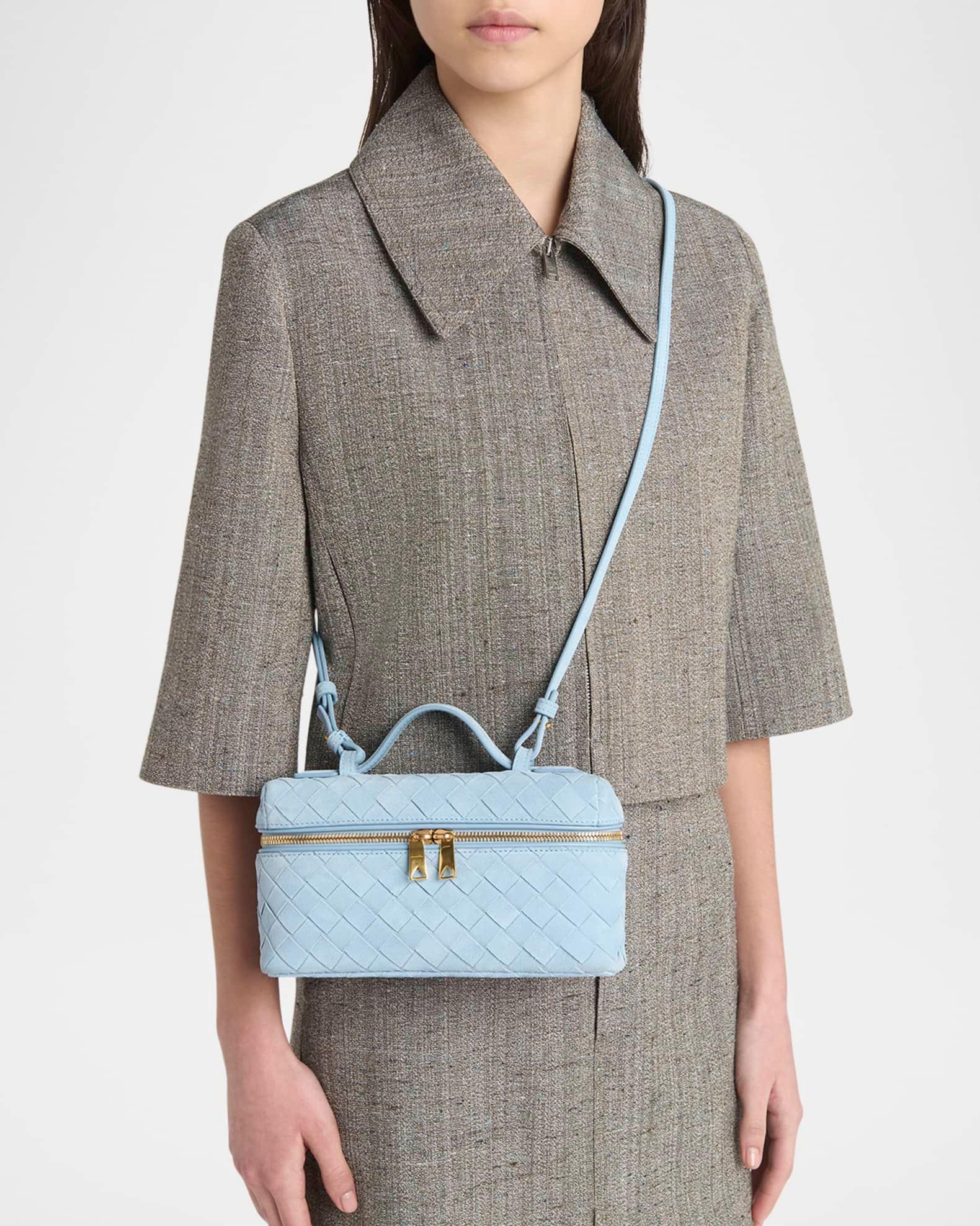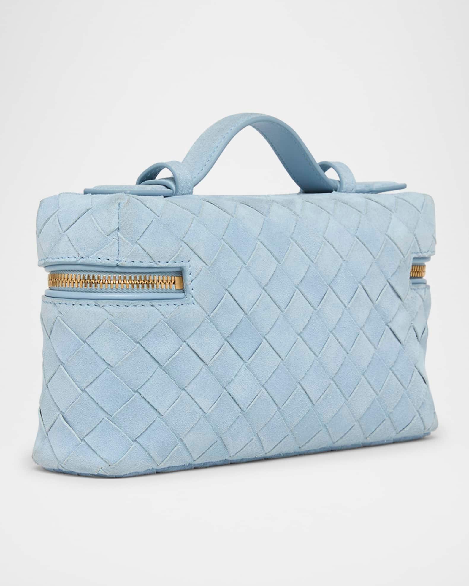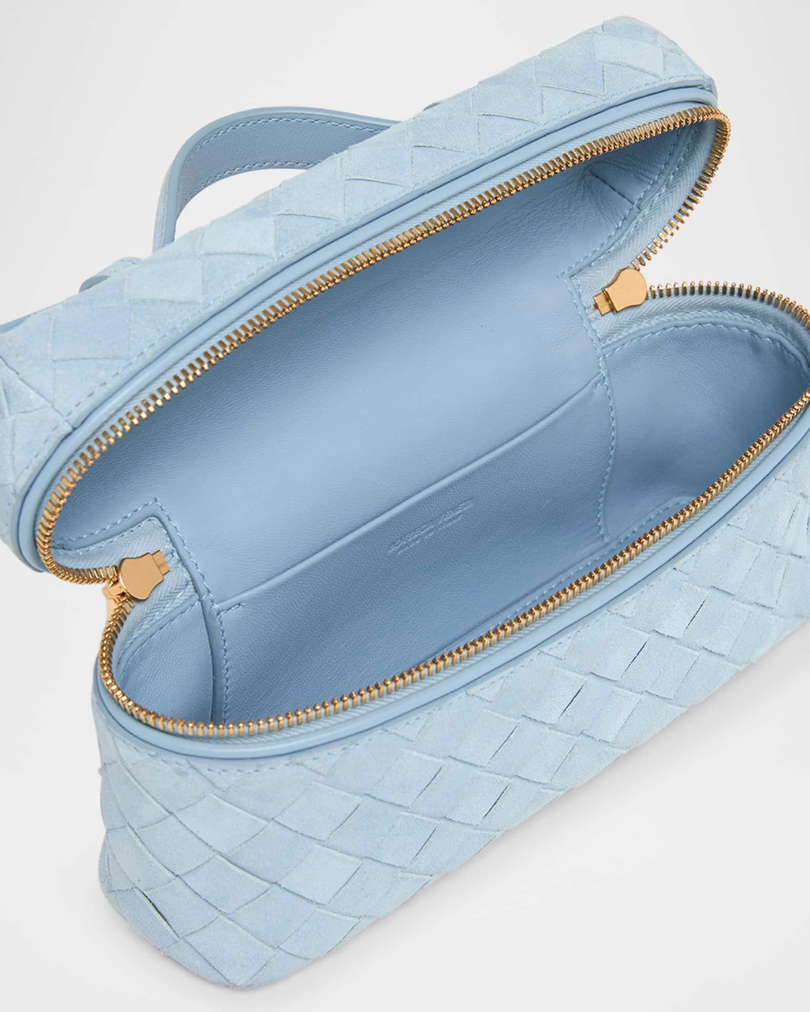 Bottega Veneta "Bang Bang" mini vanity case in intrecciato suede Top handle, 1.8" drop Detachable, adjustable shoulder strap, 17.7" drop Two-way zip top closure Interior, one slip pocket Lining: Leather Approx. 4.9"H x 8.7"W x 2"D Made in Italy