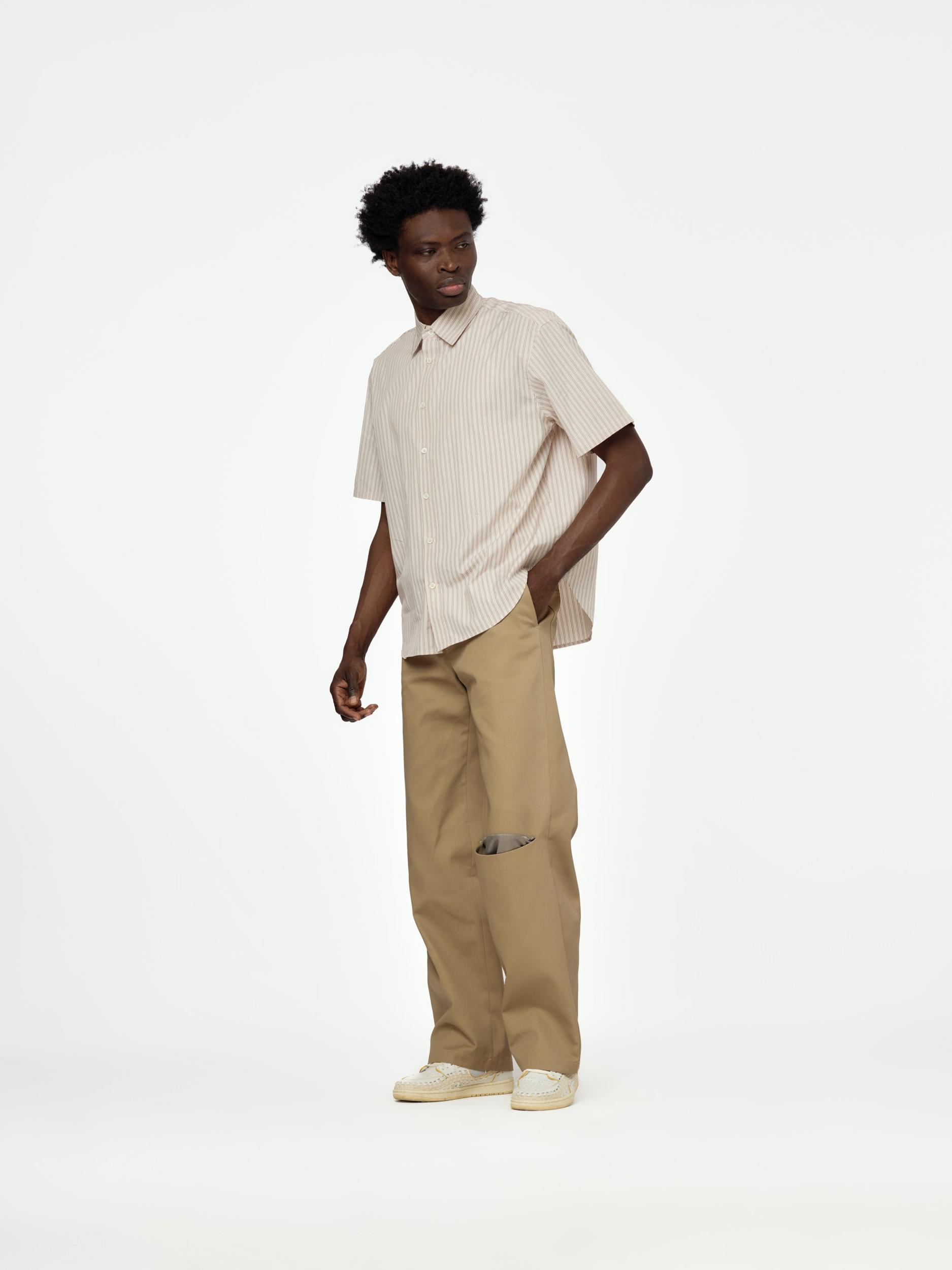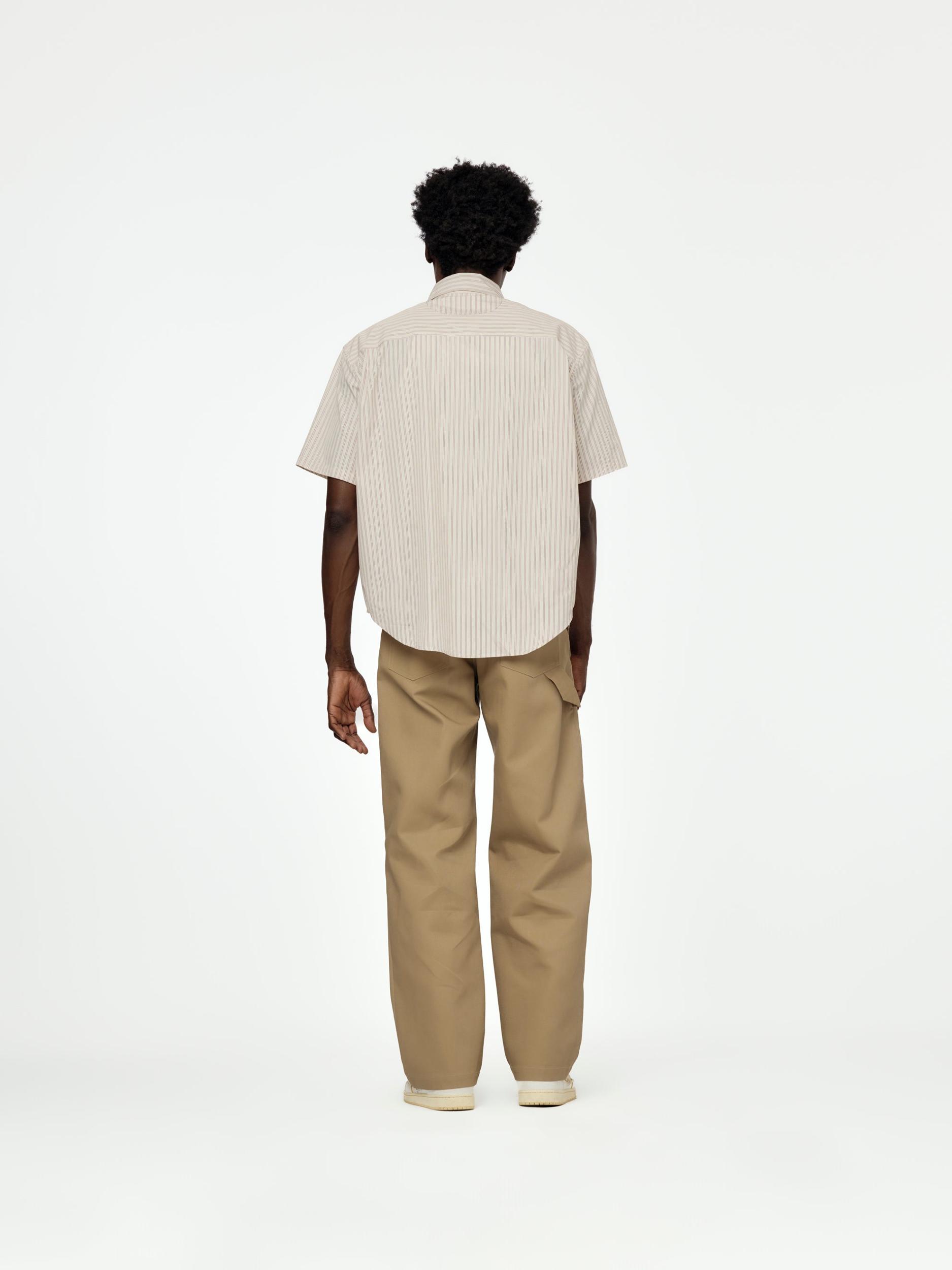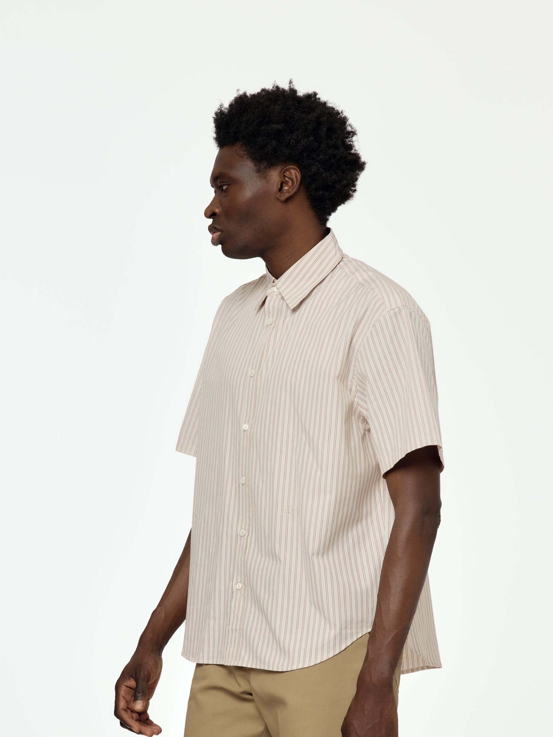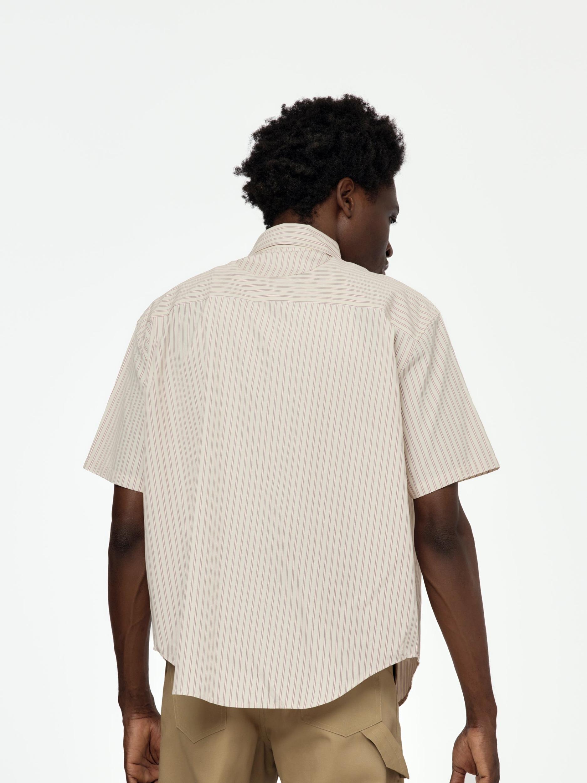 Short sleeve stripe shirt. Classic silhouette. Front button closure. Tonal embroidered logo. 100% Cotton Model is 6'2 wearing a size Lage. Made in Italy