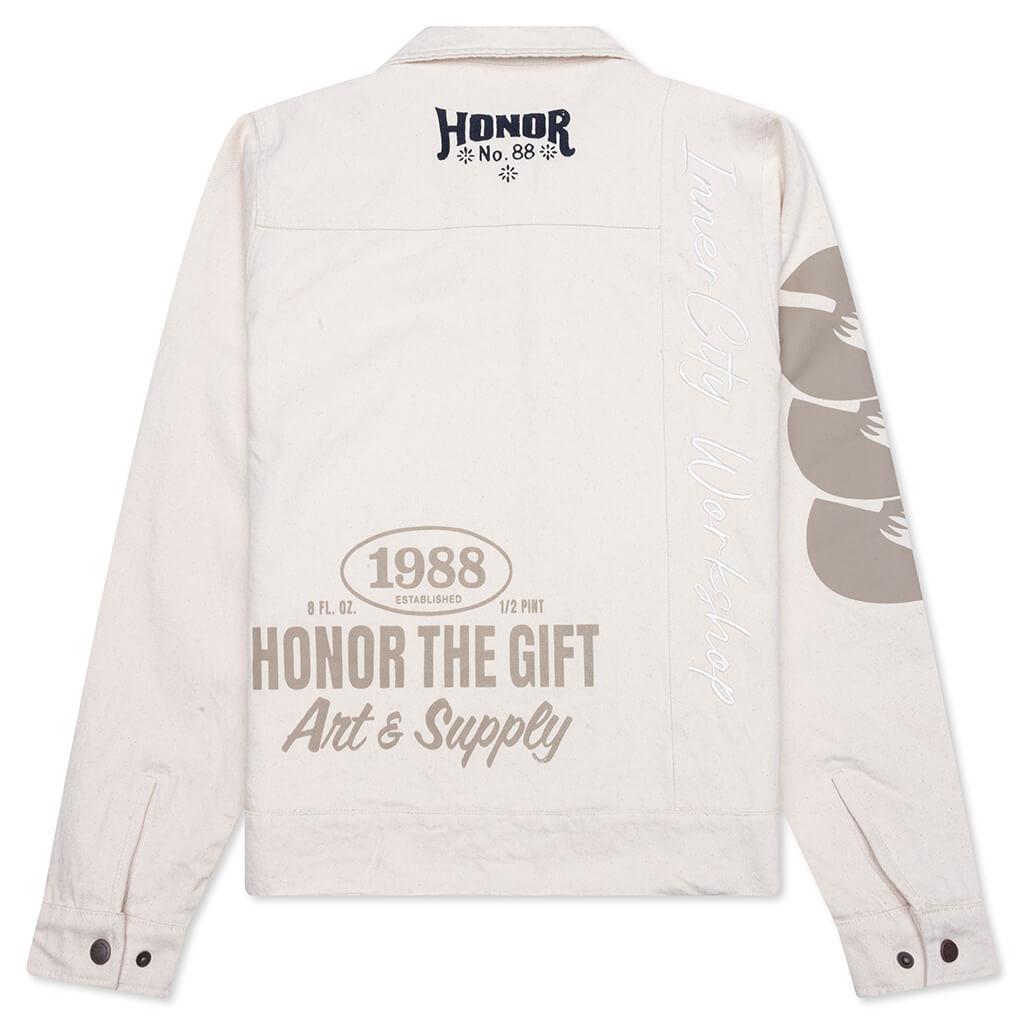 Honor the Gift presents an elevated take on classic workwear with the Banner Jacket. Constructed from cotton with soft lining, it provides durability and comfort meant to withstand long-term wear. Functional details include a zipper front closure, side-entry pockets, and adjustable cuffs. The jacket is decorated with embroidered and screen-printed graphics for bold personality. 100% Cotton Soft lining Point collar Zipper front closure Side-entry pockets Adjustable cuffs Embroidered and screen-printed graphics Style No: HTG250362-NAT HTG250362 NATU