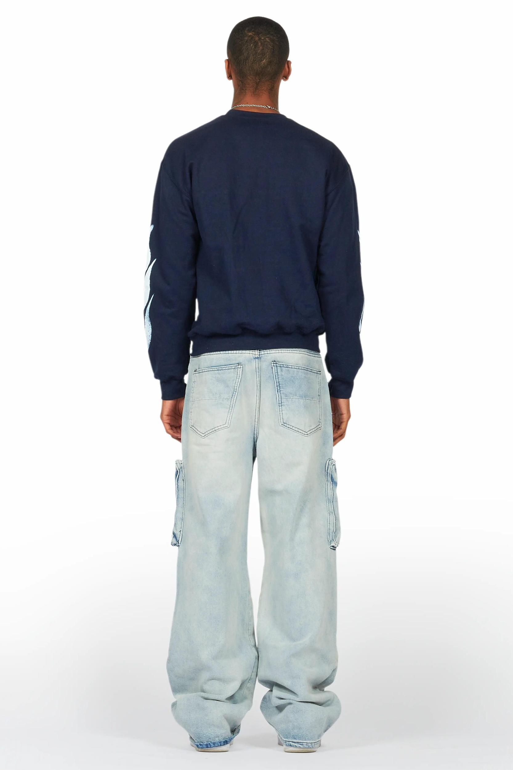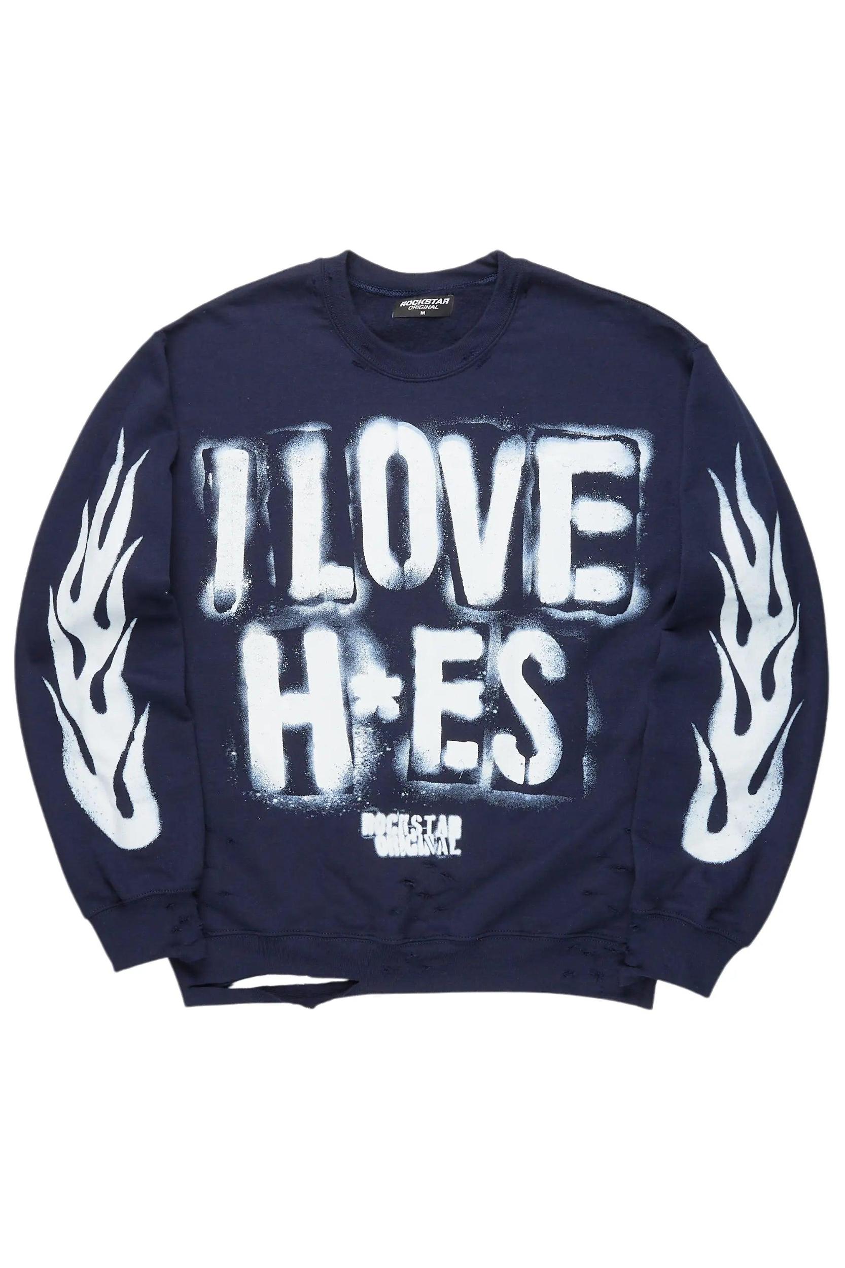 An urban streetwear crewneck sweatshirt for men in navy. Designed with organic cotton and custom detailing for a dope everyday style. Crew neckline Long sleeves Ribbed knit trims Pullover style Relaxed-fit Printed RSO logo Custom printed graphics
