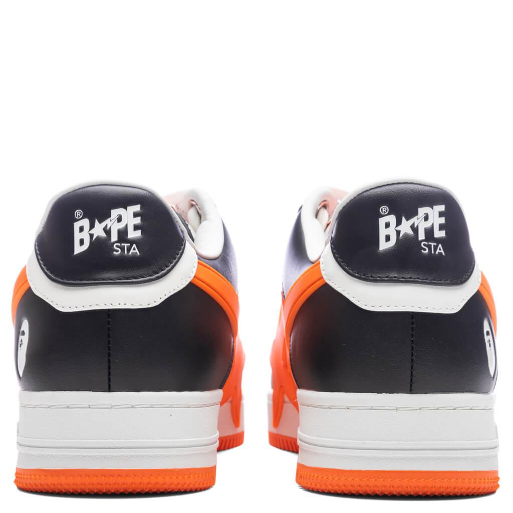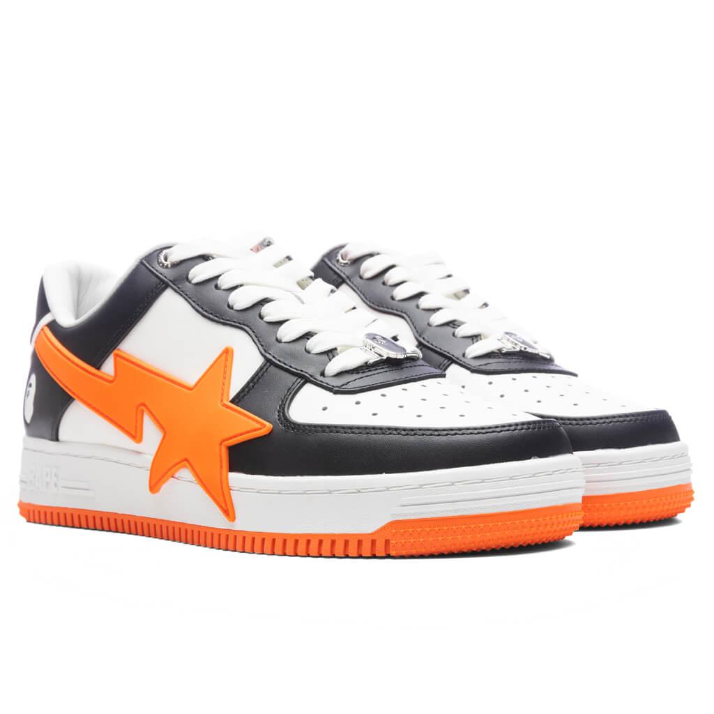 The Bape Sta OS #2 M2 in White, Black and Orange from A Bathing Ape. This iconic sneaker features a perforated toe box for a stylish and breathable design. The lace-up closure is accented with logo hardware, while the padded tongue boasts a prominent logo patch. Comfort is ensured with a padded collar and a padded mesh footbed. The signature logo appliqué sits on the sides and extends onto the midsole, and a logo is embossed on the heel tab. Logo hardware at lace-up closure Logo patch at padded tongue Padded collar Logo appliqué at sides Logo embossed at heel tab Padded mesh footbed Buffed leather lining Style No: 001FWK701309M-BLK
