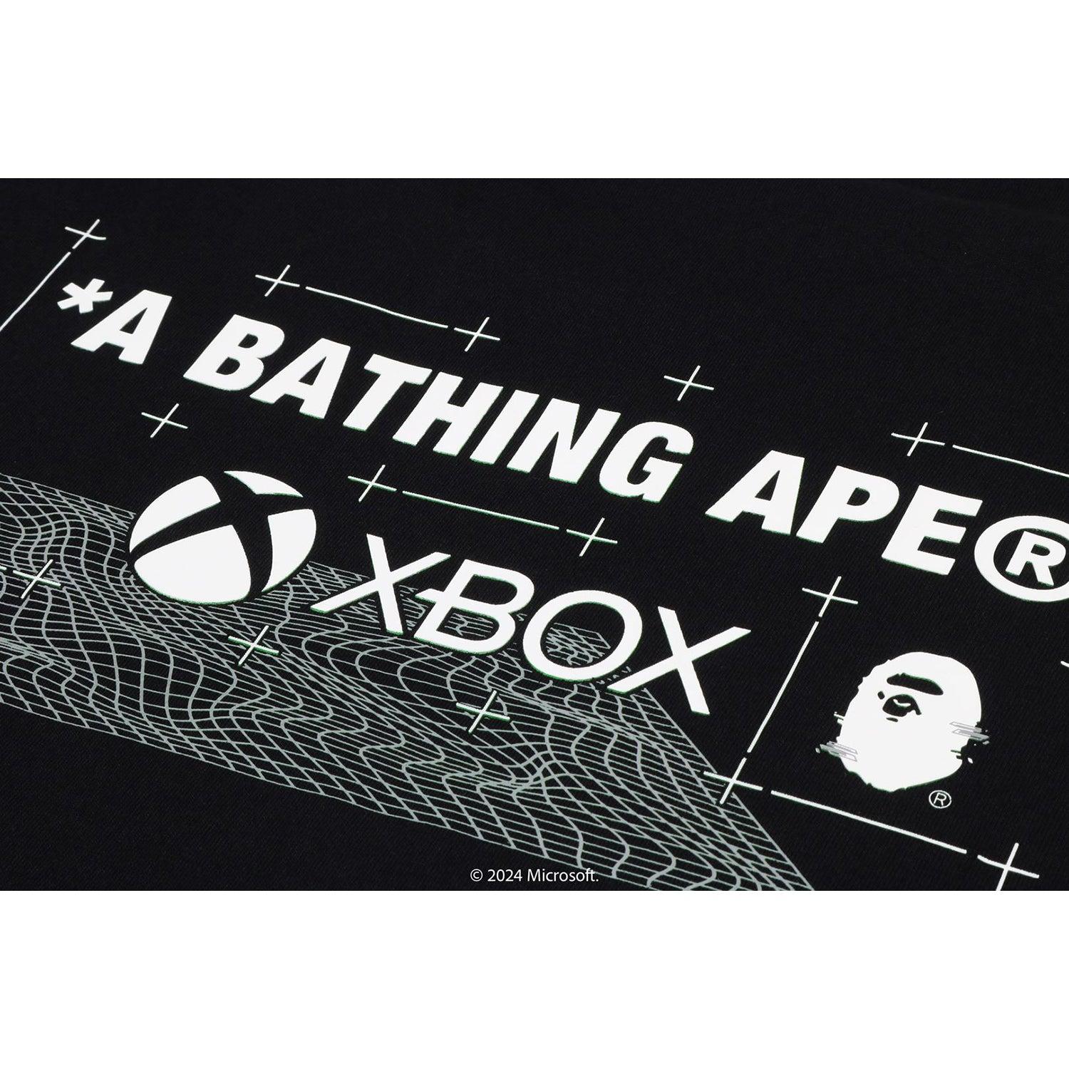This BAPE x XBOX camo hoodie features a cotton fleece zip-up design with a unique layered APE HEAD and XBOX logo print. It includes a removable smartphone pocket, a silicone logo tag, and a muff pocket for convenience. The regular fit offers comfortable wear, blending style with practical details in this special collaboration with XBOX.