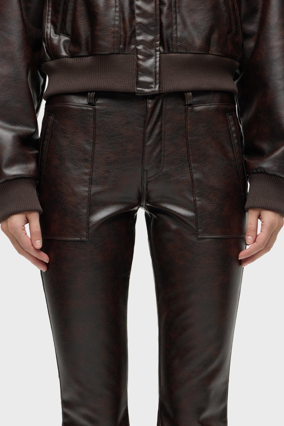 Description Streamlined and flattering, our Barbara High-Rise Bootcut Jean w/ Welt Patch Pockets in Marbled Vegan Leather is cut for a slim, contoured fit with an elevated waistline and a gently flared leg. Made from vegan leather with a marbled finish, it’s complete with welt patch pockets for added detail. Product Details Front Rise:10.25", Leg Opening: 19", Inseam: 34.5"Model Height 5'9"Model wearing size 25Measurements based on size 27 Fit & Care Content: 100% Polyurethane Back: 100% PolyesterMachine wash cold with like colorsDo not bleachTumble dry low or hang to dry