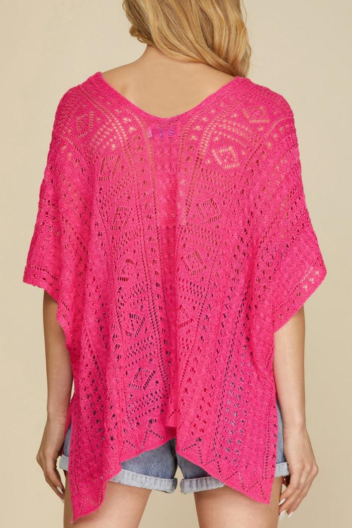 Pretty in Pink! Loose weave poncho top. V-neck. Scalloped hem. Side split detail. Layer over your favorite tank! One Size. Refer to measurements for your perfect fit. Across chest measurements; 29". Shoulder to front hem; 27".
