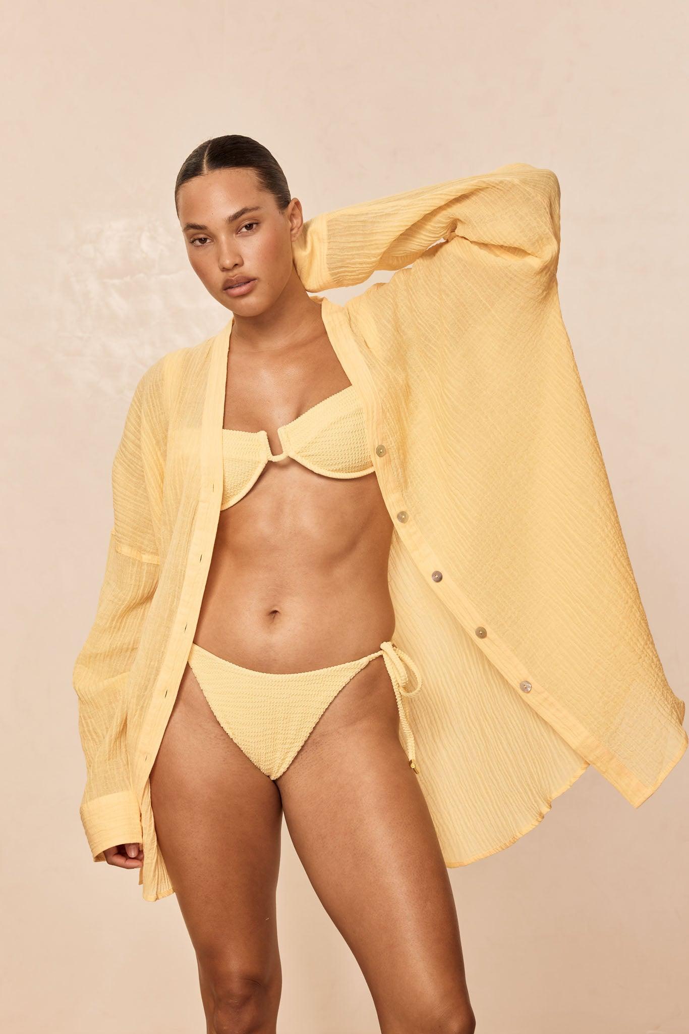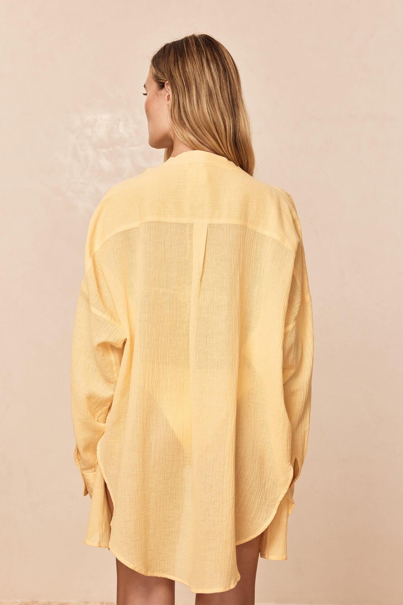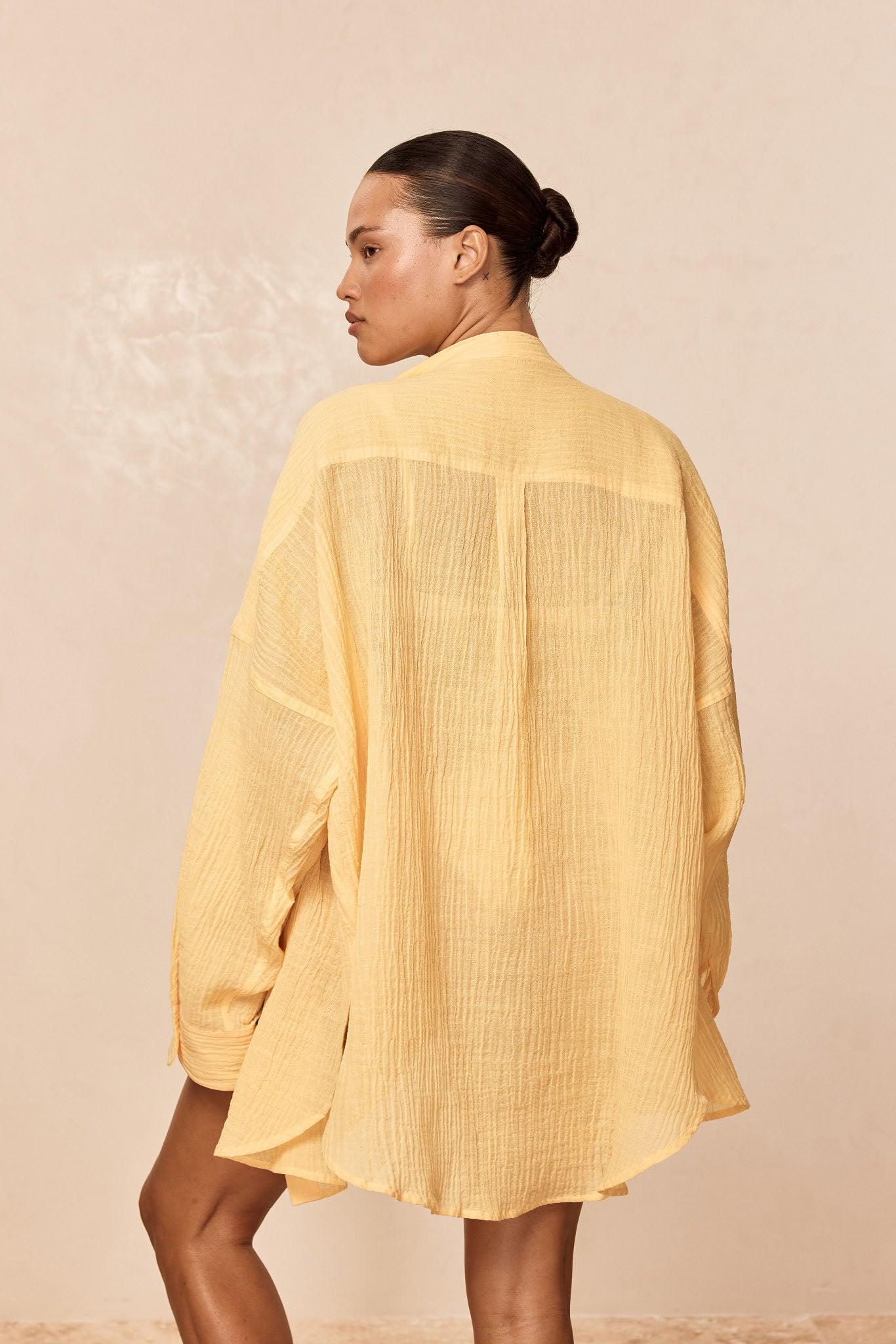 The wear-it-everywhere The ultimate beach to bar look can be achieved in the Barcelona Tunic. With an airy oversized fit, this transitional piece can be worn open, over your favorite swimwear or tied at the front with cute pants. Complete with side slits, flowy sleeves and center front seashell buttons. *Due to the crinkle fabric, it has a little more stretch we do not recommend hanging.Features: Oversized beach shirtSeashell buttonsLong sleevesSide slits Care:Hand wash cold with like colors. Lay flat to dry indoors. Dry clean. Our 100% crinkle linen is a unique fabric with unique wear characteristics. Due to the texture, this crinkle will shrink up when washed in water and drying crinkle in the dryer will further enhance the crinkling, so these garments must be reshaped gently while drying flat. Just like with your favorite denim that shrinks, the crinkle's shape will ease with wear. The alternative to ensure that the crinkle texture remains as similar as possible to the day you first received it is to dry clean our crinkle garments.
