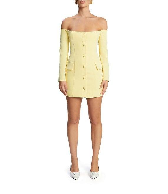 From Bardot, this dress features: Bodycon silhouette Off-the-shoulder neckline Long sleeve Front button detail Faux flap pocket detail Fully lined Back zipper closure Approx. 25.3" length Polyester/elastane Hand wash Imported.