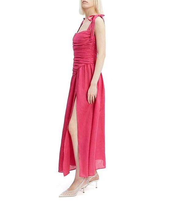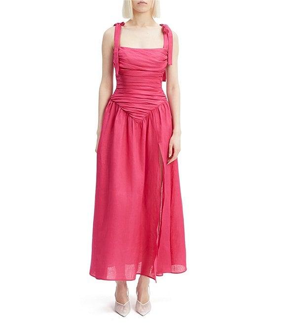 From Bardot, this dress features: Linen blend fabrication Drop waist silhouette Square neckline Sleeveless Self tie straps Ruched detail Front slit detail Lined Back zipper closure Approx. 47.1" length Ramie/cotton Hand wash Imported.