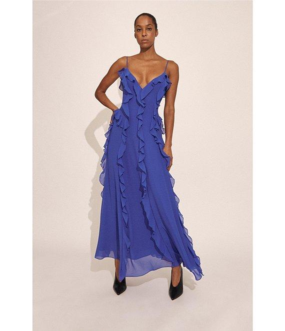From Bardot, this dress features:Aline silhouetteChiffon fabricationV-necklineAdjustable spaghetti strapsSleevelessCascading rufflesZip back closureLinedApproximate length 50.5" from center backPolyesterHand wash coldImported.