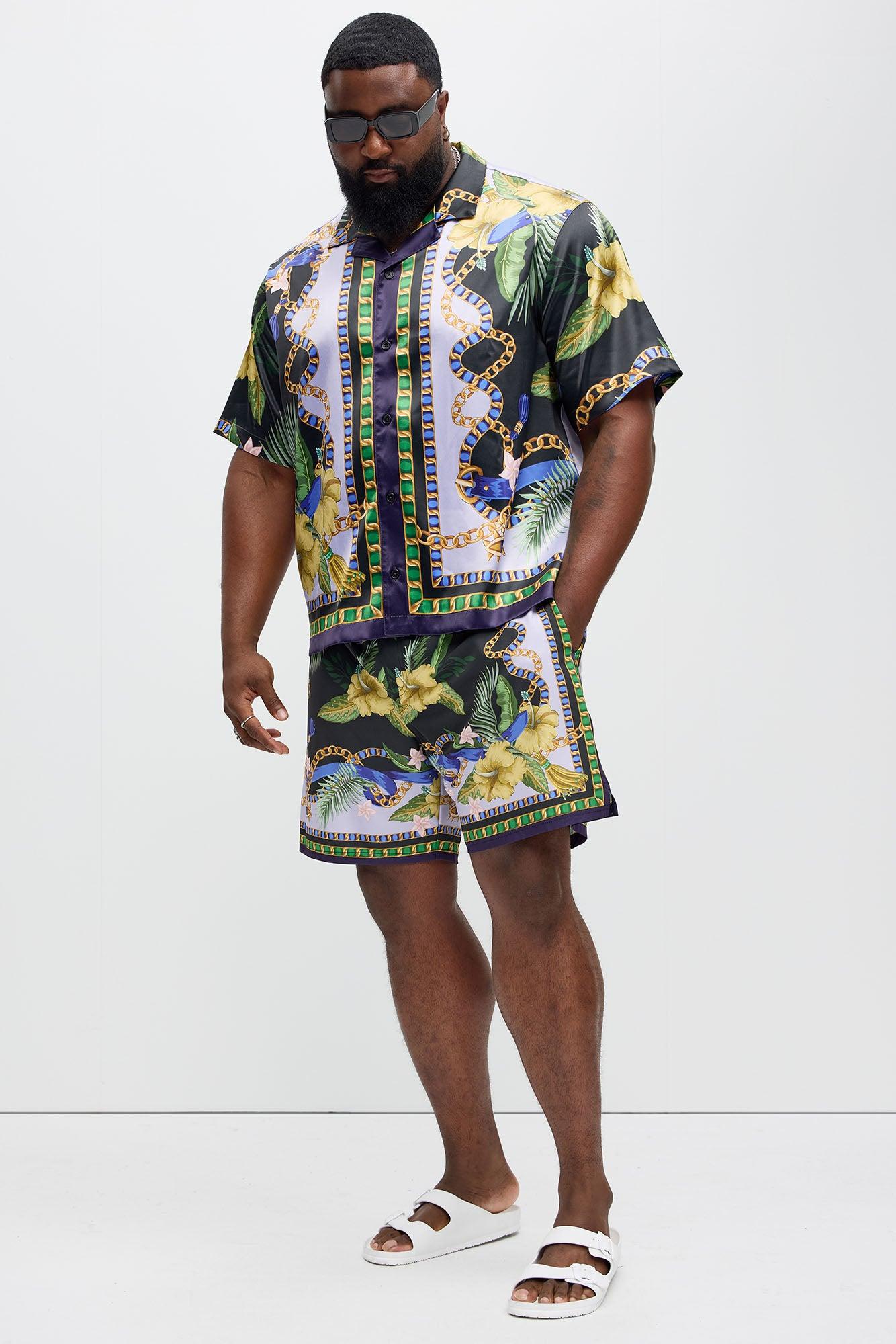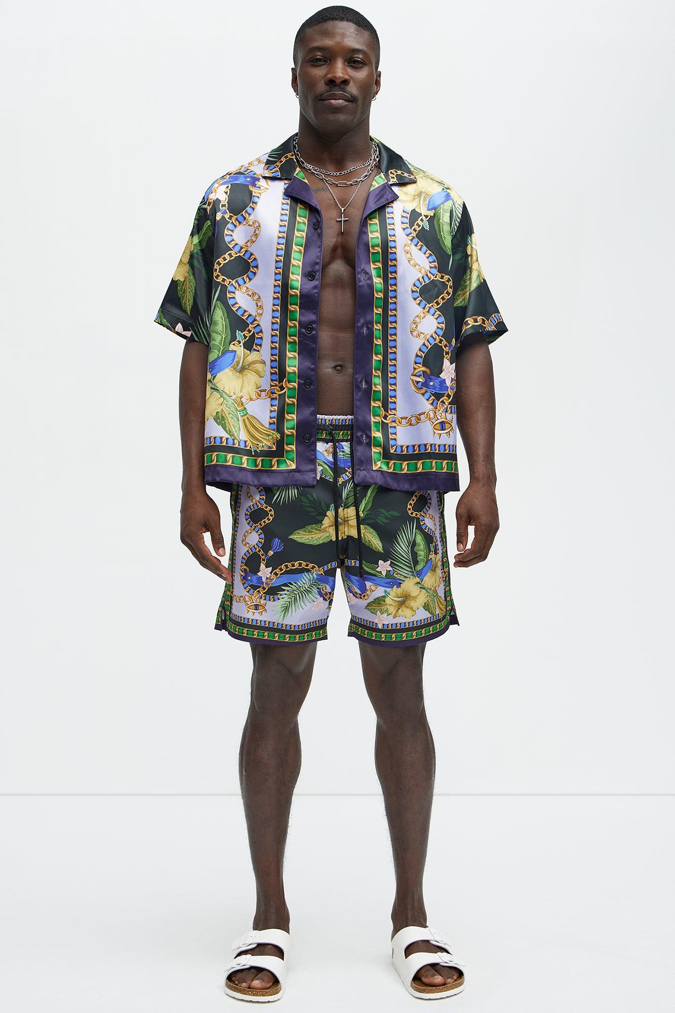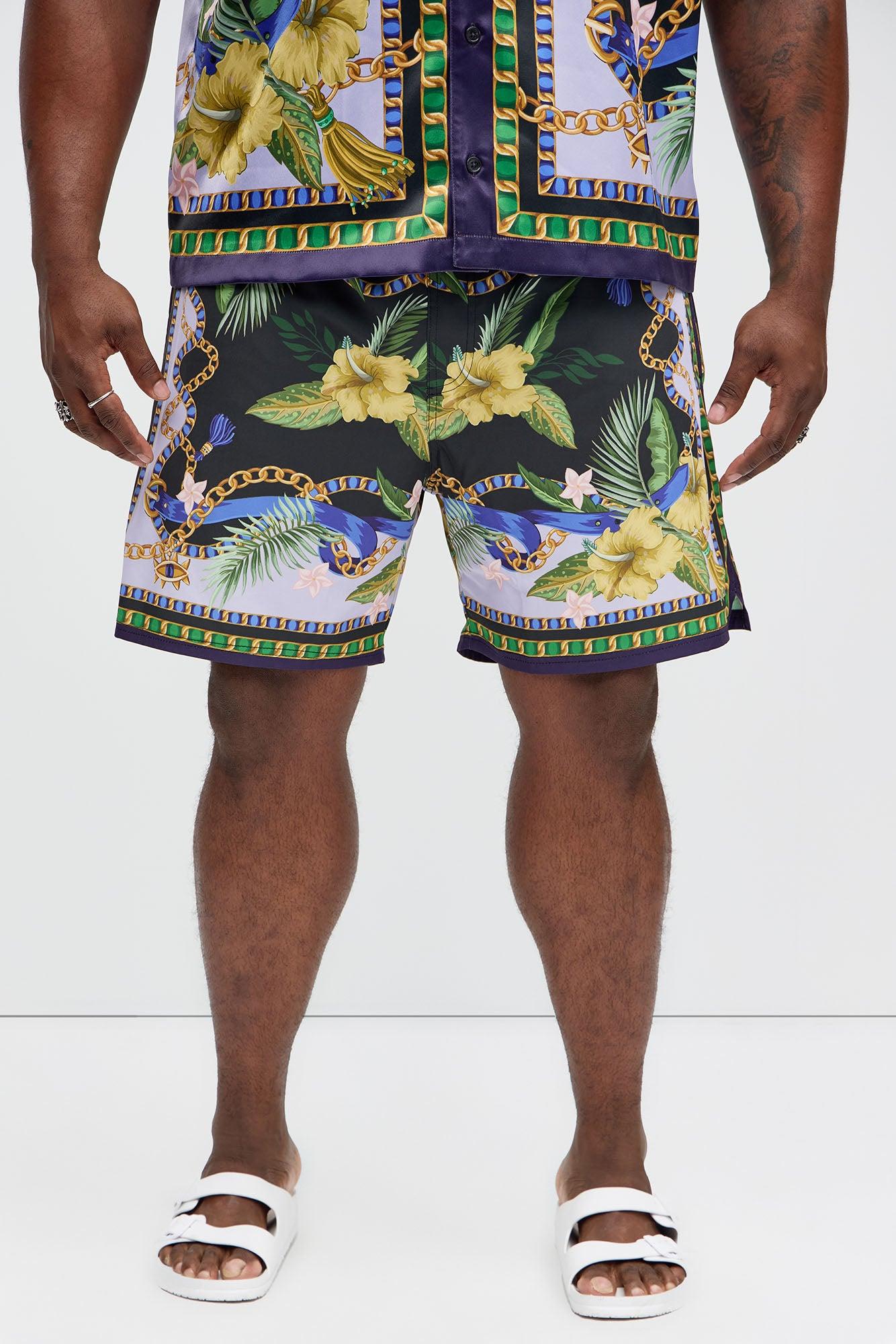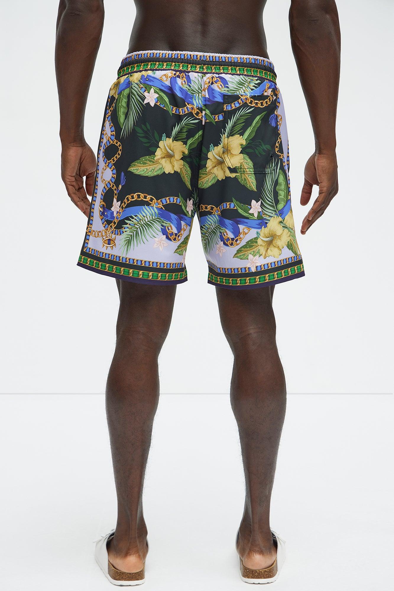 Available In Multi Color. 7" Inseam Elastic Waist Drawstring Mesh Lined Side Hand Pockets Baroque Floral Print Back Pocket With Velcro Closure Pair With The Baroque Floral Cuban Collar Button Up Shirt Shell: 92% Polyester, 8% Spandex Final Sale Imported California Proposition 65 WARNING: Cancer and Reproductive Harm - www.P65Warnings.ca.gov.
