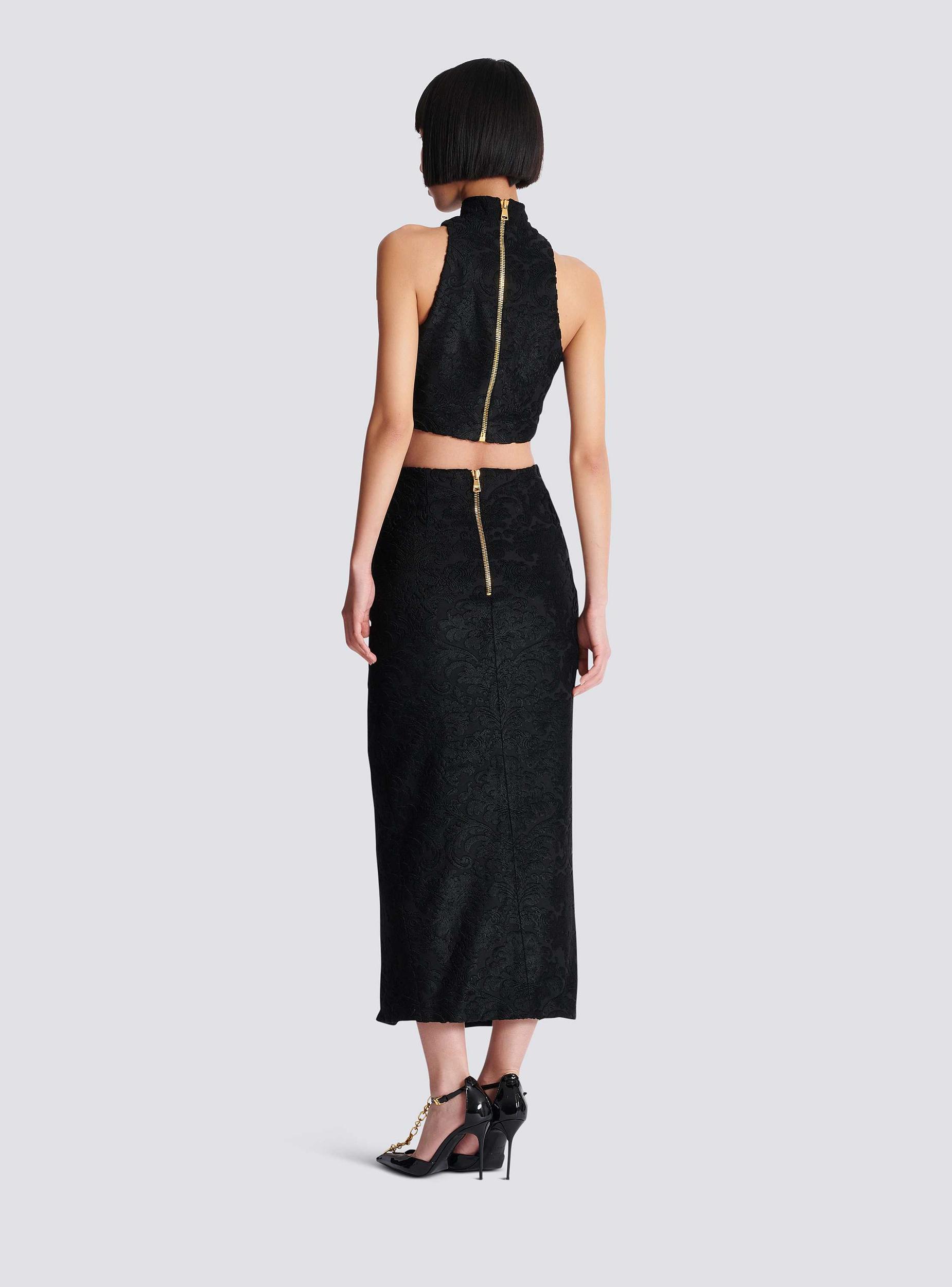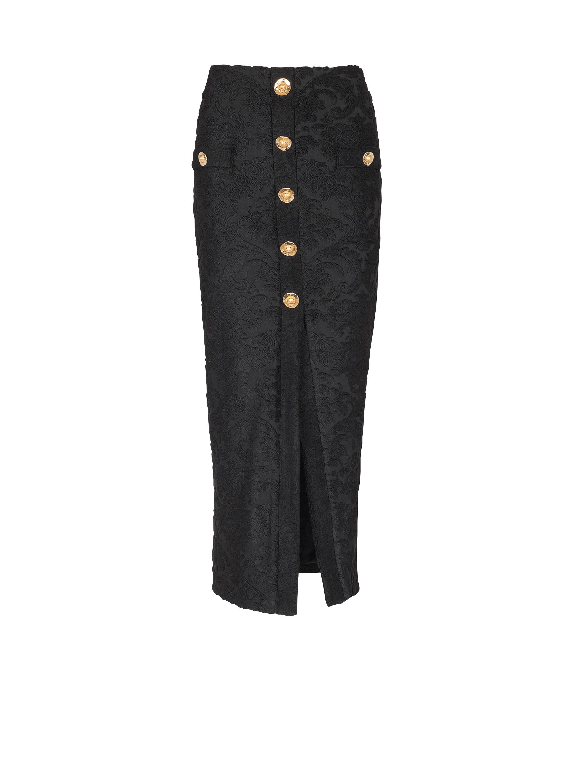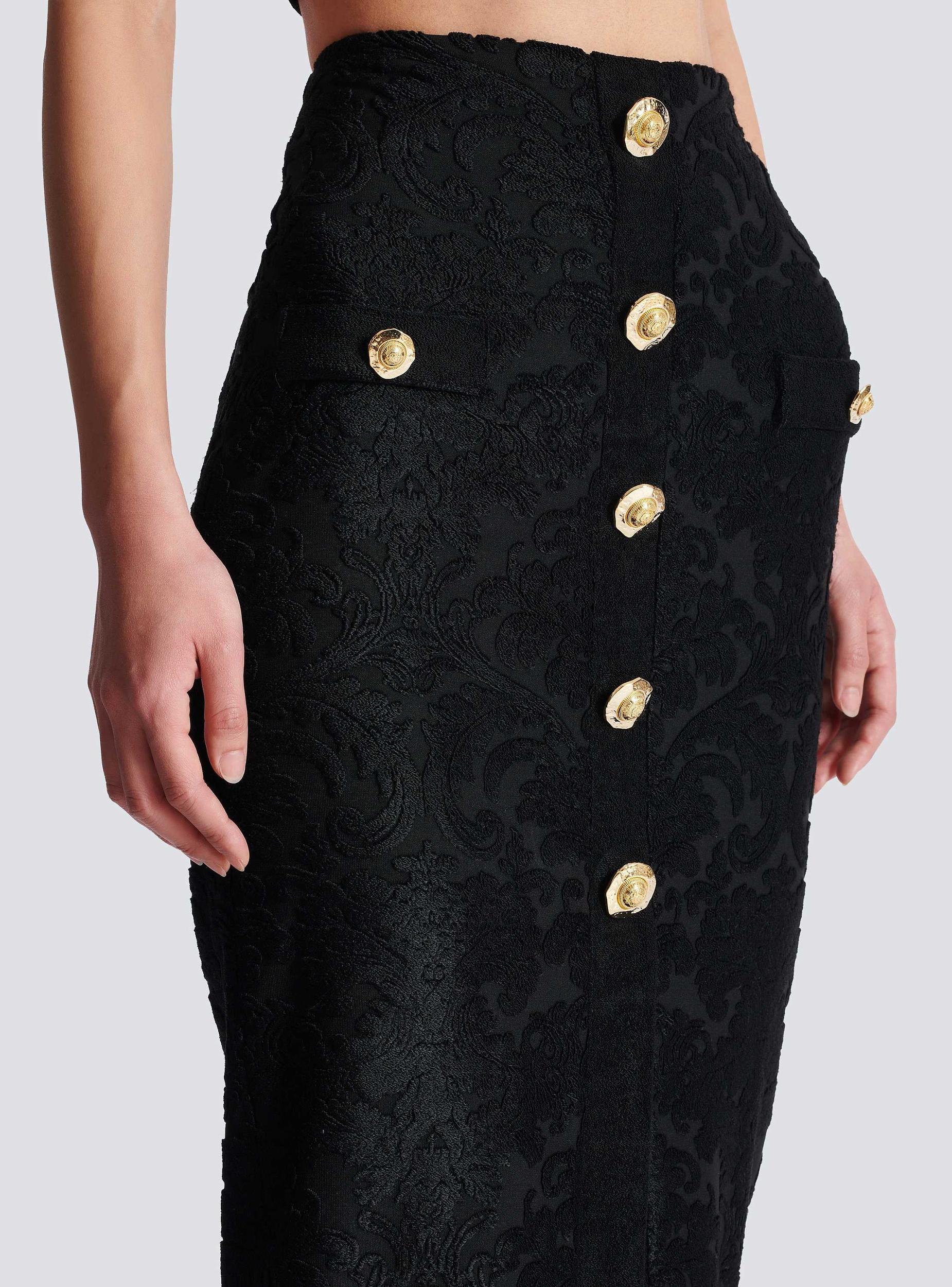 Bouclé baroque pattern skirt5 decorative buttons on the front2 trompe-l'œil pockets with 2 decorative buttons“Gold and Gold Coin” buttonsFront splitVisible gold metal zip fastening on the back with Balmain Paris-engraved sliderJersey liningTight midi fitModel measures 178cm and wears a size 36Main material: 65% viscose 35% polyesterMade in BulgariaItem: FF1LE481JK65