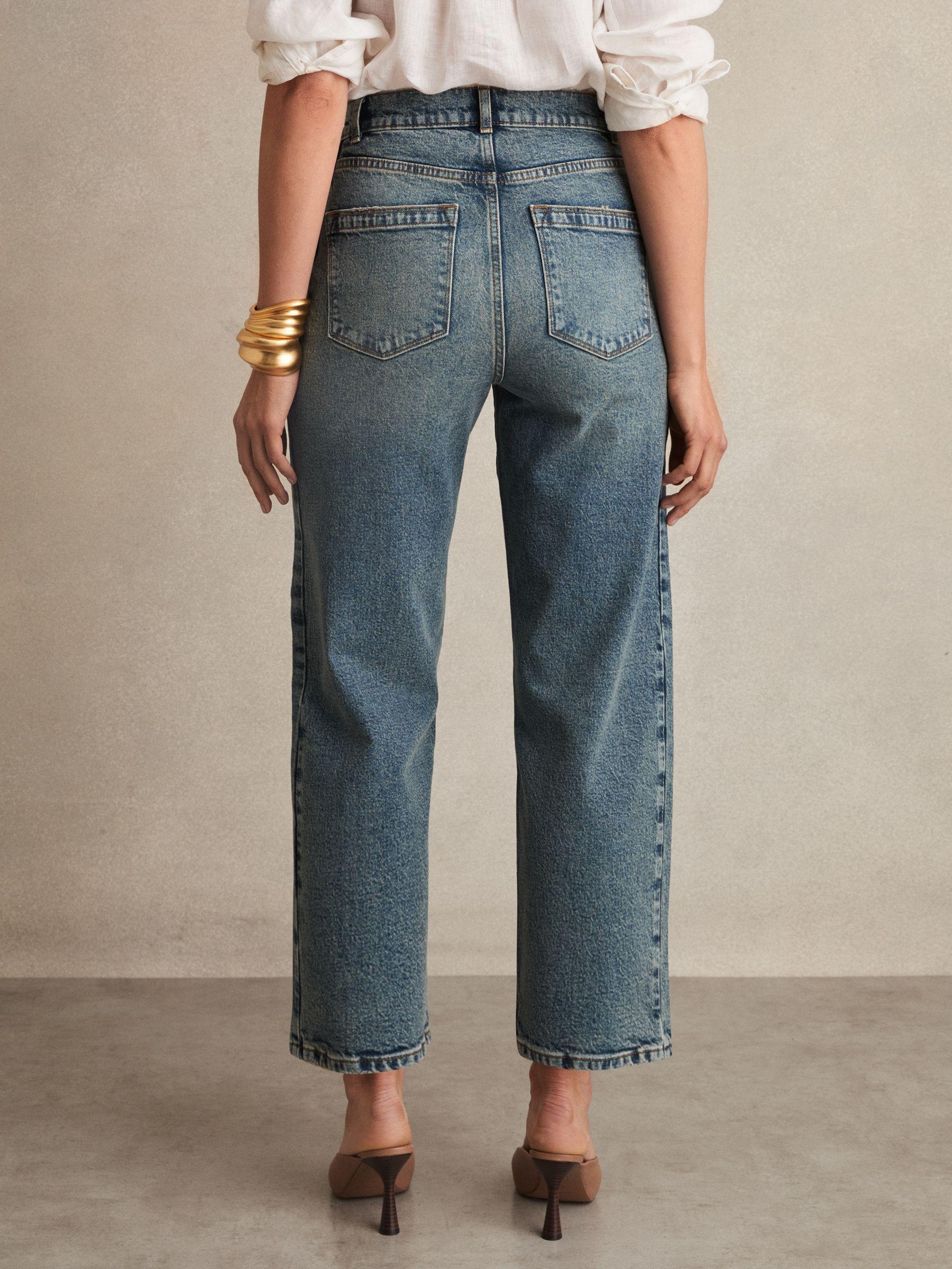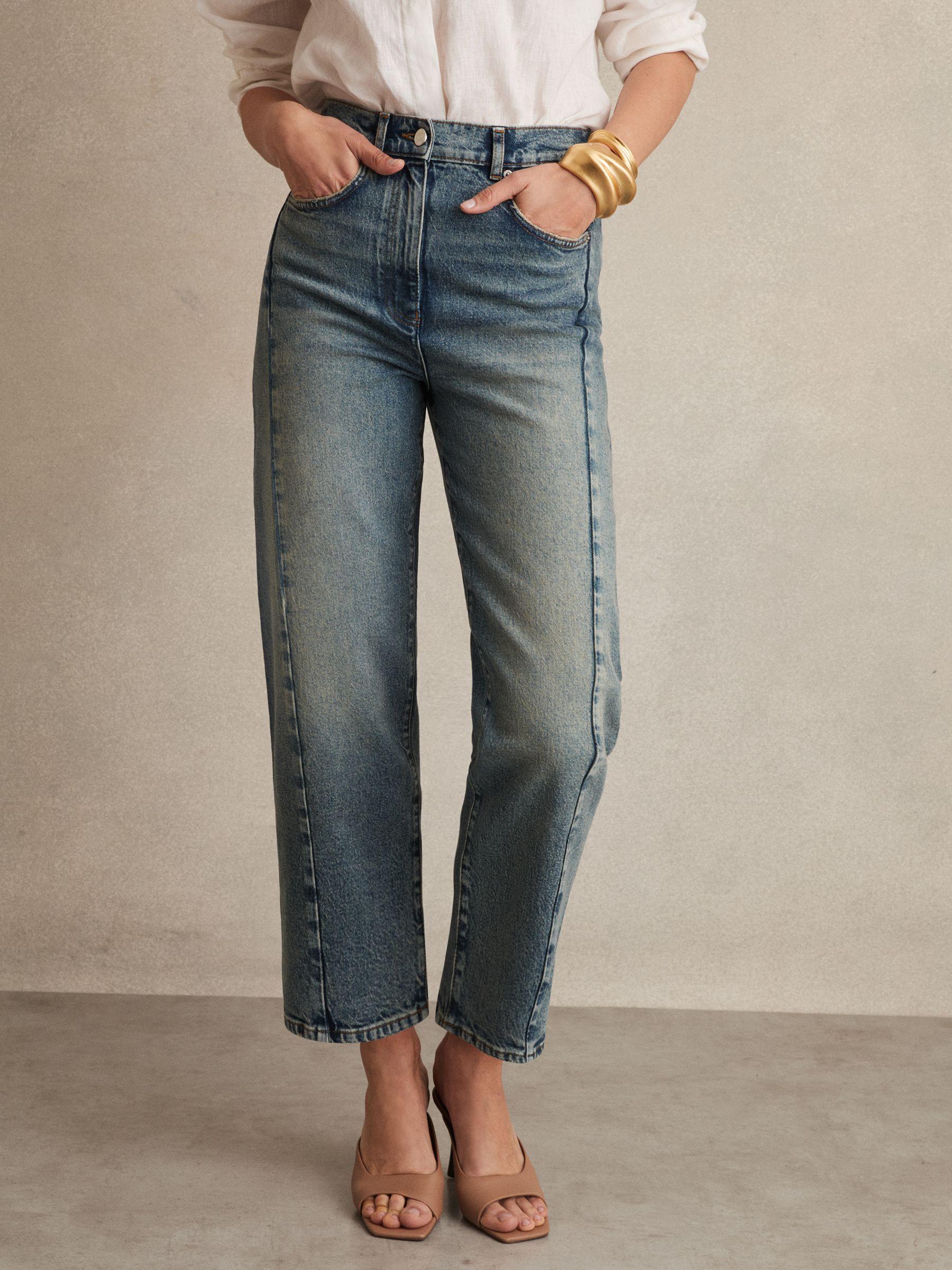 The Molly jeans are cut to a modern barrel-leg silhouette, defined by seam detailing through the front of each leg. Softly faded patches and light feathering at the thighs lend a gently worn-in feel. Cotton-denim with stretch. Barrel leg. Seam details. Five pockets. Front button and zip.