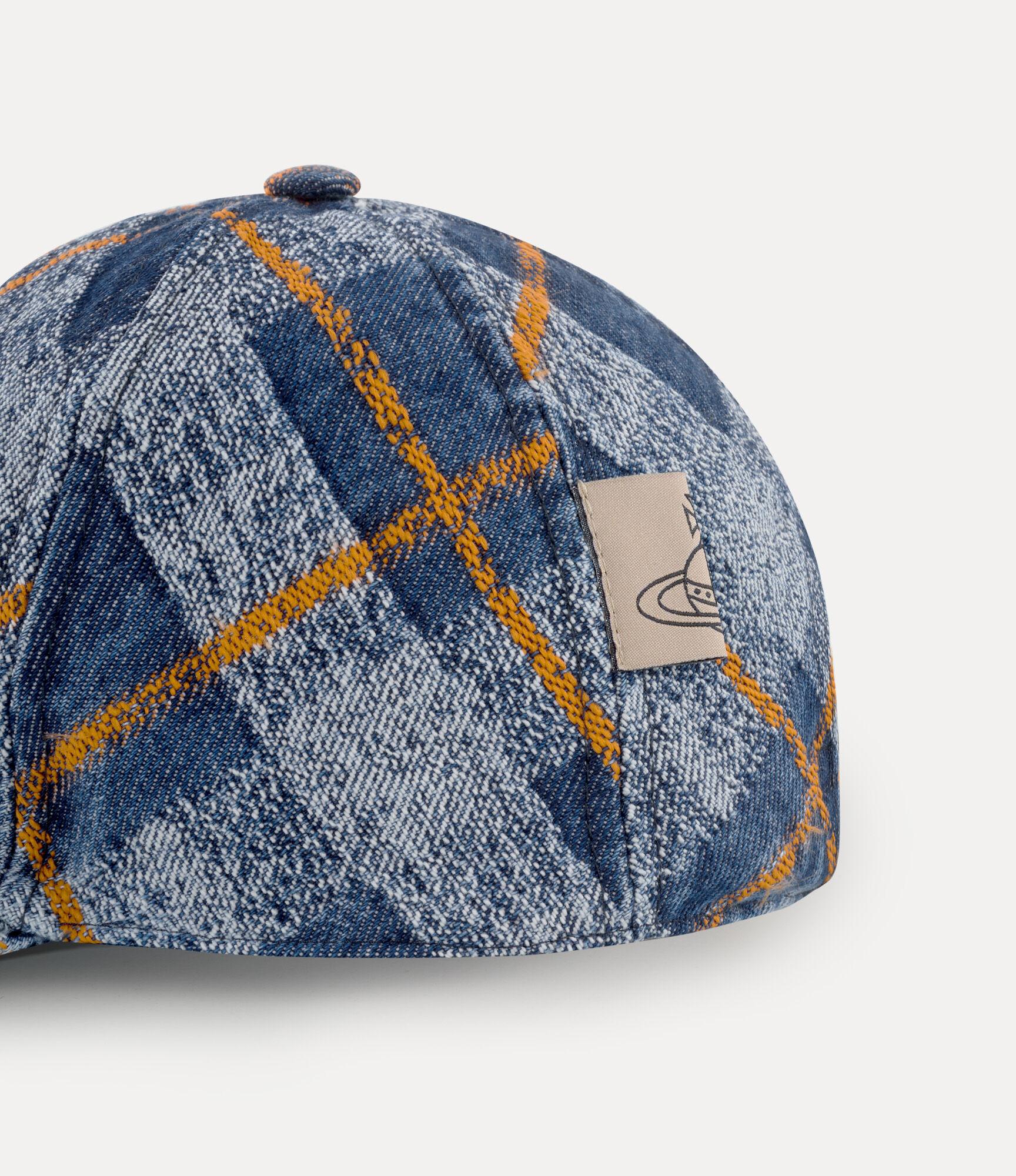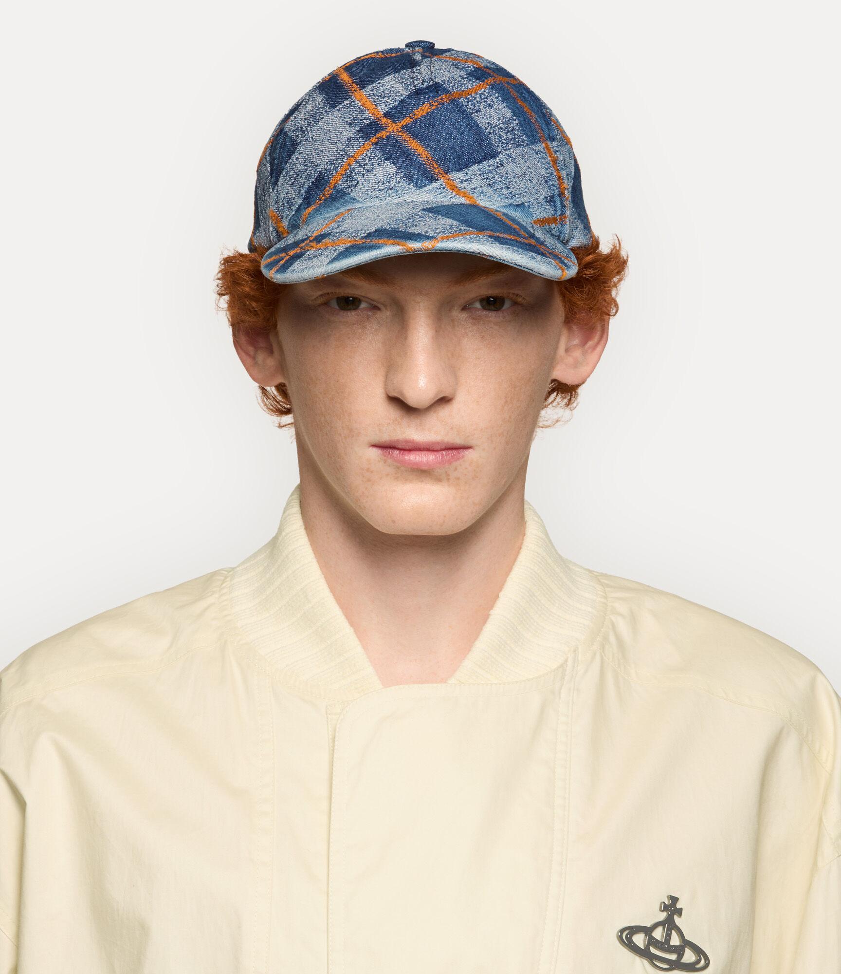 Our signature baseball cap is adorned with this season’s cotton ‘Denim Tartan’ motif, woven in vibrant hues and complete with orange accents throughout the design. Finished with our classic ‘Line Orb’ label at the side, the piece reflects Vivienne’s vision of launching tradition into the future.