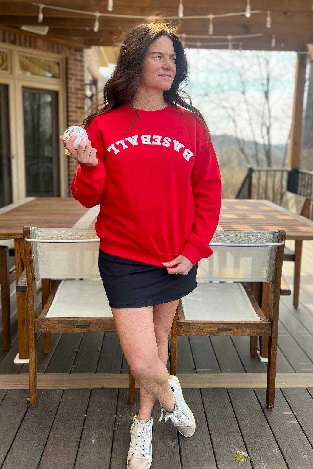 Graphic sweatshirt says "Baseball" in upside down puff lettering. It is printed on a 50/50 heavy blend Gildan sweatshirt. Fit is true to size. We recommend sizing up one to two sizes if you prefer an oversized fit. Model is wearing a size M and is 5'7" tall and a size 6/8. 50% cotton, 50% polyester