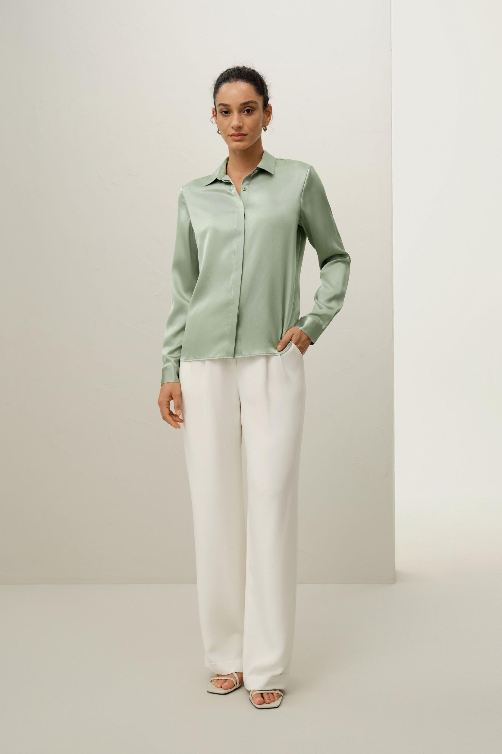 Shop our Basic Concealed Placket Silk Shirt Long Sleeve in various colors including white, black, red, green, pink and purple. Made from 100% silk, this shirt is perfect for any occasion.