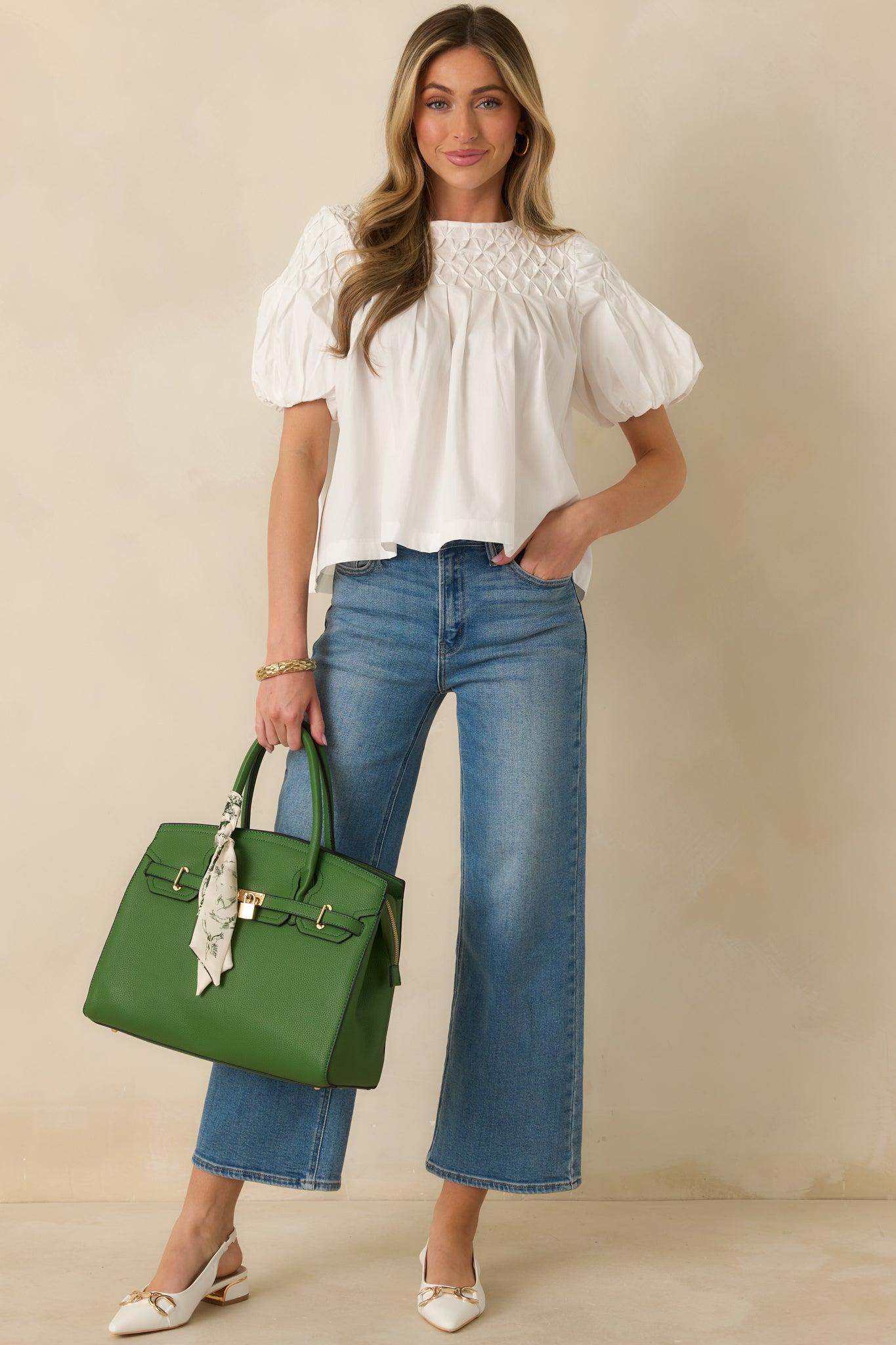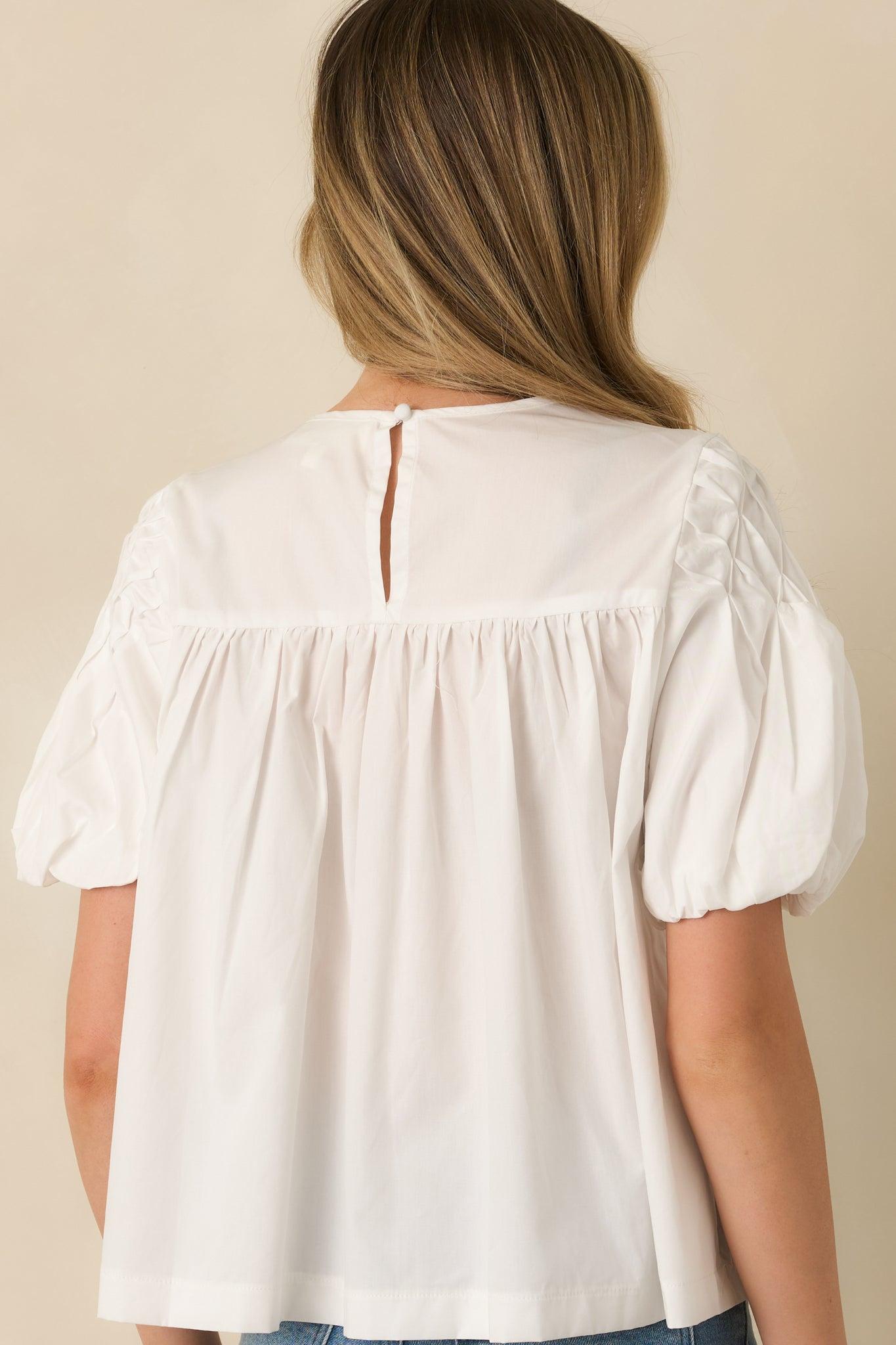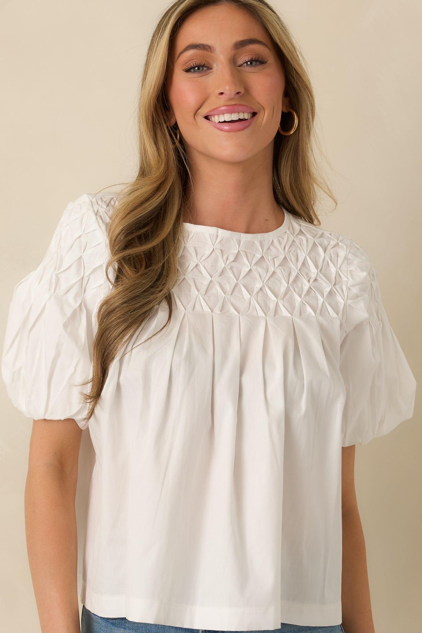 Elevate your everyday wardrobe with this essential white cotton short sleeve top. Crafted from premium cotton, it delivers unmatched softness and breathability for all-day comfort. The timeless design pairs effortlessly with everything from jeans to skirts, making it a versatile staple you'll reach for again and again. Whether you're dressing up or keeping it casual, this top brings an understated elegance to any look. Experience the luxury of quality basics that never go out of style. This white top features a round neckline, a lattice smocked yoke, short puff sleeves with elastic cuffs, a back yoke seam, and a keyhole back closure. 100% Cotton Lining: 100% Polyester Hand Wash Cold Manufactured in China Designed in The USA Model is 5'8" and Wearing a Size Small, Clipped, Model is a True X-Small