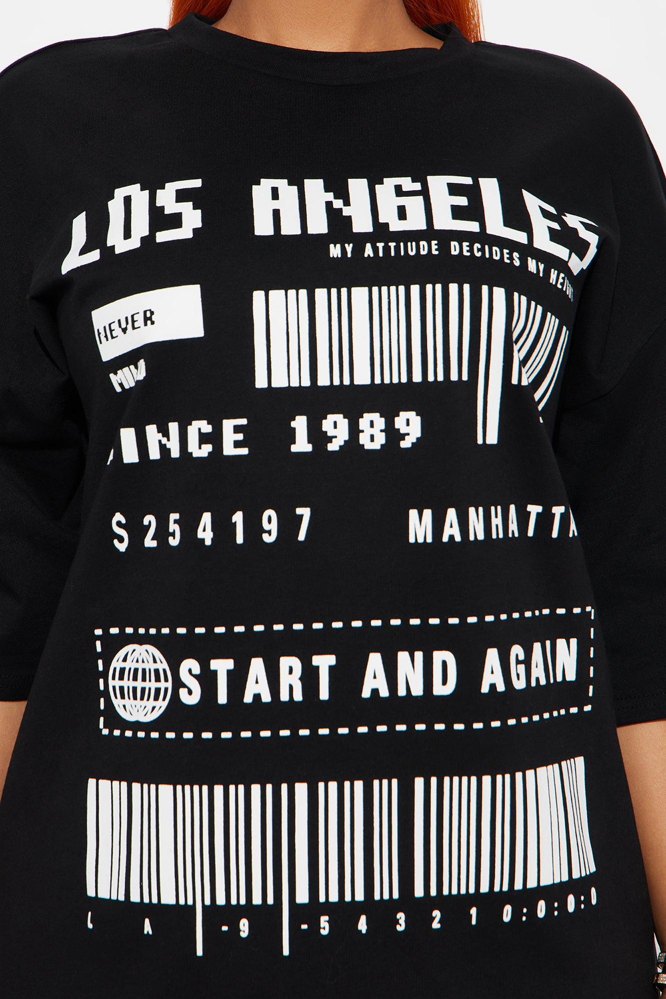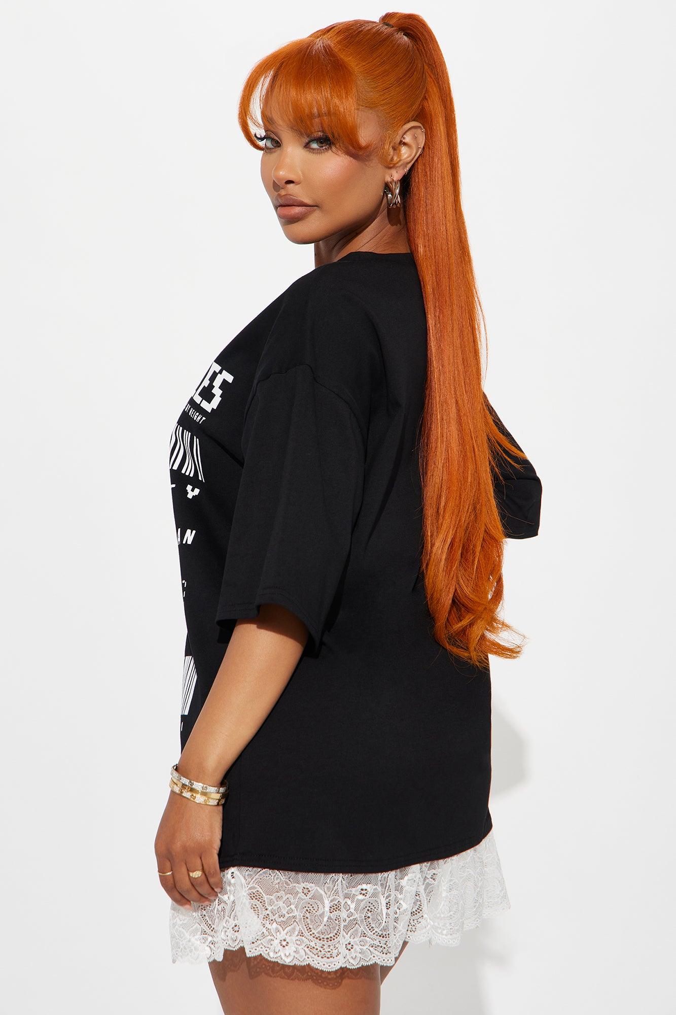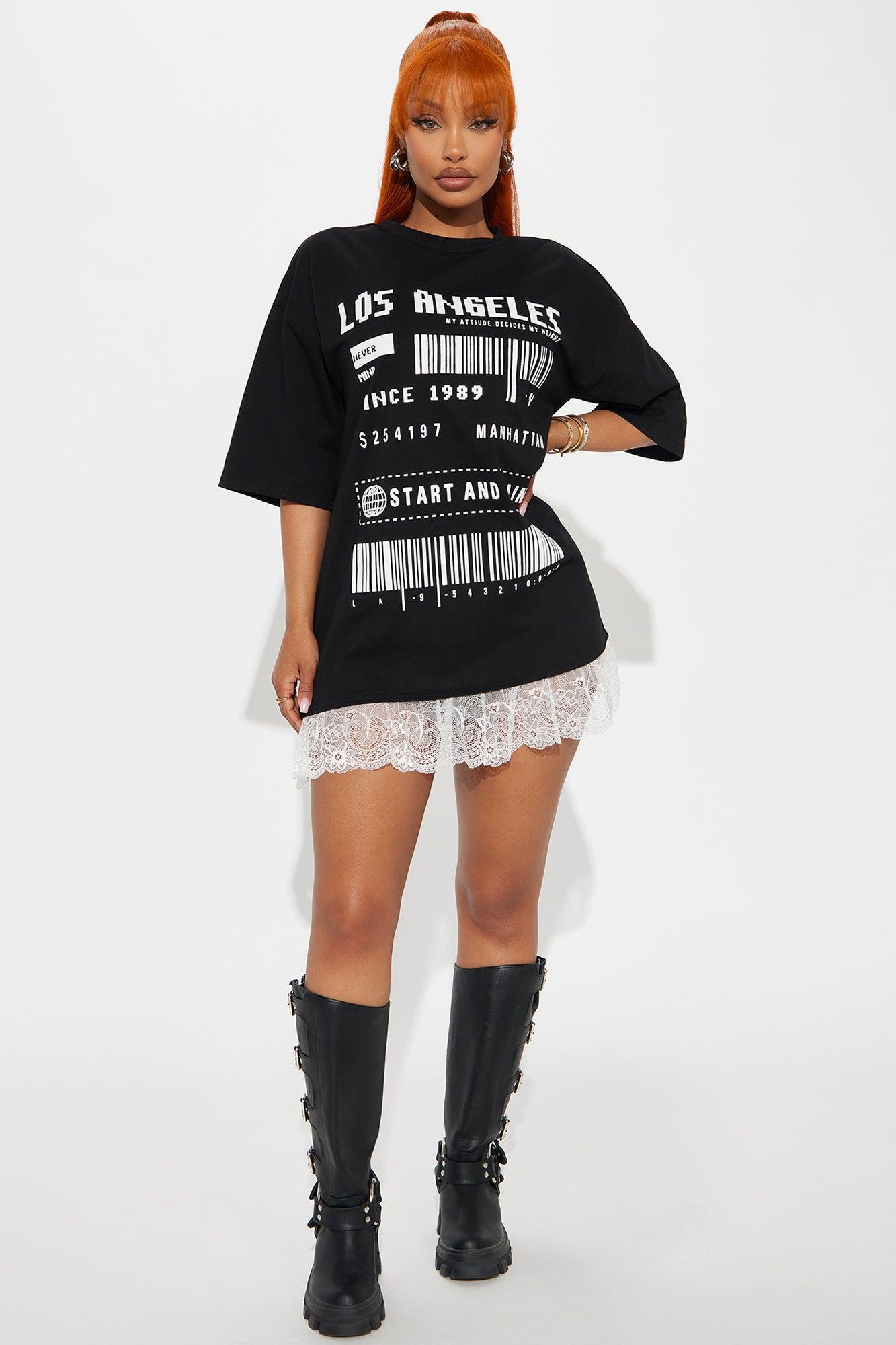 Available In Black. T Shirt Mini Dress Crew neck Short sleeves Graphic Lace Trim Stretch Length = 34" Disclaimer: Due To The Printing Process A Difference In Saturation May Occur. Each Garment Is Unique. Self: 100% Cotton Contrast: 80% Cotton 20% Nylon Imported