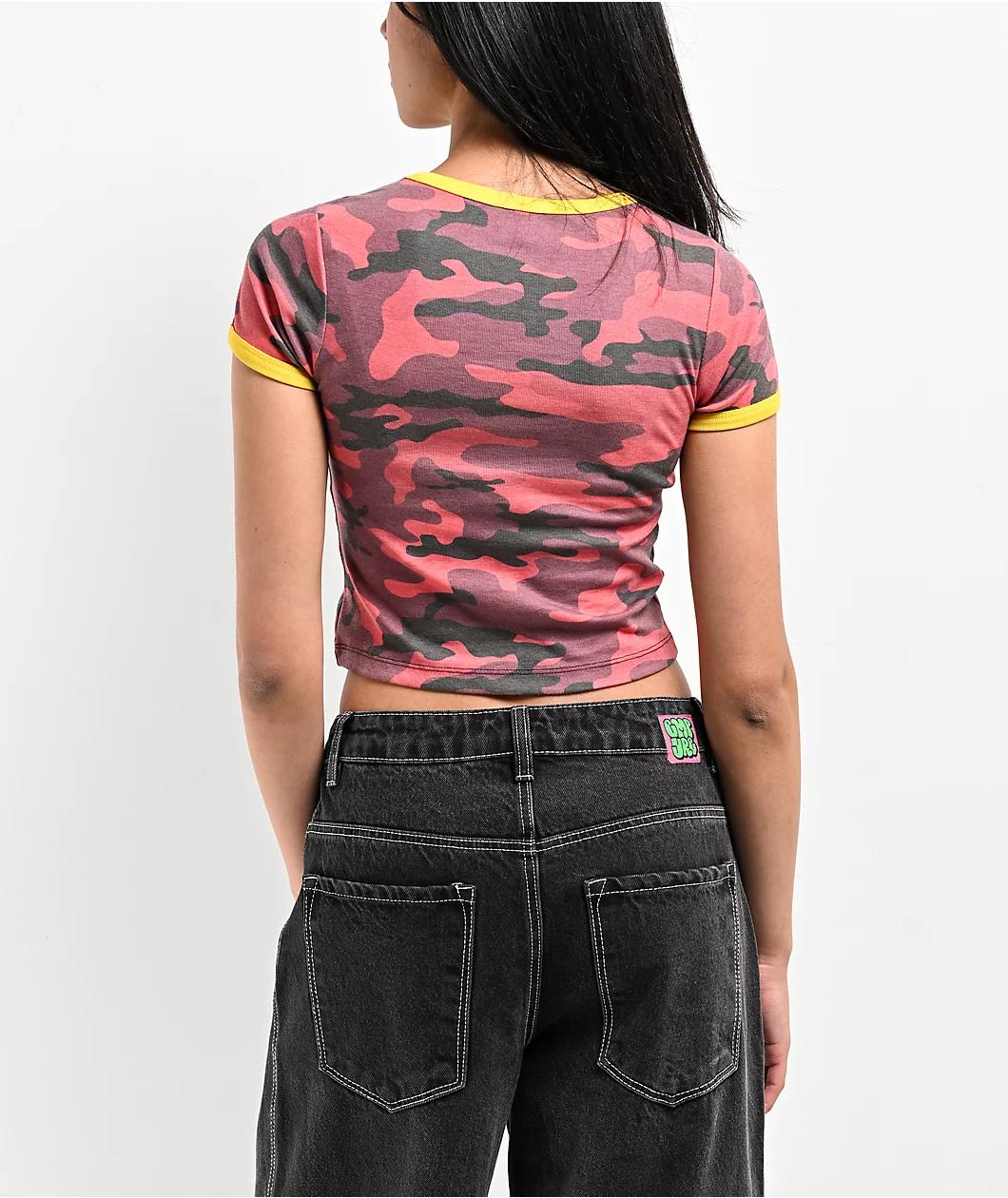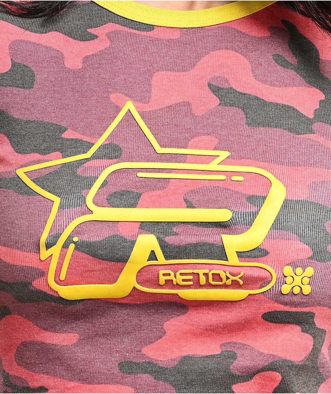 Basic Pleasure Mode presents the Strawberry camo t-shirt in a red colorway with yellow accents, utilizing a unique camouflage pattern throughout with a puff-printed graphic on the front for a futuristic look. Highlighting the ribbed sleeve cuffs and