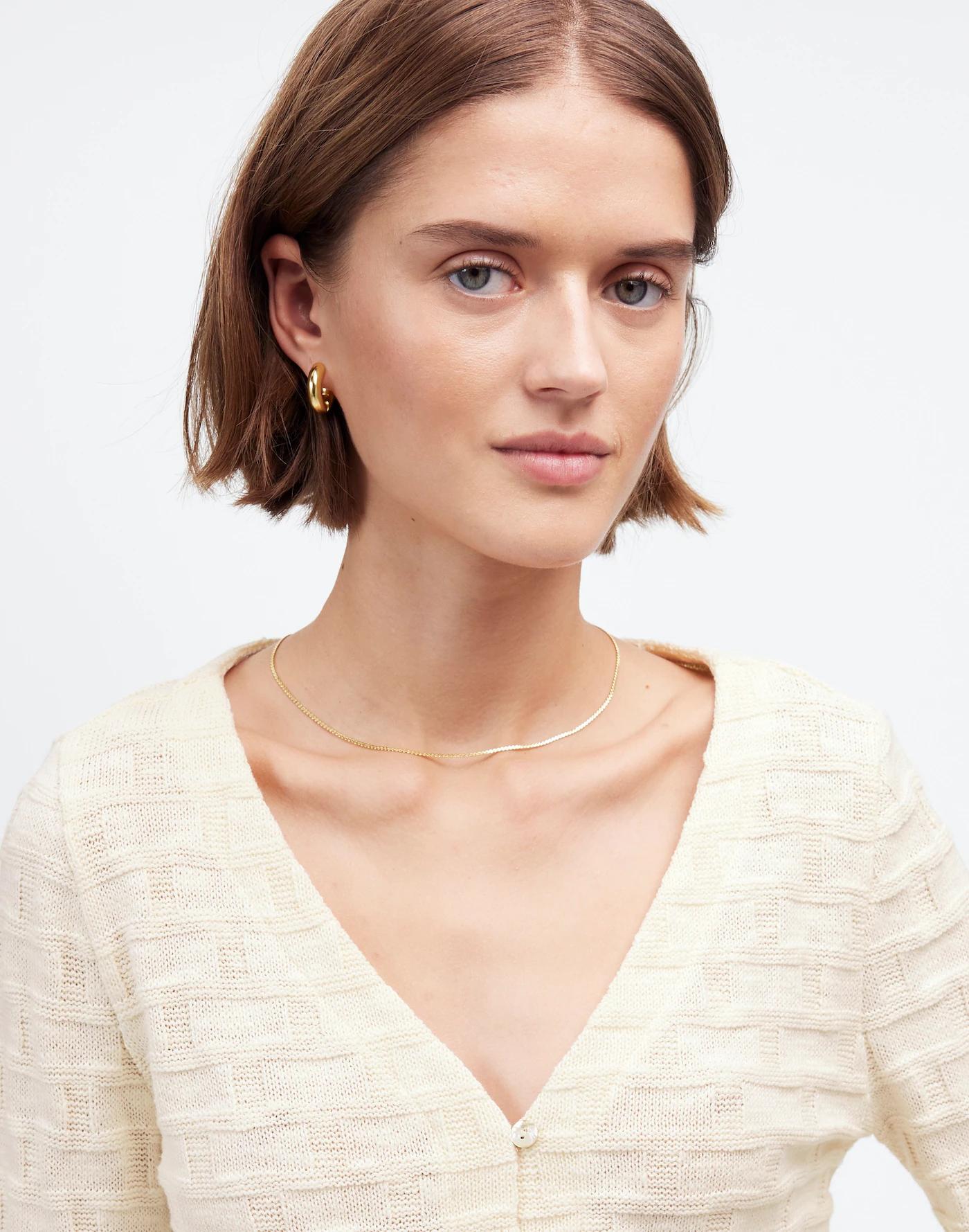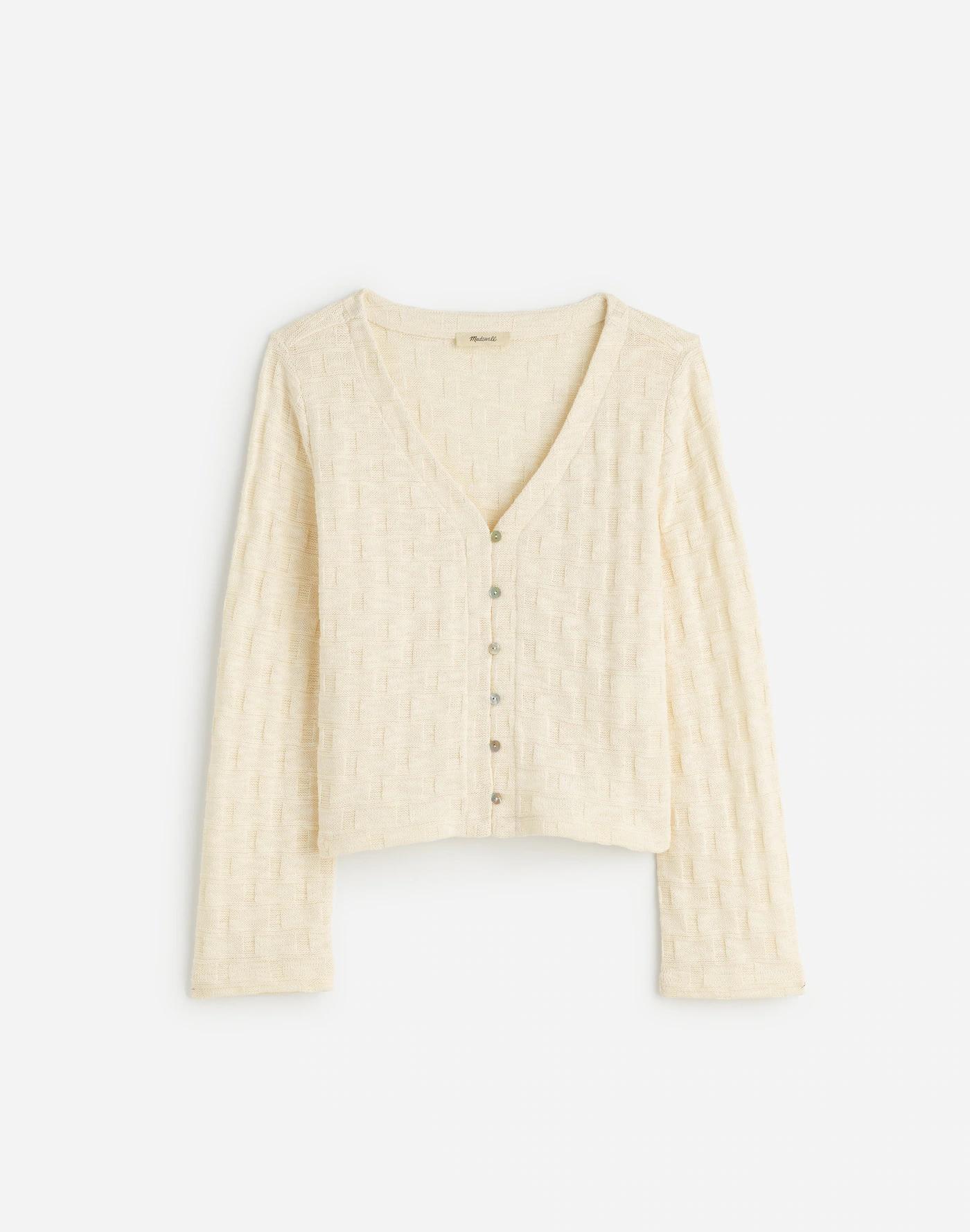 This sweater tee features a cozy basket-weave stitch and long bell sleeves for an elevated touch. The V-neck and button front add a modern, versatile edge, making it perfect for layering or wearing solo.