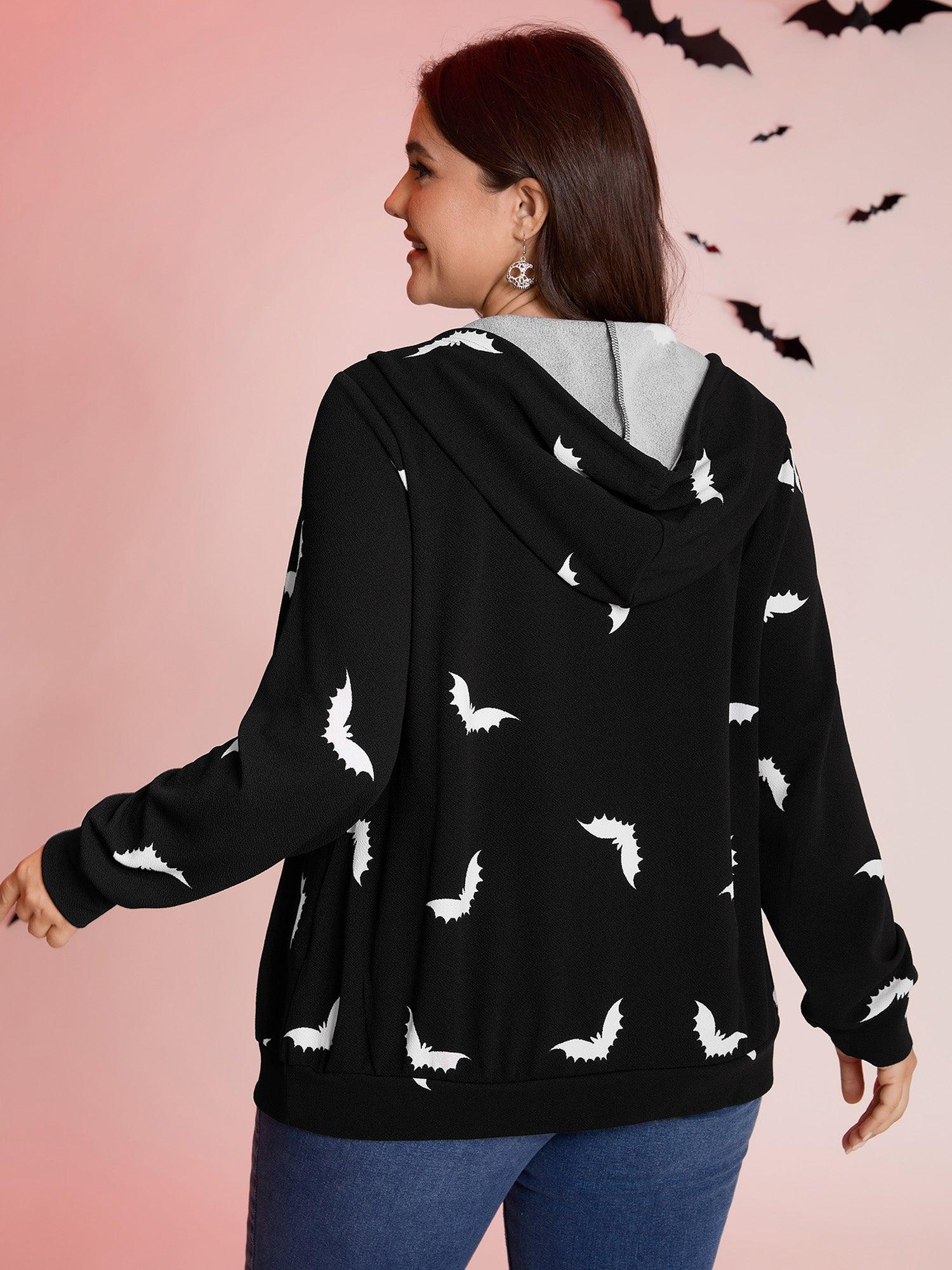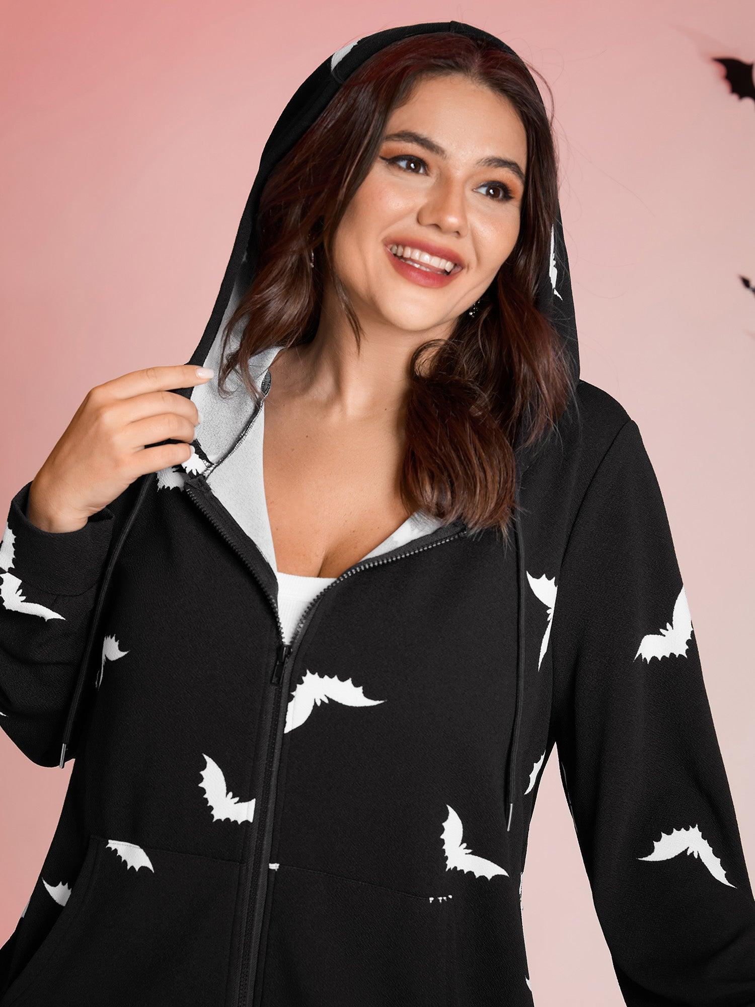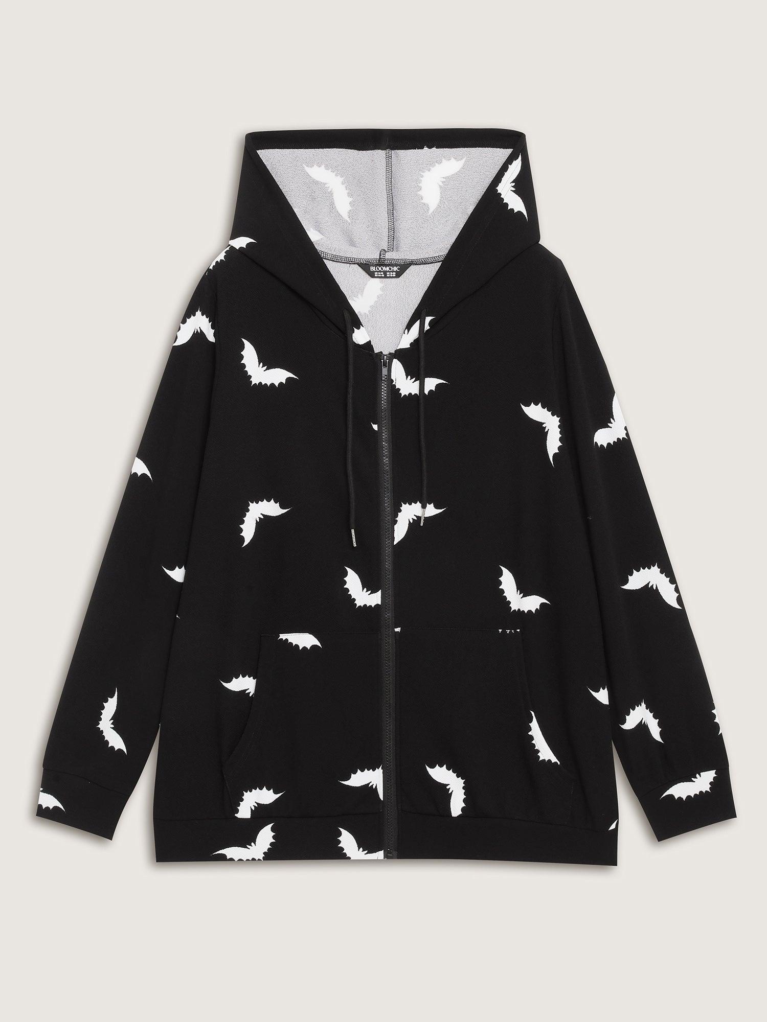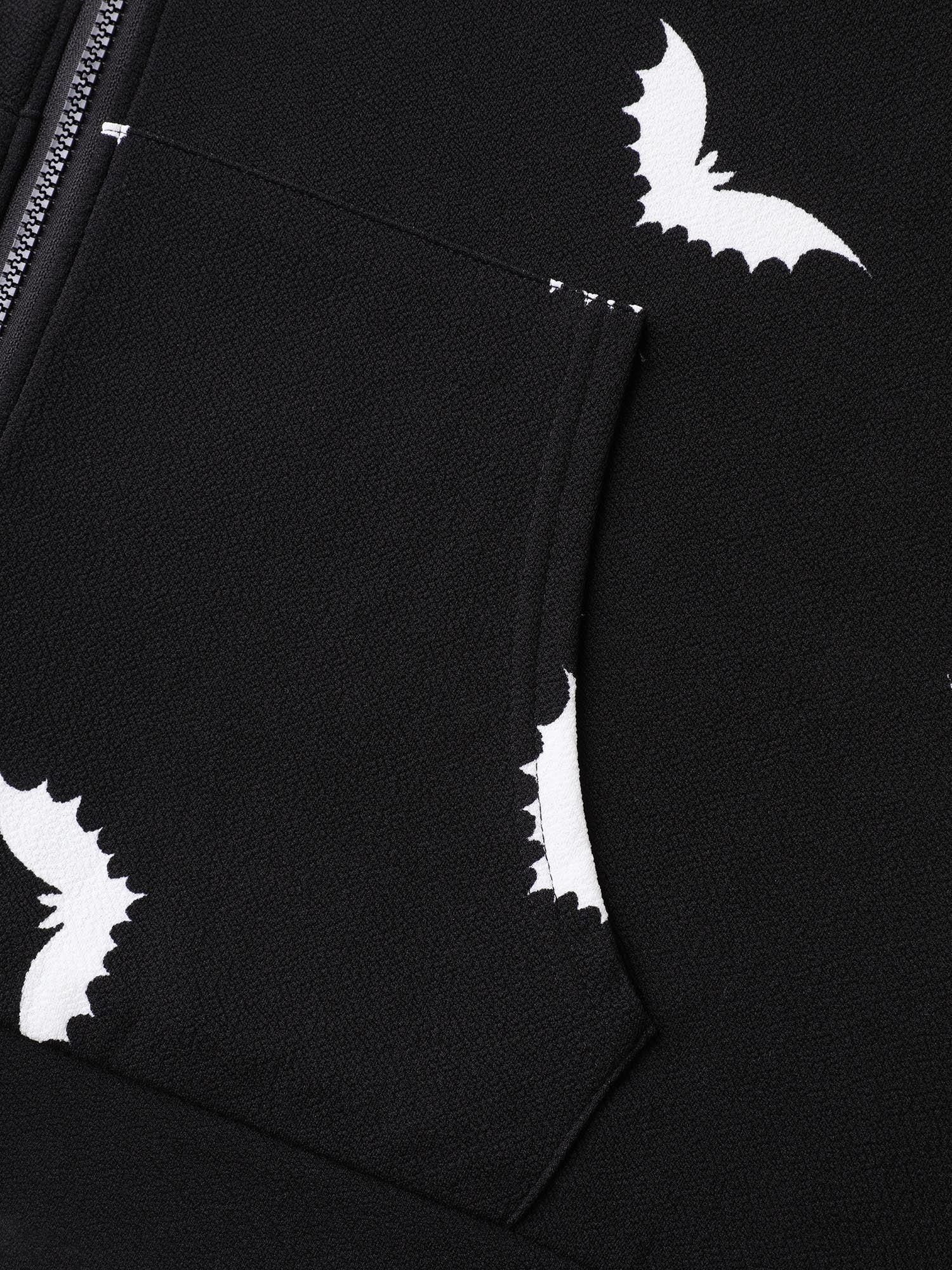 Bat Print Stretchy Textured Zipper Hoodie Female