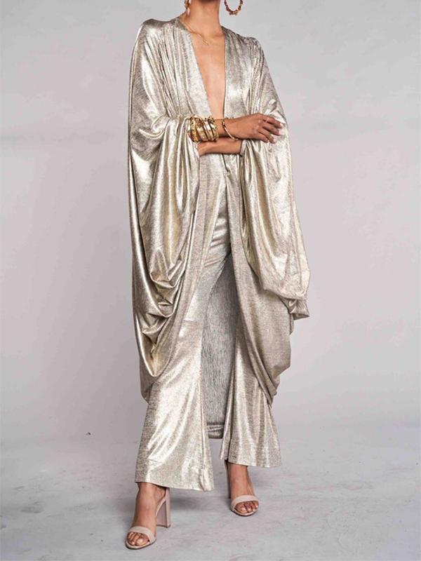 Add a touch of elegance with this batwing sleeves long sleeves shiny solid color deep V-neck blouse. Perfect for evening outings or special occasions, it combines a trendy look with a flattering fit. Shop now for a bold and stylish wardrobe update!