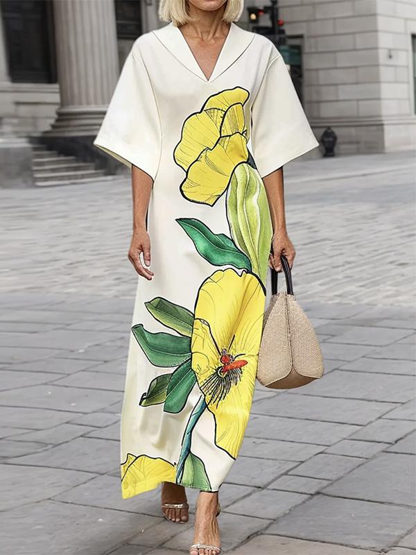 Batwing Sleeves Loose Floral Printed Split-Joint V-Neck Maxi Dresses
