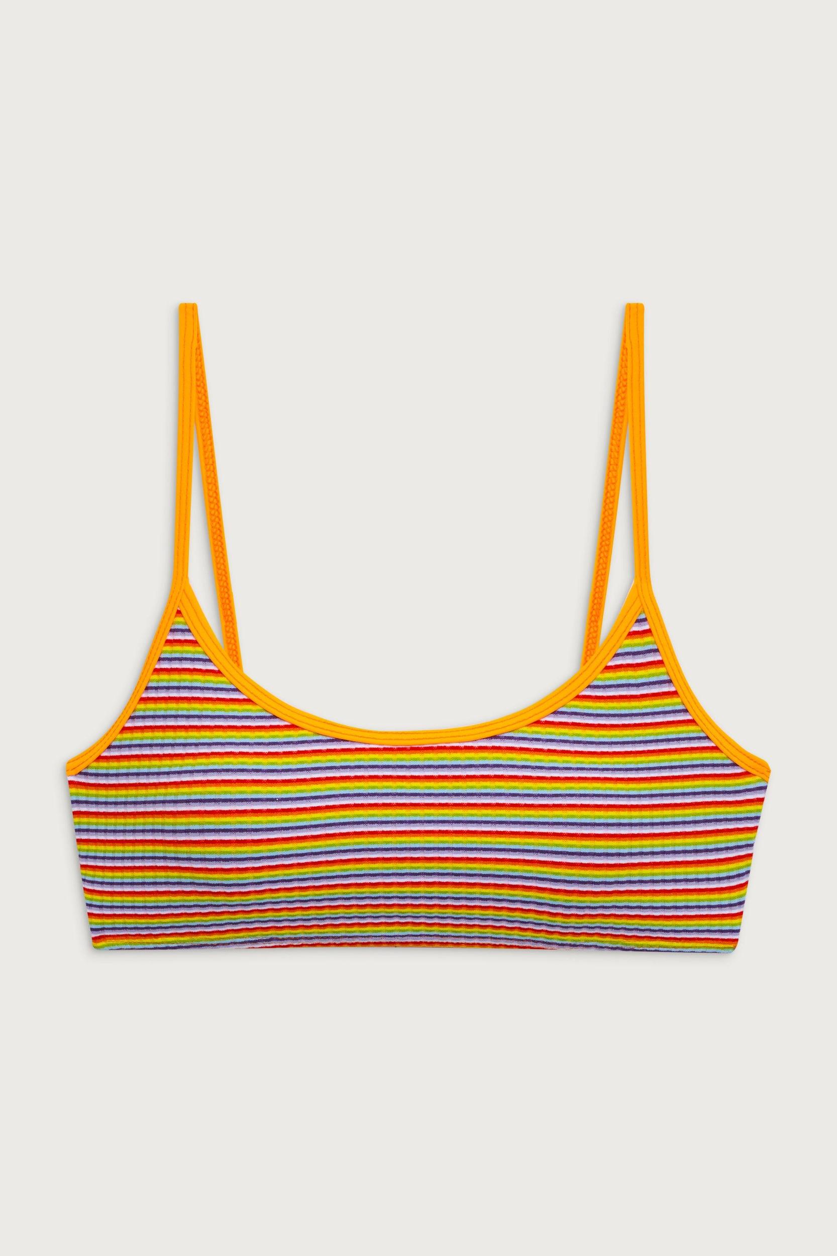 A supportive top we know you'll love all year round. Meet Bay View, a bralette style bikini top designed with adjustable shoulder straps, a scoop neck design, and a new rainbow striped rib fabric. Start planning for your next vacation with the Bay View bikini top paired with the matching Full Moon bottom. Fabric 77% Polyamide + 23% Spandex Striped Rib Adjustable Shoulder Straps Model Size & Fit If in between sizes, we recommend sizing up in this style. Jasmine is wearing a size Small Height 5’9” (175cm) Bust 34" (86cm), Waist 23.5" (60cm), Hips 34” (86cm)