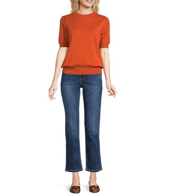 From Bayeas, these jeans features: Stretch denim fabrication High rise Belt loops 5 pocket style Straight leg Ankle length Front button and zipper closure Approx. 27" inseam Cotton/polyester/viscose/spandex Machine wash Imported.