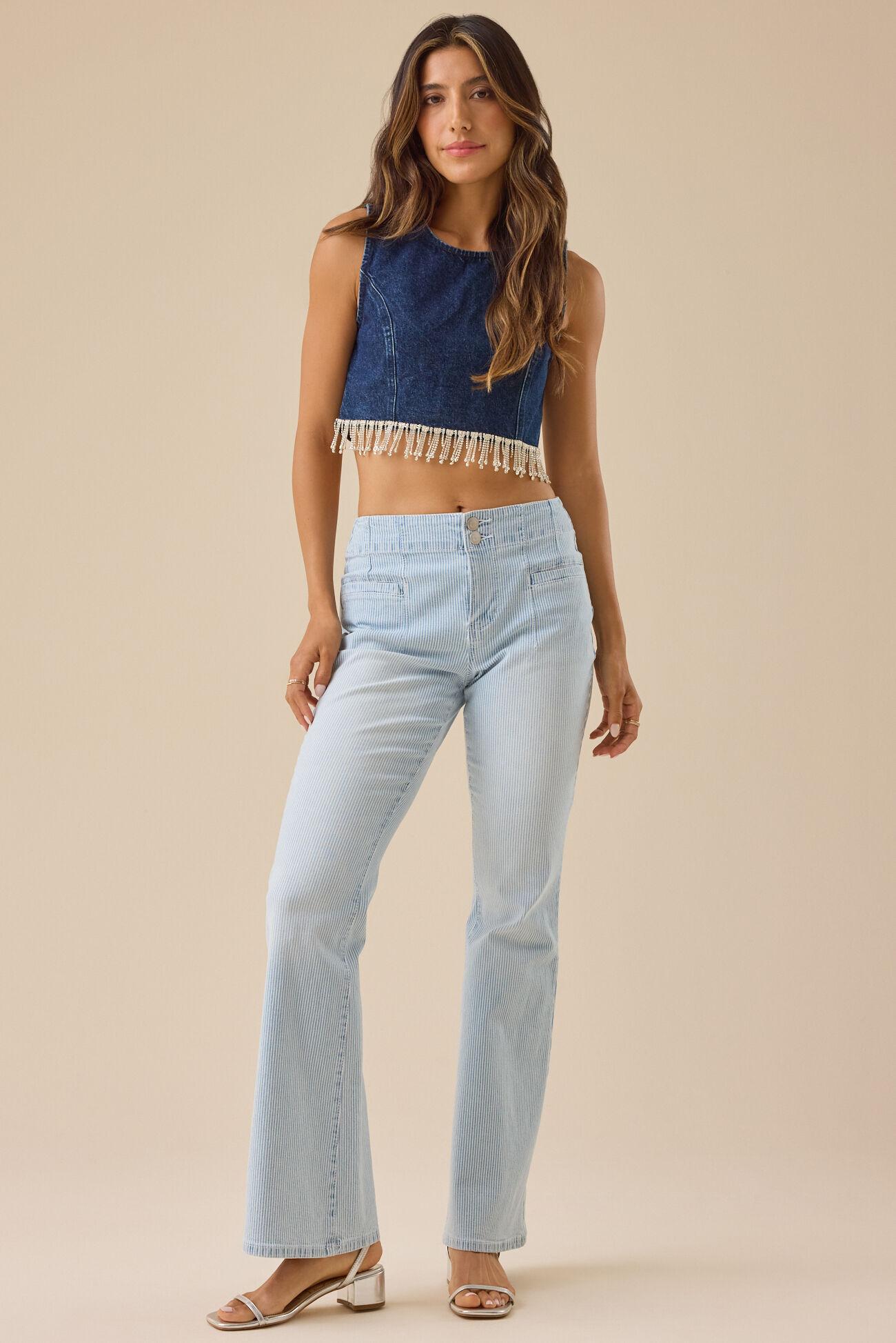 Elevate your denim style with this unique top. The denim fabric is both stylish and versatile, and the rhinestone fringe creates an eye-catching and fun detail. Perfect for concerts and festivals!
