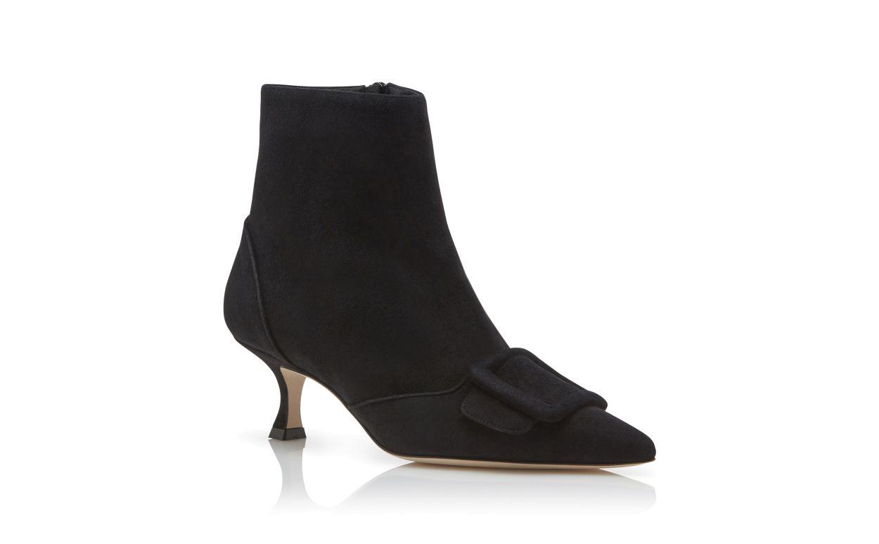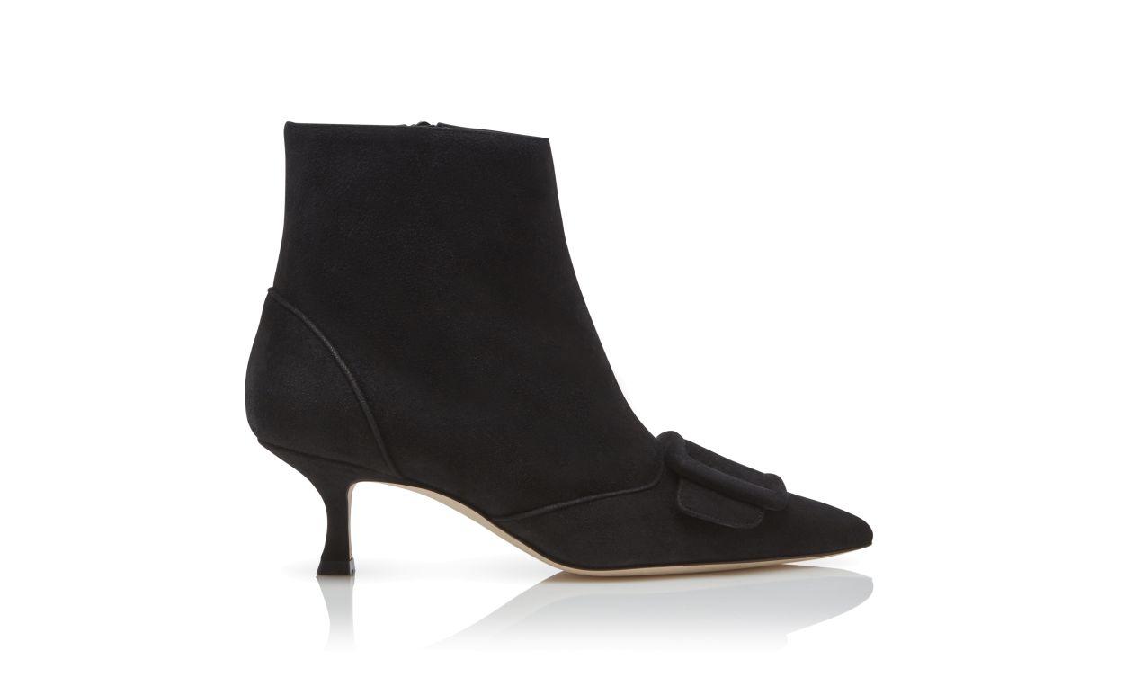 Black suede pointed toe ankle boots featuring decorative buckle detail, side zip closure and kitten heel.