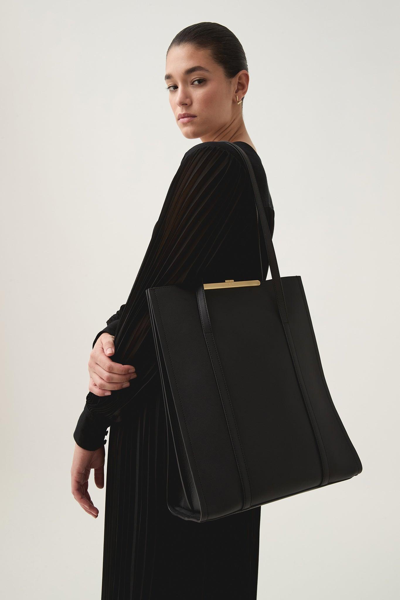 PRODUCT DETAILS Leather tote bag Dual top straps Gold bar with magnetised closure Folded side panel Vegan leather lining Shop All Accessories SIZE AND FIT Height: 39.5cm Width: 33cm Depth: 14cm FABRICATION Main: 100% Leather Lining: 100% PU
