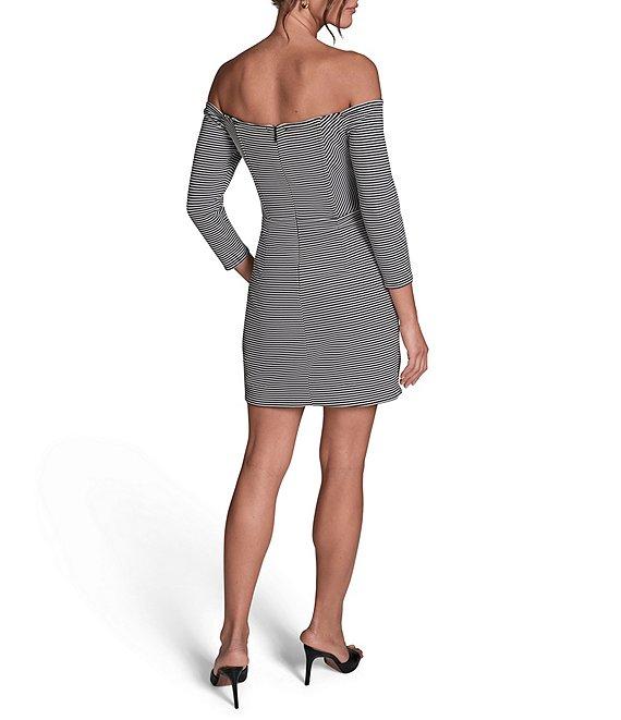 From BCBG, this dress features: Knit fabrication Sheath silhouette Off-the-shoulder neckline Long sleeves Stripe pattern Zip back closure Approx. 29" length Polyester Dry clean Imported.