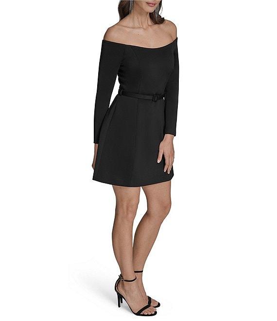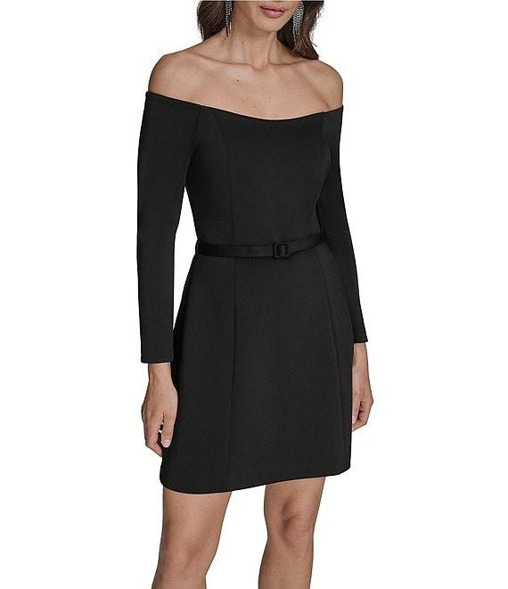 From BCBG, this dress features: Scuba crepe A line silhouette Off the shoulder neckline Long sleeves Attached belt with fabric Mini Zip back closure Approx. 28" length Polyester/spandex Dry clean Imported.