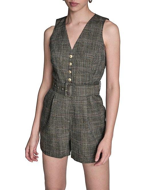 From BCBG, this romper features: Tweed fabrication Romper silhouette V-neckline Sleeveless Gold BCBG logo front buttons 2 side seam pockets on hips Zip back closure Approx. 3" inseam length Polyester/Recycled Polyester/Spandex Dry clean only Imported.