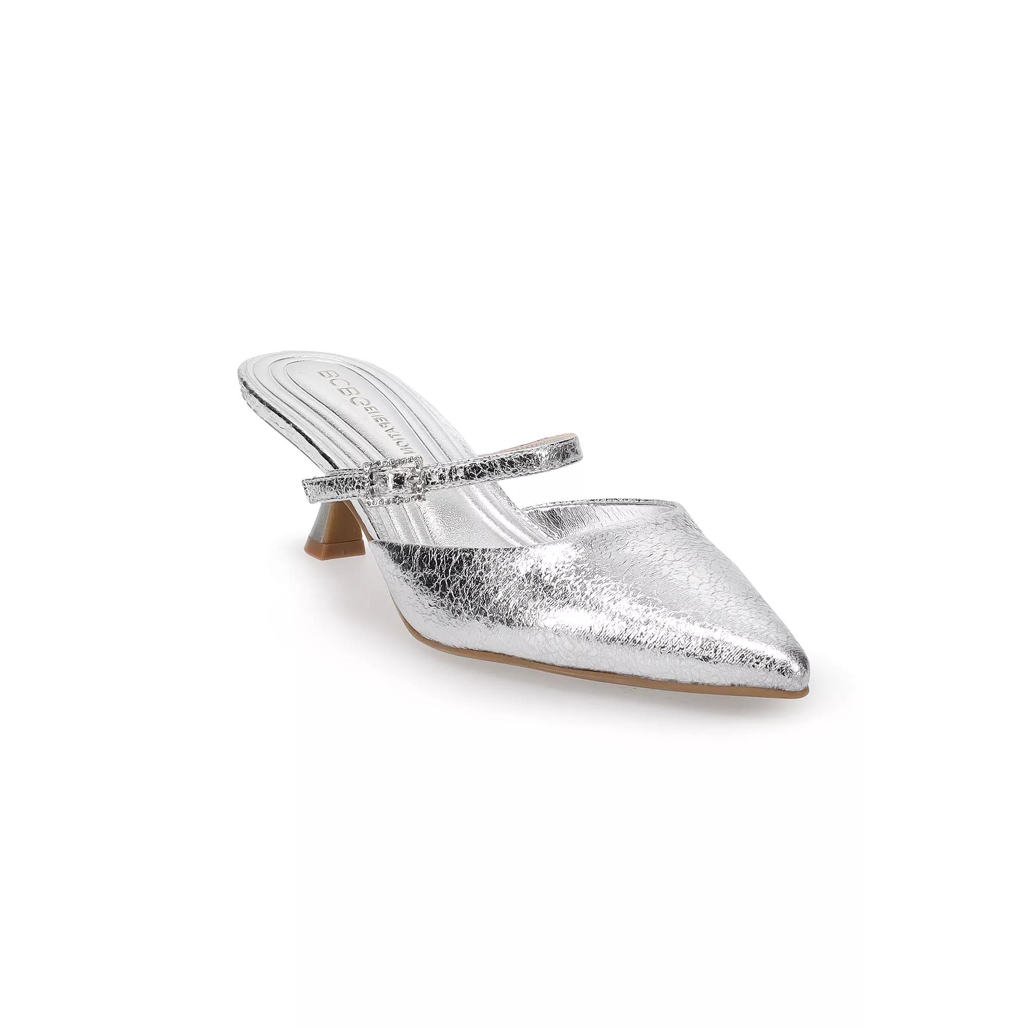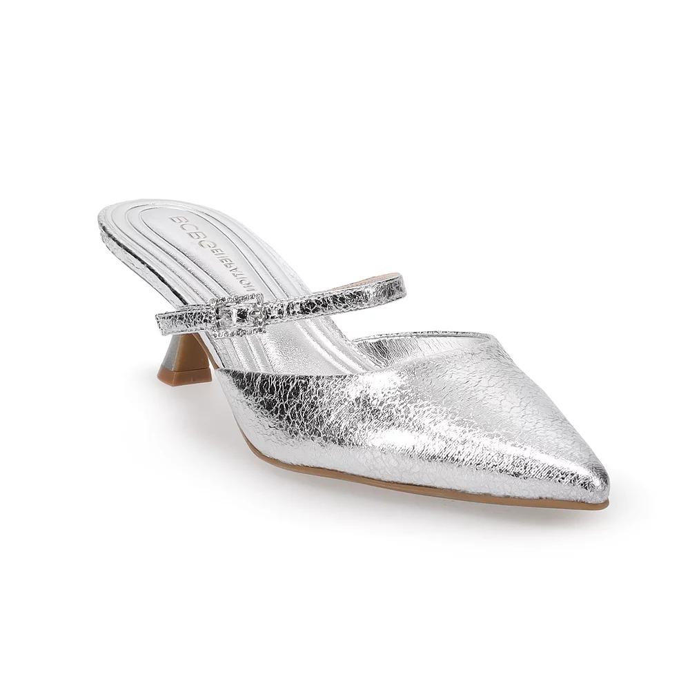 Dress up any look with these BCBGeneration Kalista Womens Kitten Heel Slide On Pumps. Click this FOOTWEAR GUIDE to find the perfect fit and more! Dress up any look with these BCBGeneration Kalista Womens Kitten Heel Slide On Pumps. Click this FOOTWEAR GUIDE to find the perfect fit and more! FEATURES Kitten heel Buckle detail Slip-on for easy on and offDETAILS Synthetic upper, lining, midsole and outsole Pointed toe Slip-on 2-in. heel Spot clean Imported Size: 9. Color: Silver. Gender: female. Age Group: adult.