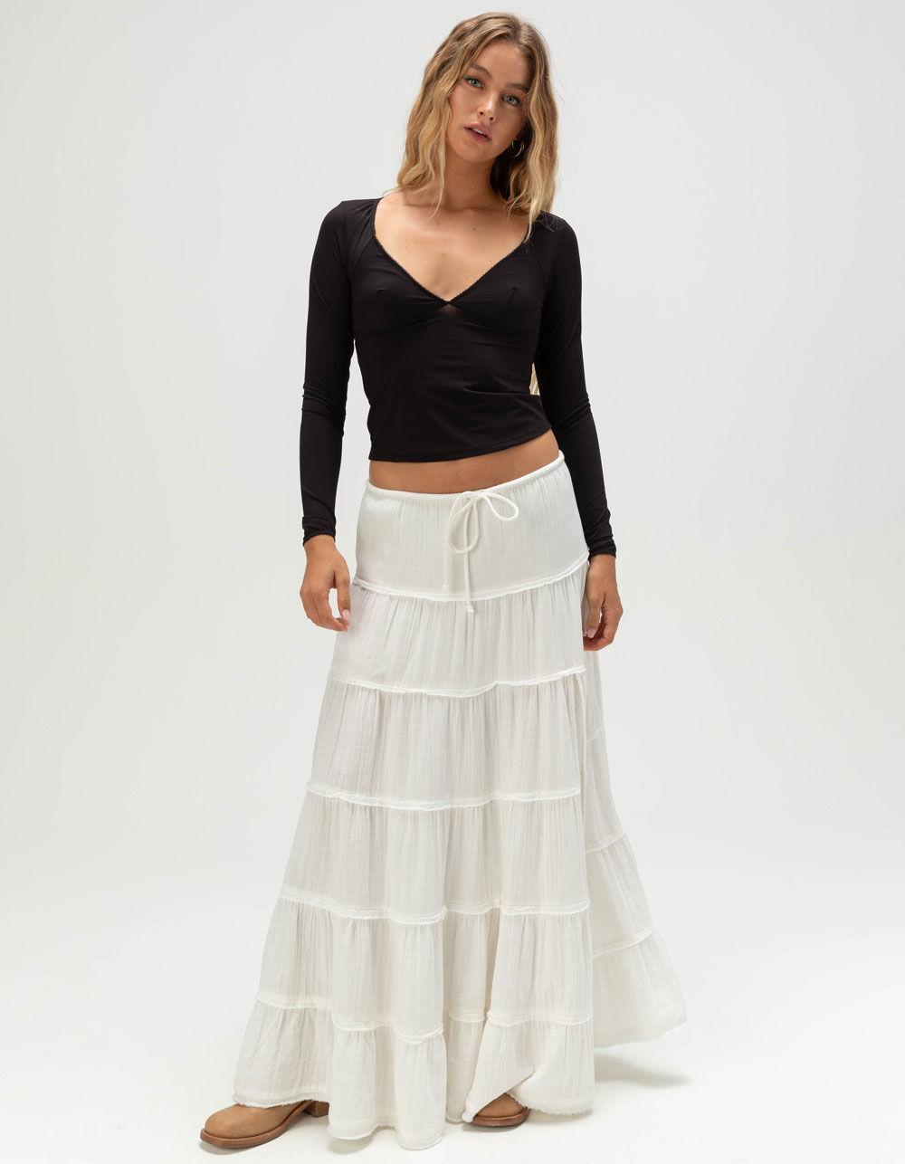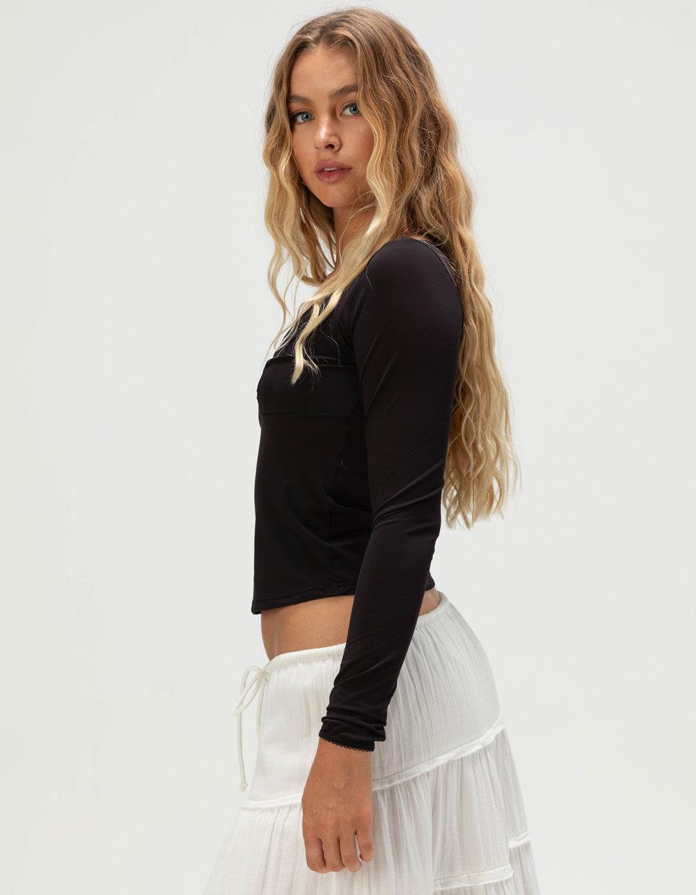 BLACK. BDG Urban Outfitters Je T'aime Womens Long Sleeve Crop Top. The BDG Je T’aime Long Sleeve Crop Top delivers a romantic edge to your everyday wardrobe with its sleek, semi-sheer black fabric and flattering cropped silhouette. Designed with a soft V-neckline adorned with delicate picot trim, this top adds a subtle touch of femininity to any outfit. The bust is thoughtfully lined for coverage, while the long sleeves and body remain sheer for a layered, lightweight look. Perfect for pairing with high-waisted jeans or skirts, this versatile piece transitions effortlessly from day to night. 75% Polyamide 25% Elastane. Machine wash. Imported.