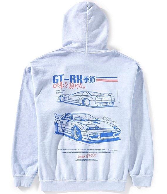 From BDG Urban Outfitters, this hoodie features: Attached hood Long sleeves Front kangaroo pocket "GT-RX" verbiage, a car graphic, and other wording screen printed on the back Square hem Pullover construction Cotton/polyester fleece Machine wash/line dry Imported.