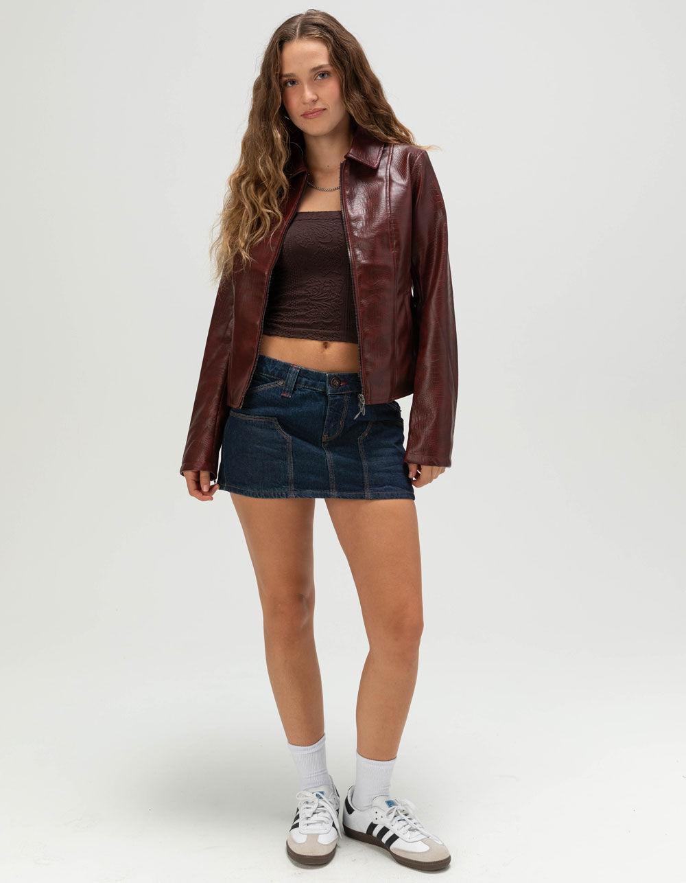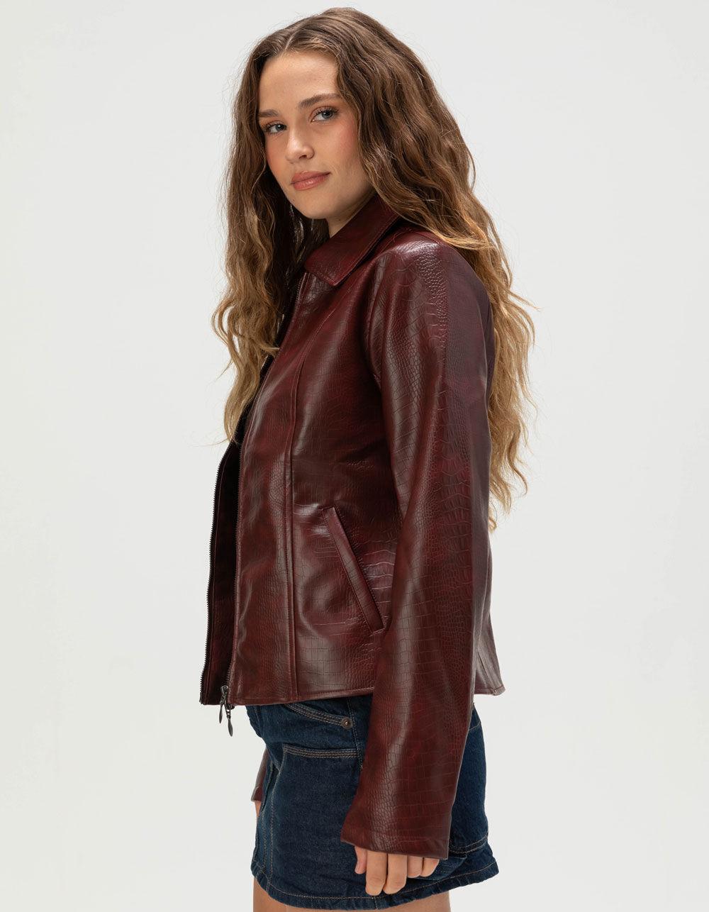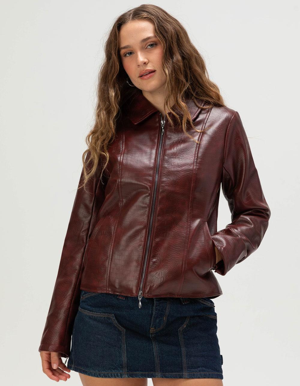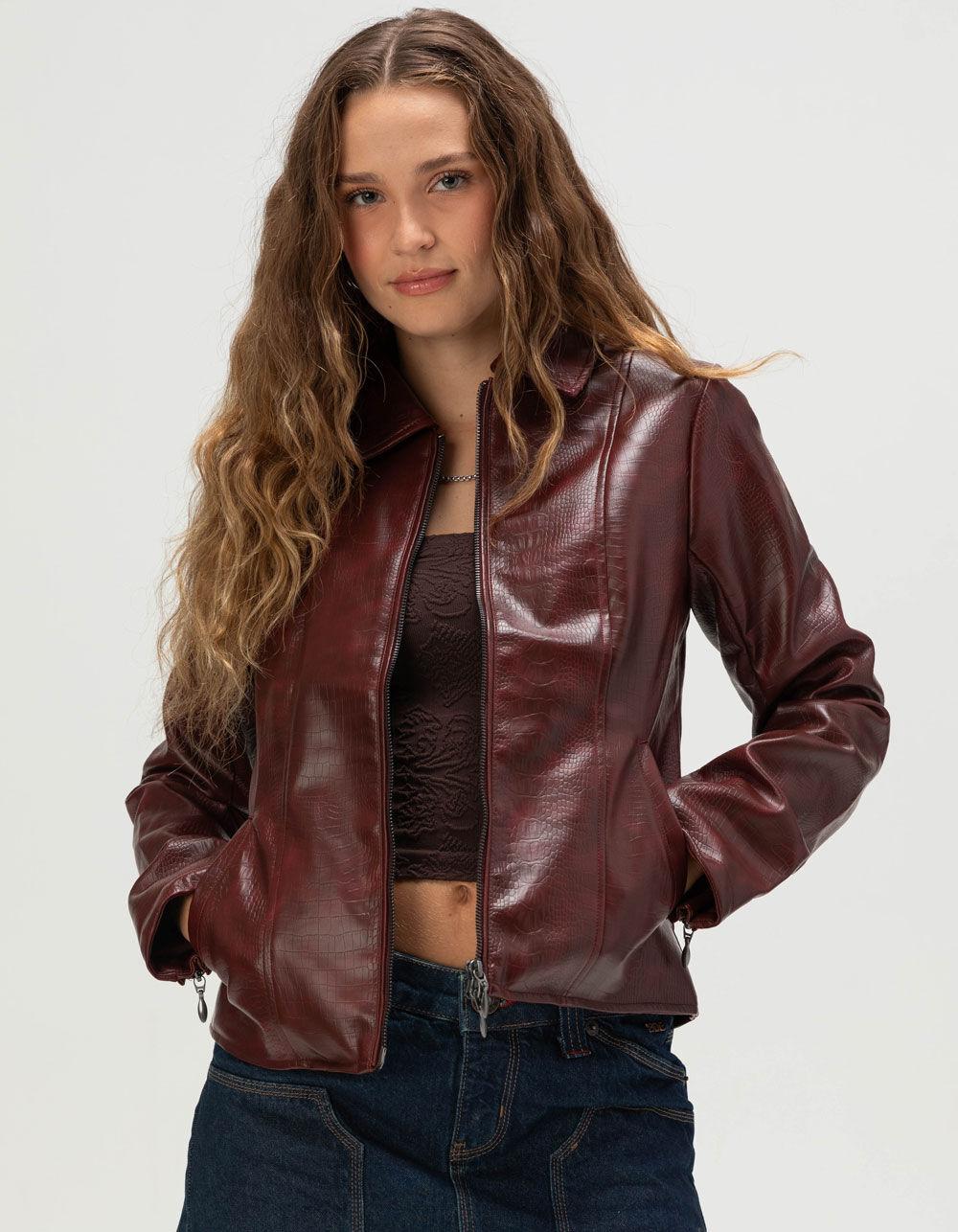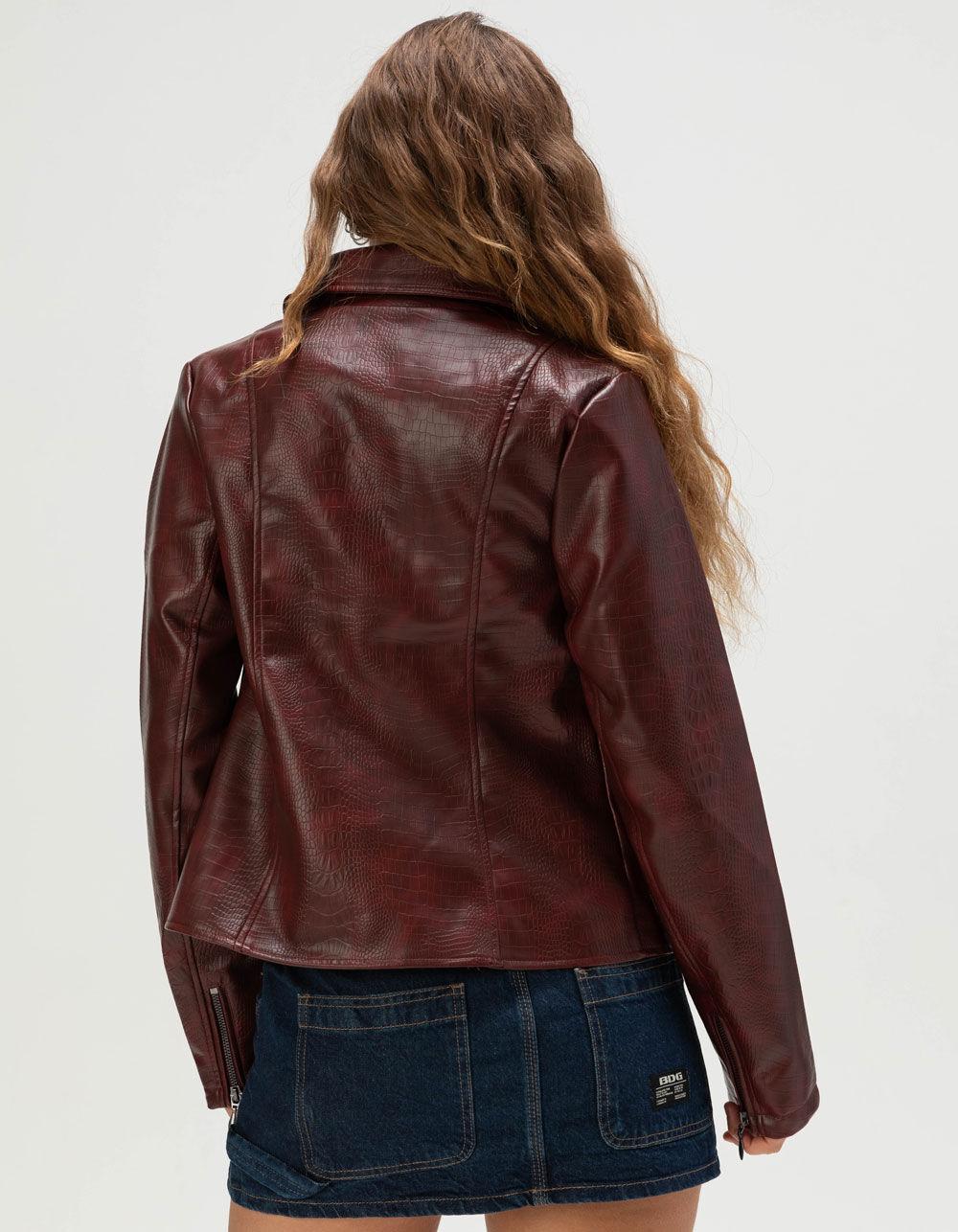 BDG Urban Outfitters Fitted Faux Leather Jacket. Faux leather jacket with textured finish. Slant front pockets. Zip-up front closure. Collar neck. Long sleeves with zip cuffs. Lined. Polyurethane. Lining: 100% Polyester. Machine wash. Imported.