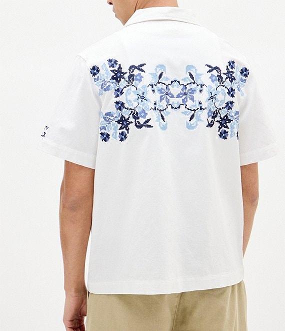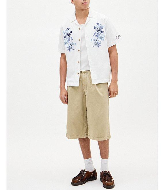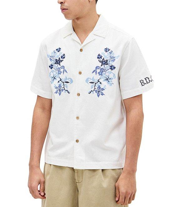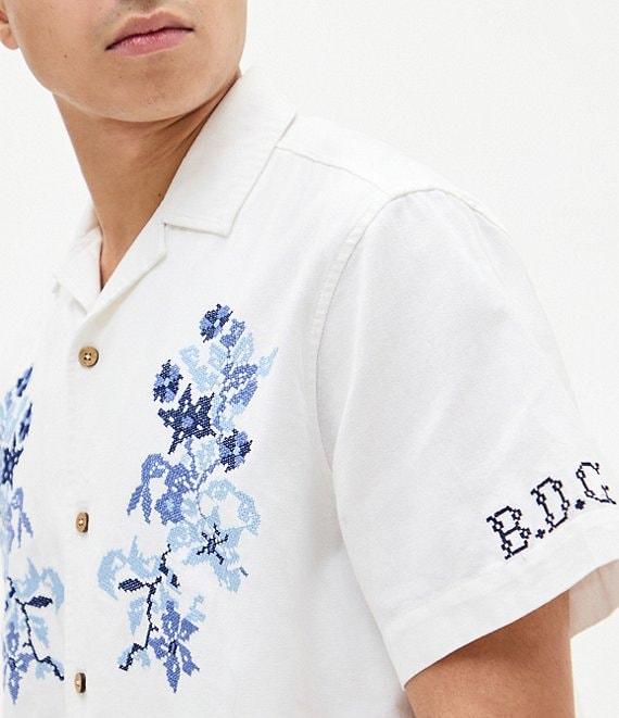 From BDG Urban Outfitters, this shirt features: Camp collar Short sleeves Embroidery floral Button closure Square hem Cotton Machine wash/line dry Imported.