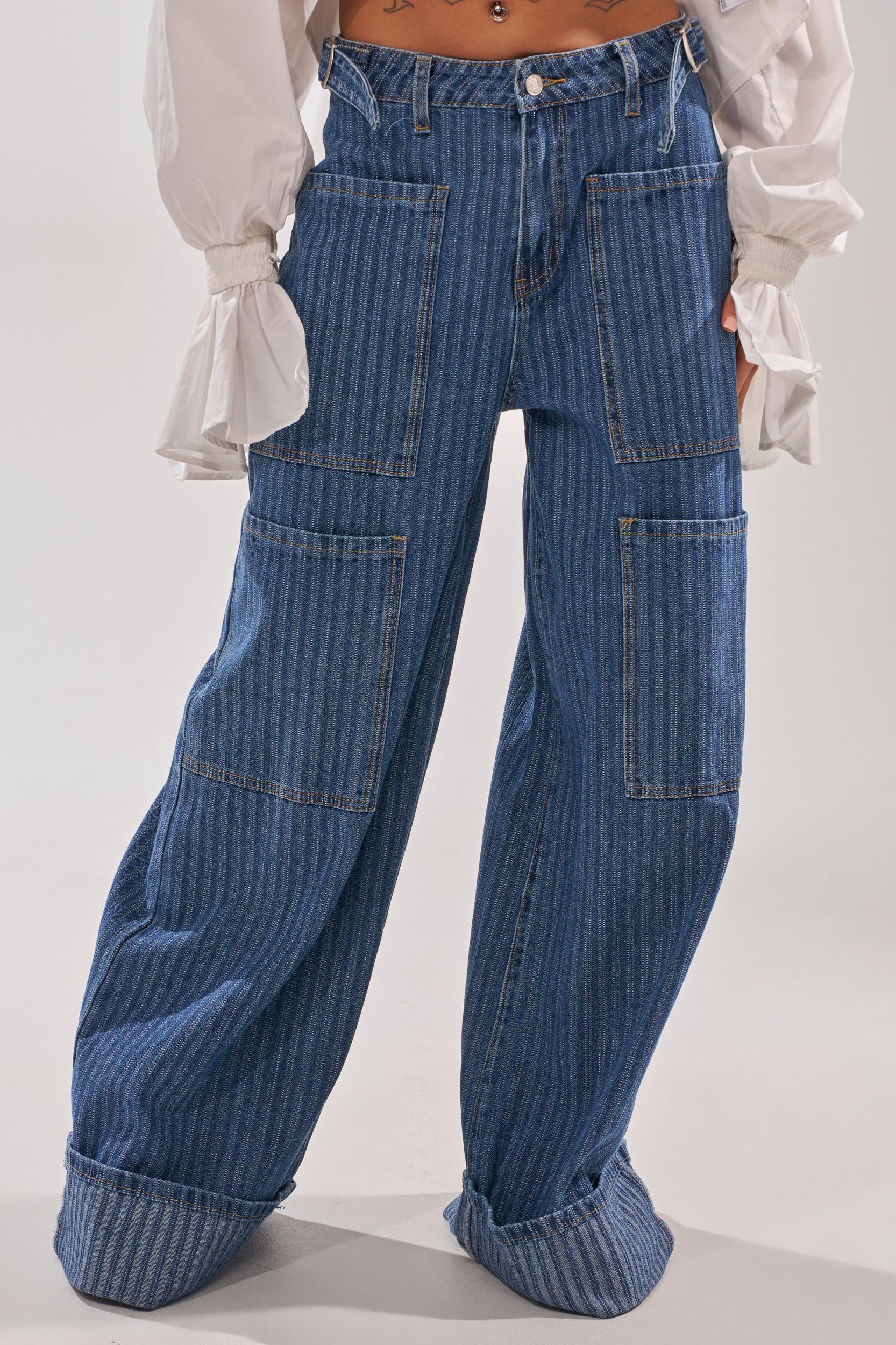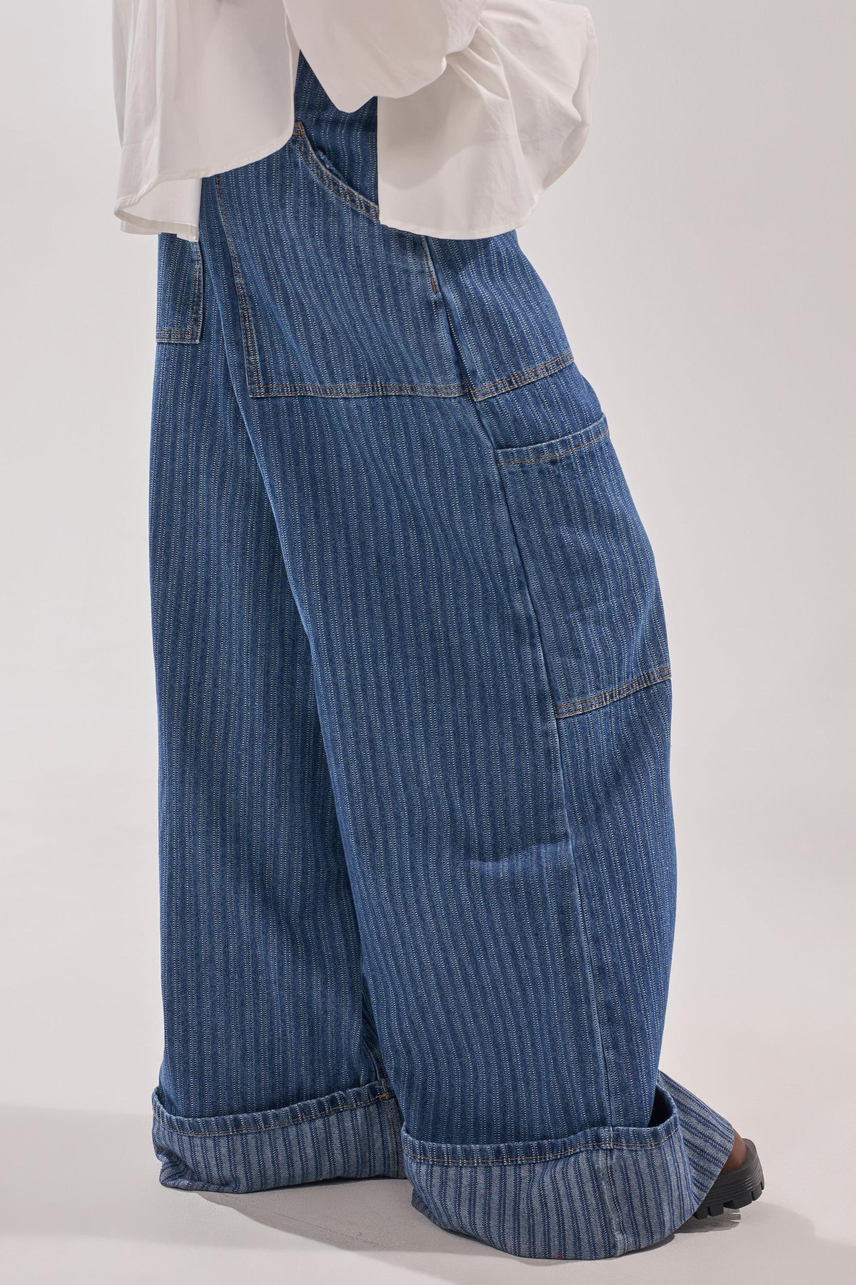 This relaxed wide-leg denim pant is crafted from structured cotton denim in a dark wash blue colorway with subtle vertical stripe detailing. It features a high-rise waist, functional belt loops, adjustable buckled straps on each side of the waist for a customizable fit, oversized patch pockets at the front and back for a utilitarian-inspired finish, cuffed hems, and a button-and-zip front closure. Perfect for pairing with fitted tops, cropped jackets, or statement heels for a modern, fashion-forward denim look. - 70% Cotton 15% Polyester 15% Viscose- No Stretch- Imported (all measurements approximate from size small)- 12” Rise- 31” Inseam- Model is 5’7” and is wearing size smallProduct ID: 1072103 (all measurements approximate from size 1X)- 14” Rise- 31” InseamProduct ID: 1072107