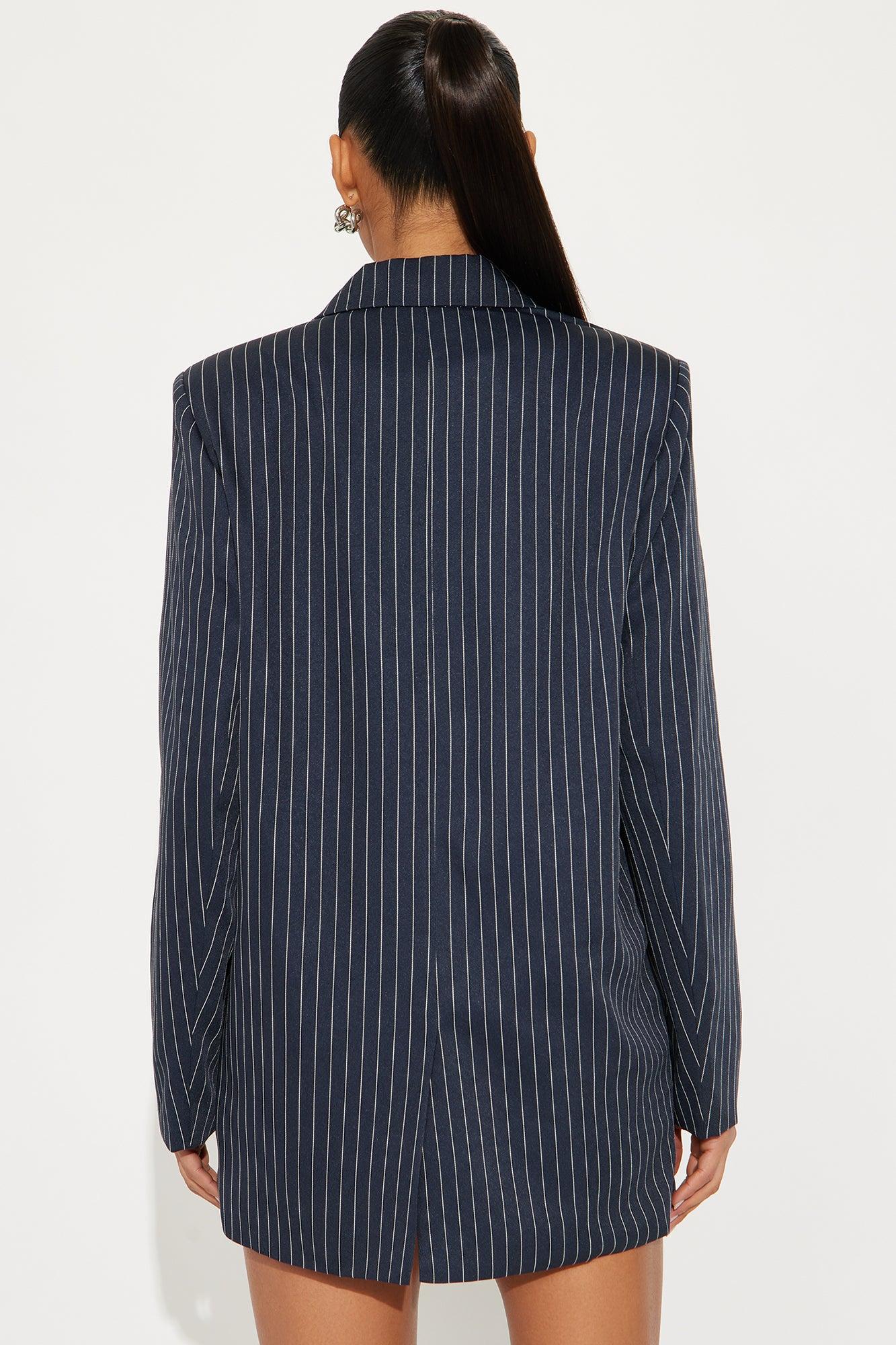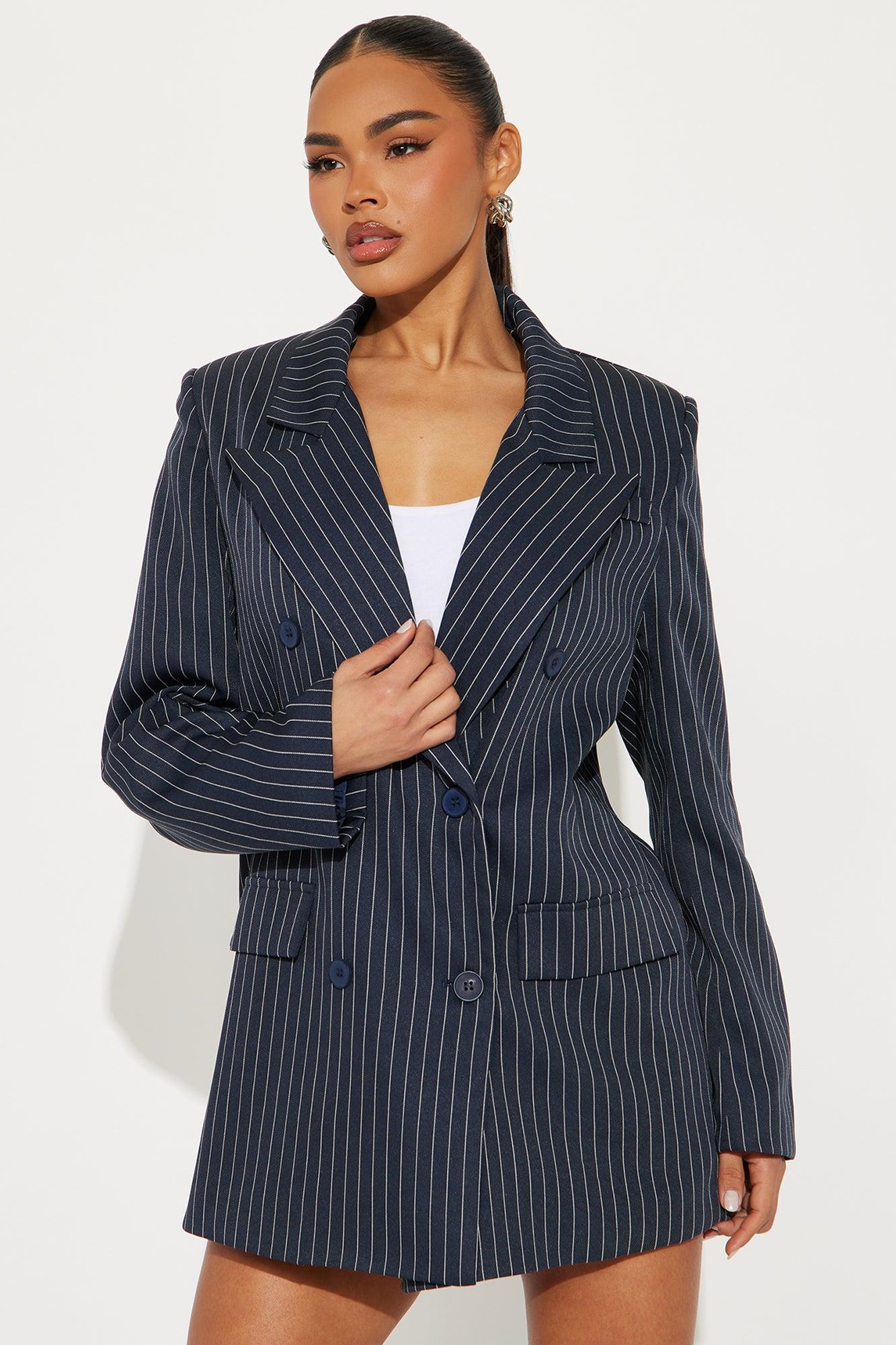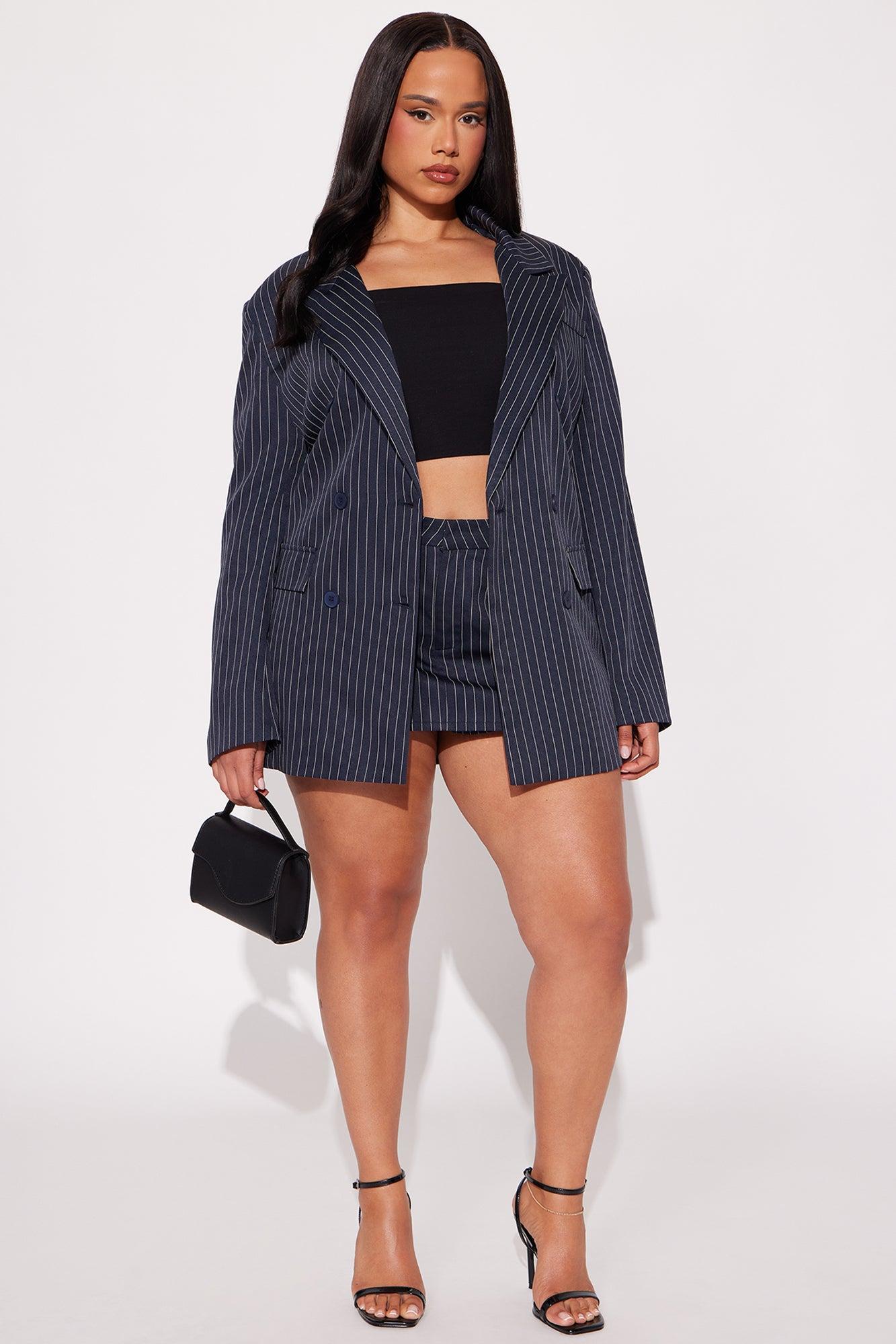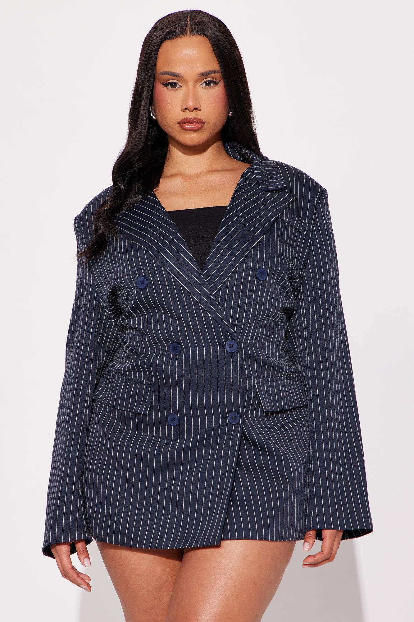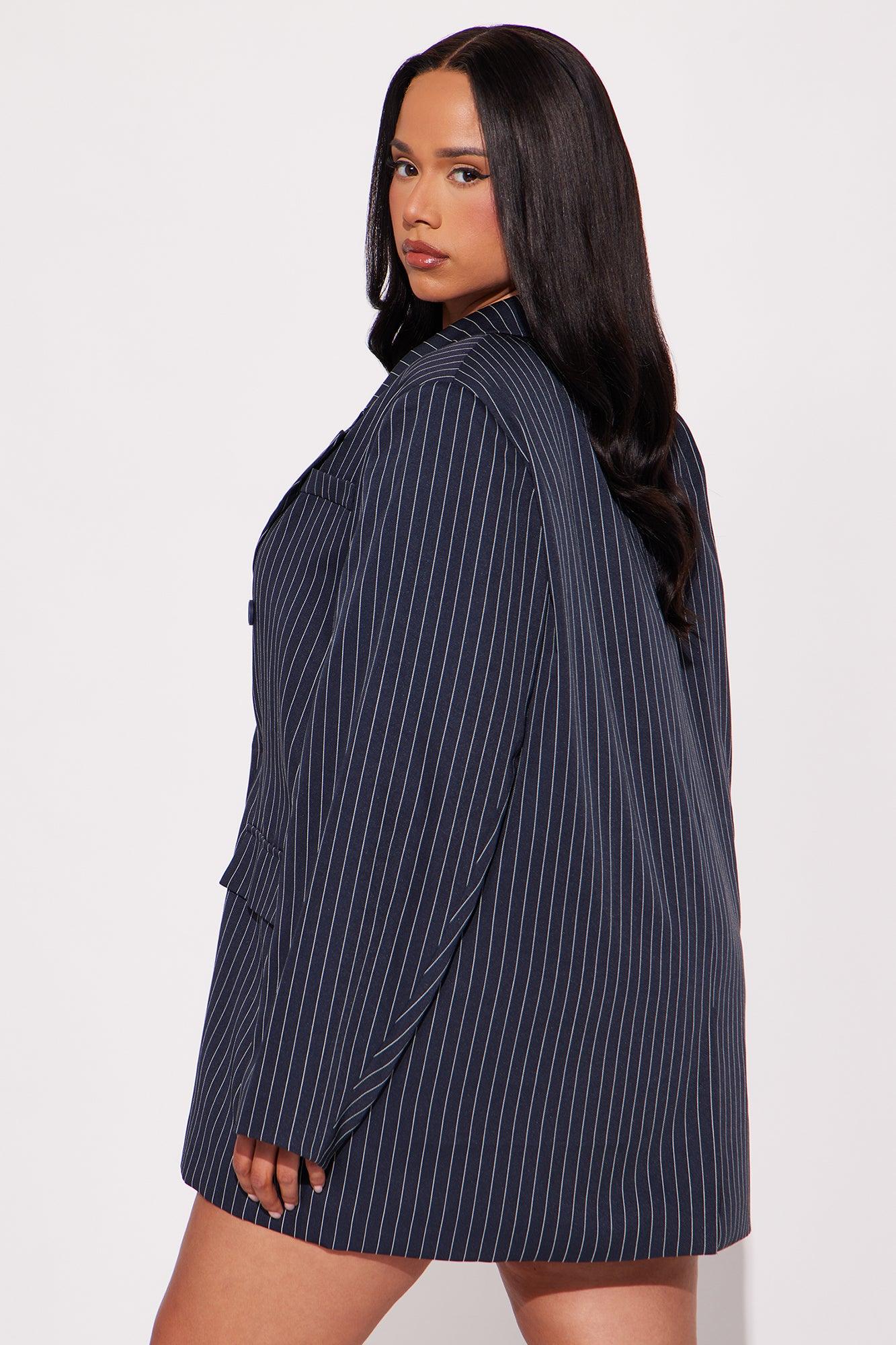 Available In Navy. Blazer Lapel Collar Long Sleeve Button Closure Pinstripe Pockets Fully Lined Pair With "Be Yourself Trouser Pinstripe Skort Main: 97% Polyester 3% Rayon Lining: 100% Polyester Imported California Proposition 65WARNING: Cancer and Reproductive Harm - www.P65Warnings.ca.gov.