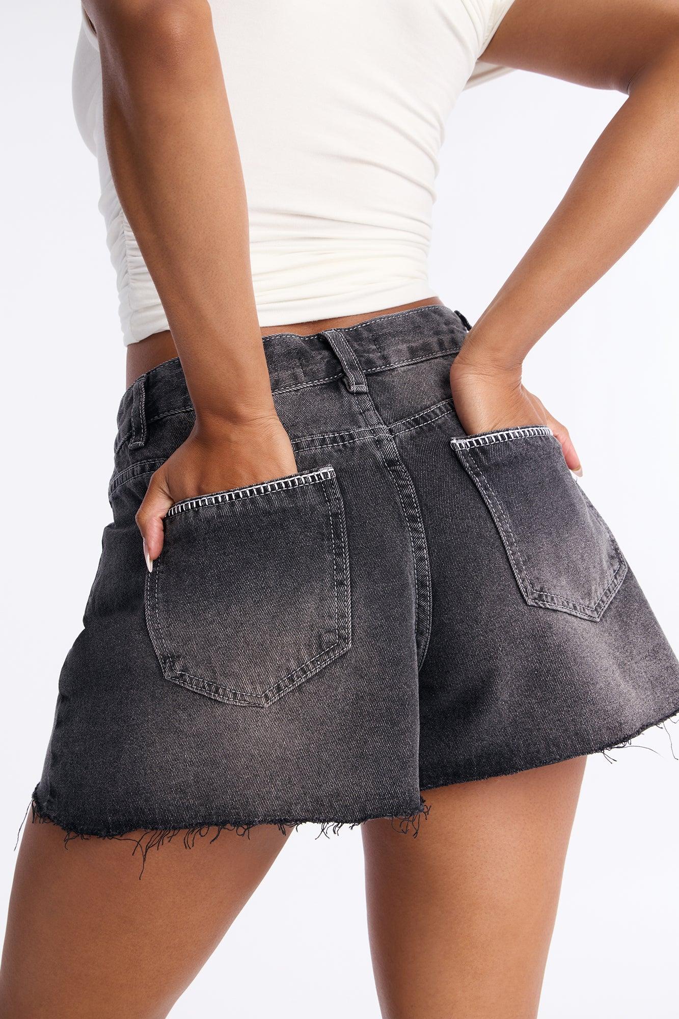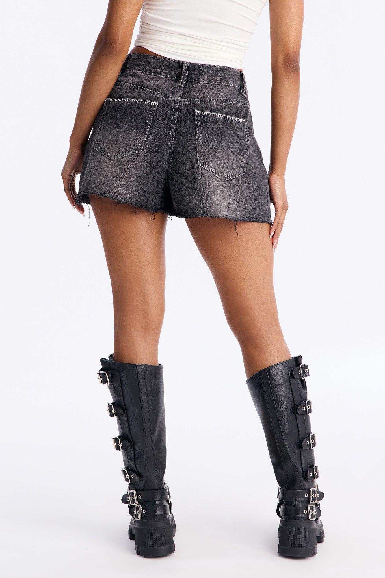 Available In Black Wash. Denim Short 5 Pocket A-Line Fit Cut Off Fray Hem Whipstitch Detail 11.5" High Rise 2.5" Inseam Non Stretch Disclaimer: To Keep The Aesthetic Of This Garment, Please Follow The Care Instructions Carefully. Self: 80% Cotton 13% Viscose 5% Polyester 2% Modal Imported